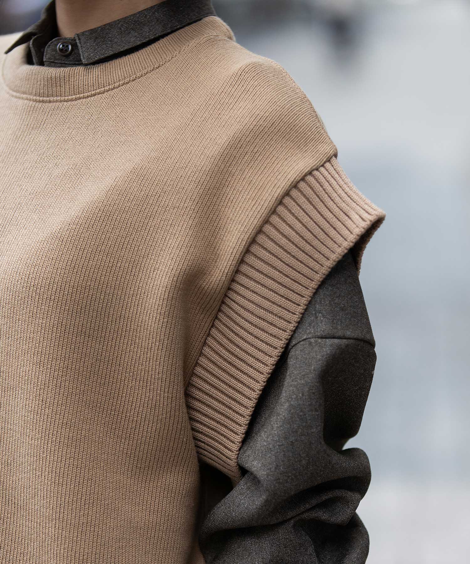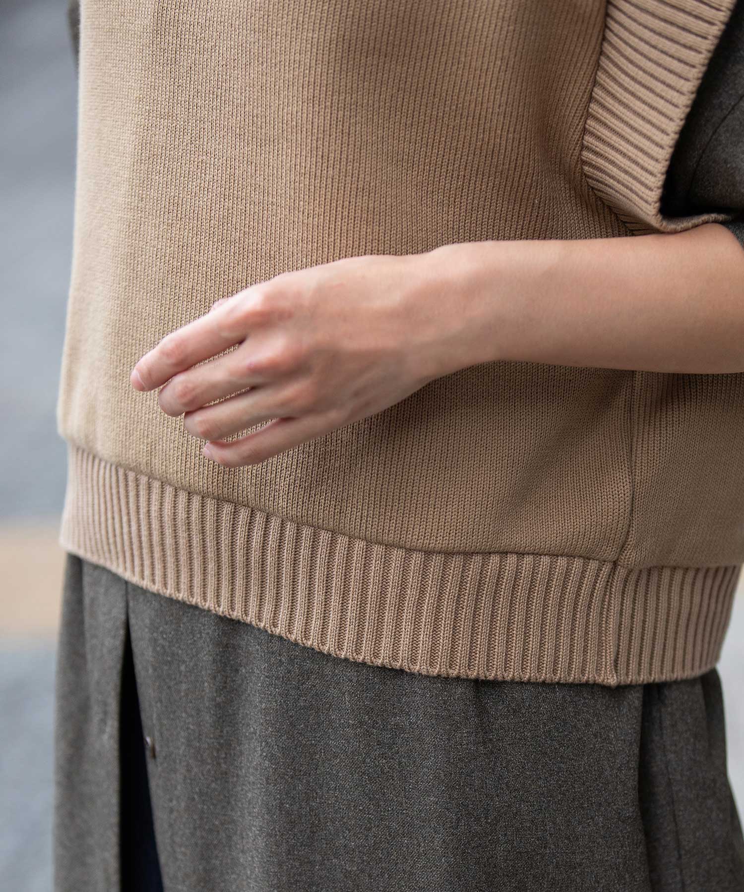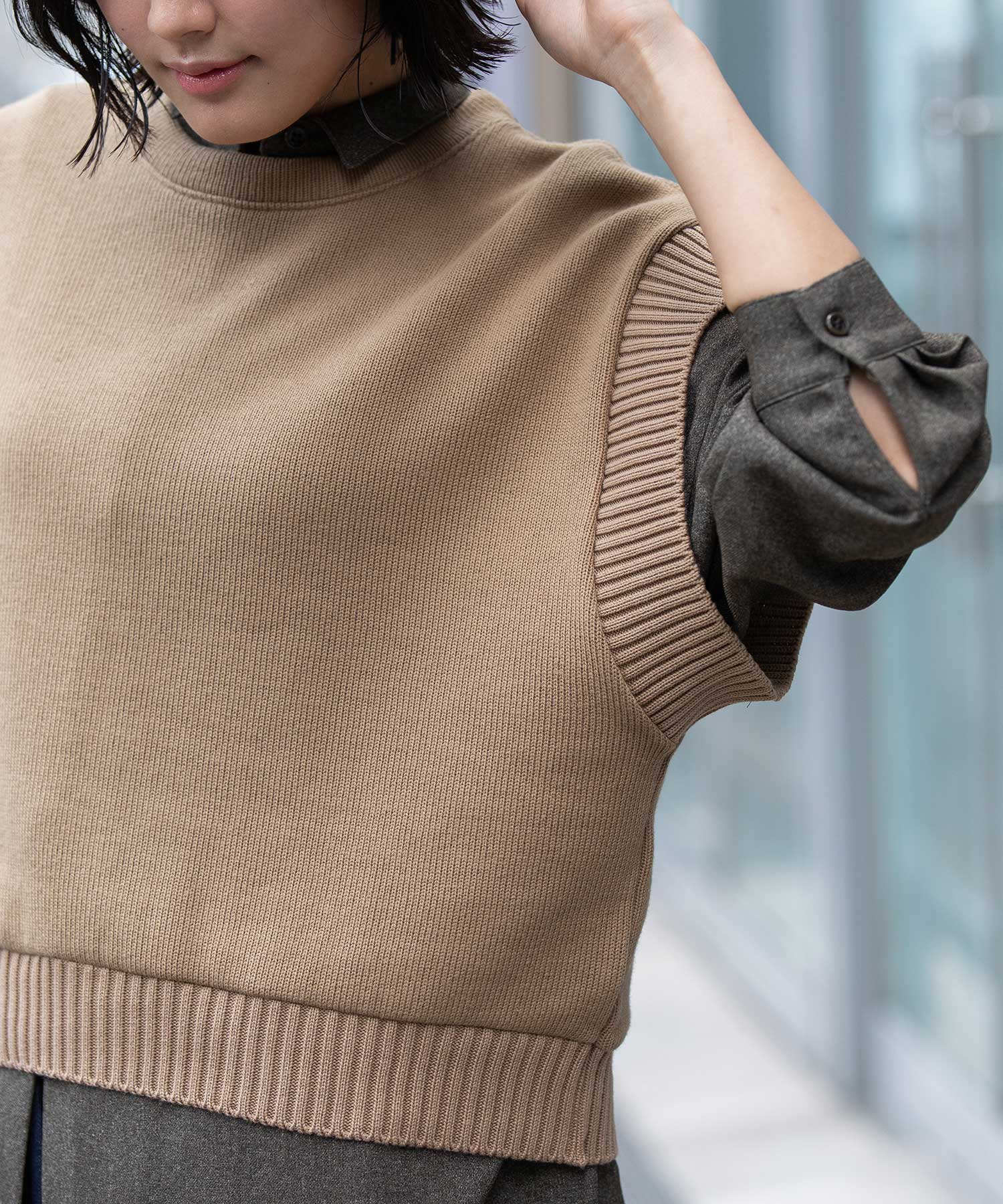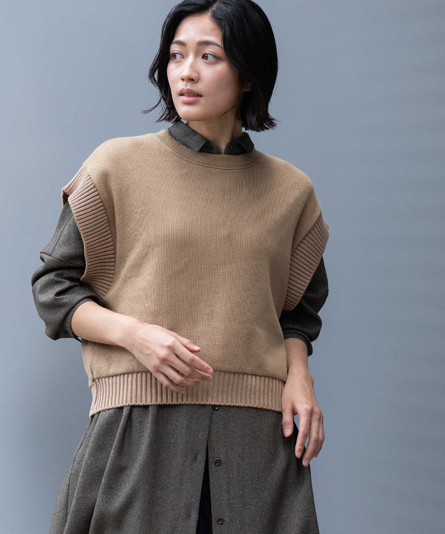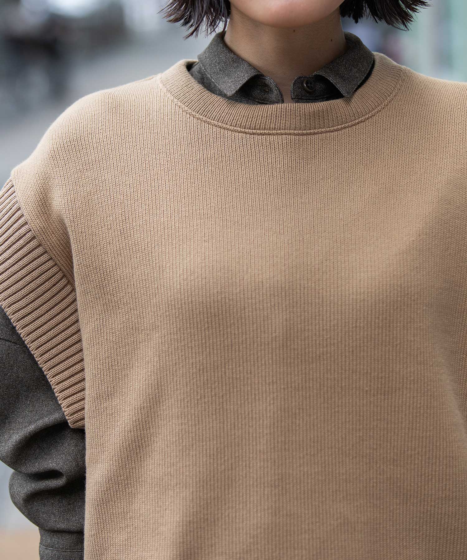 二の腕が気にならないくらいのノースリーブなので、シンプルなロンTに重ねたり、シアーインナーやリブインナーに重ねたりとレイヤードを楽しめるアイテムですが、素材がALLコットンなので、Tシャツやタンクトップに重ねて着用すればオールシーズン使えます。