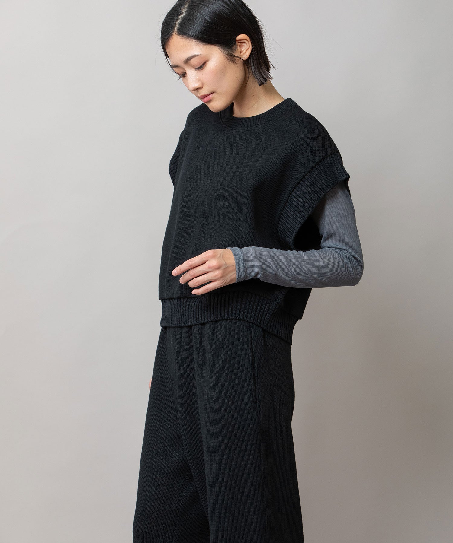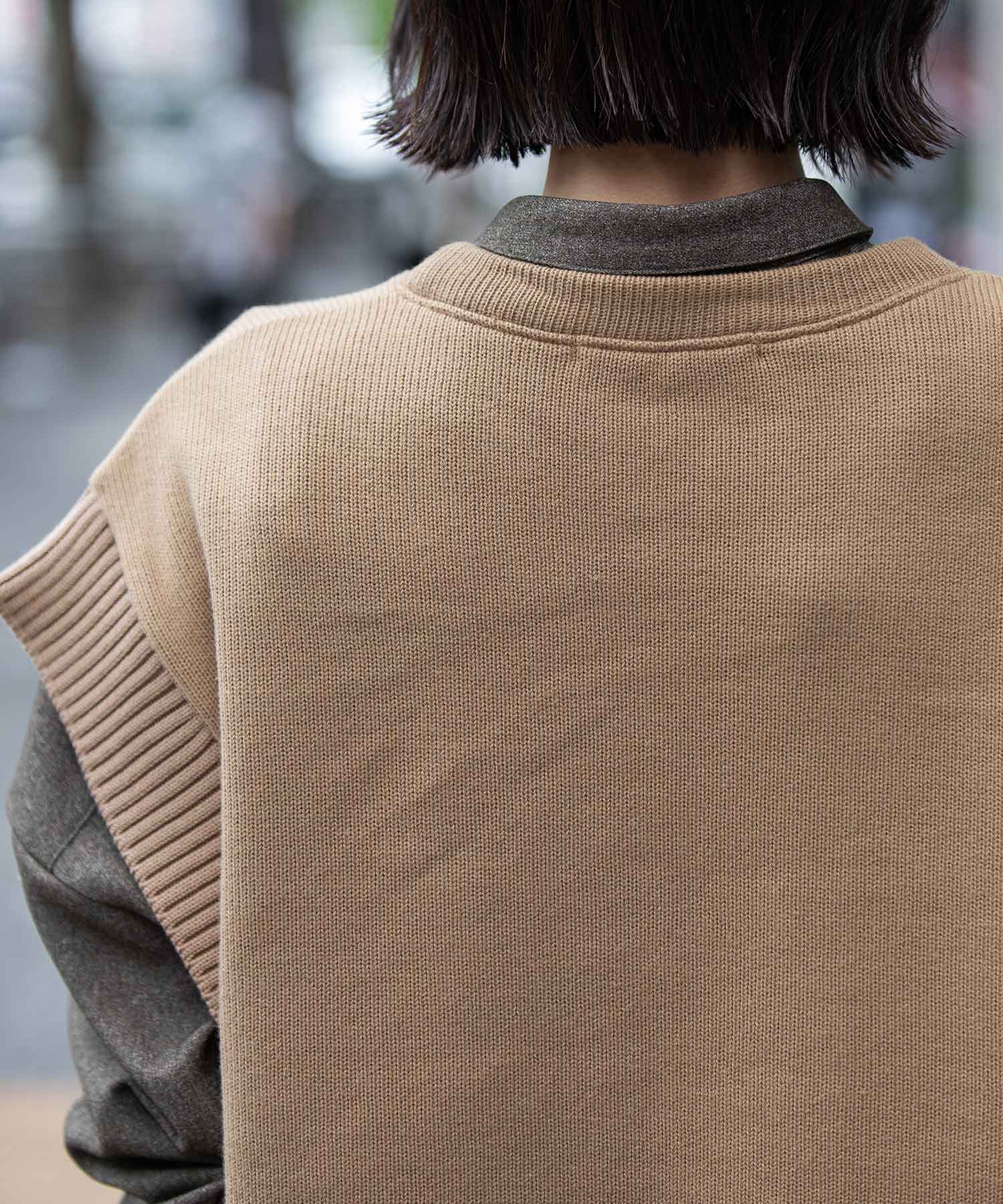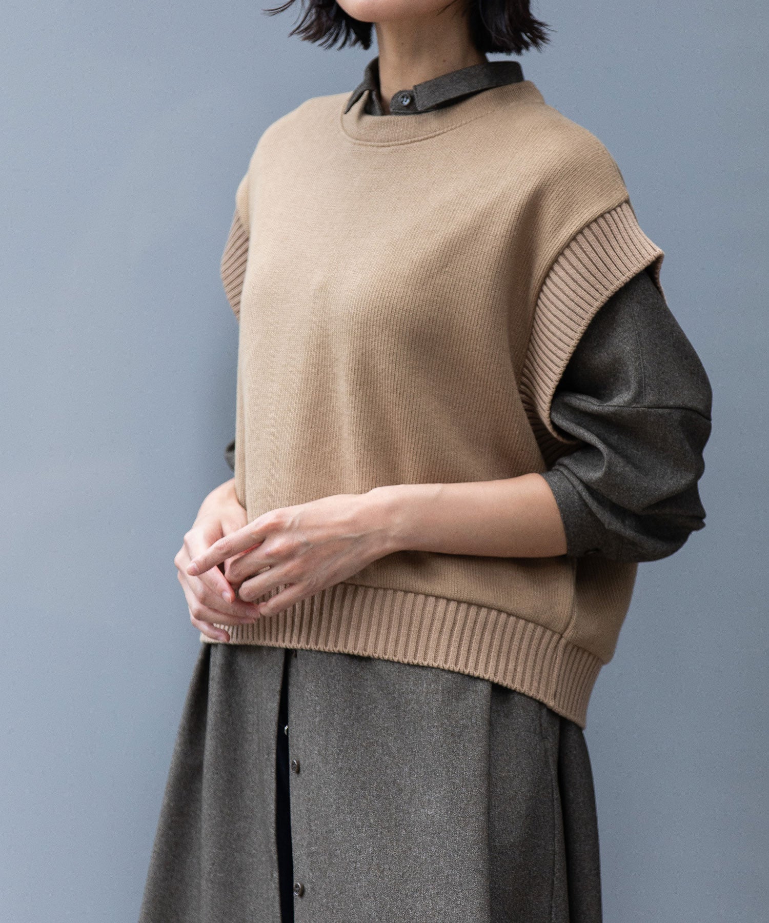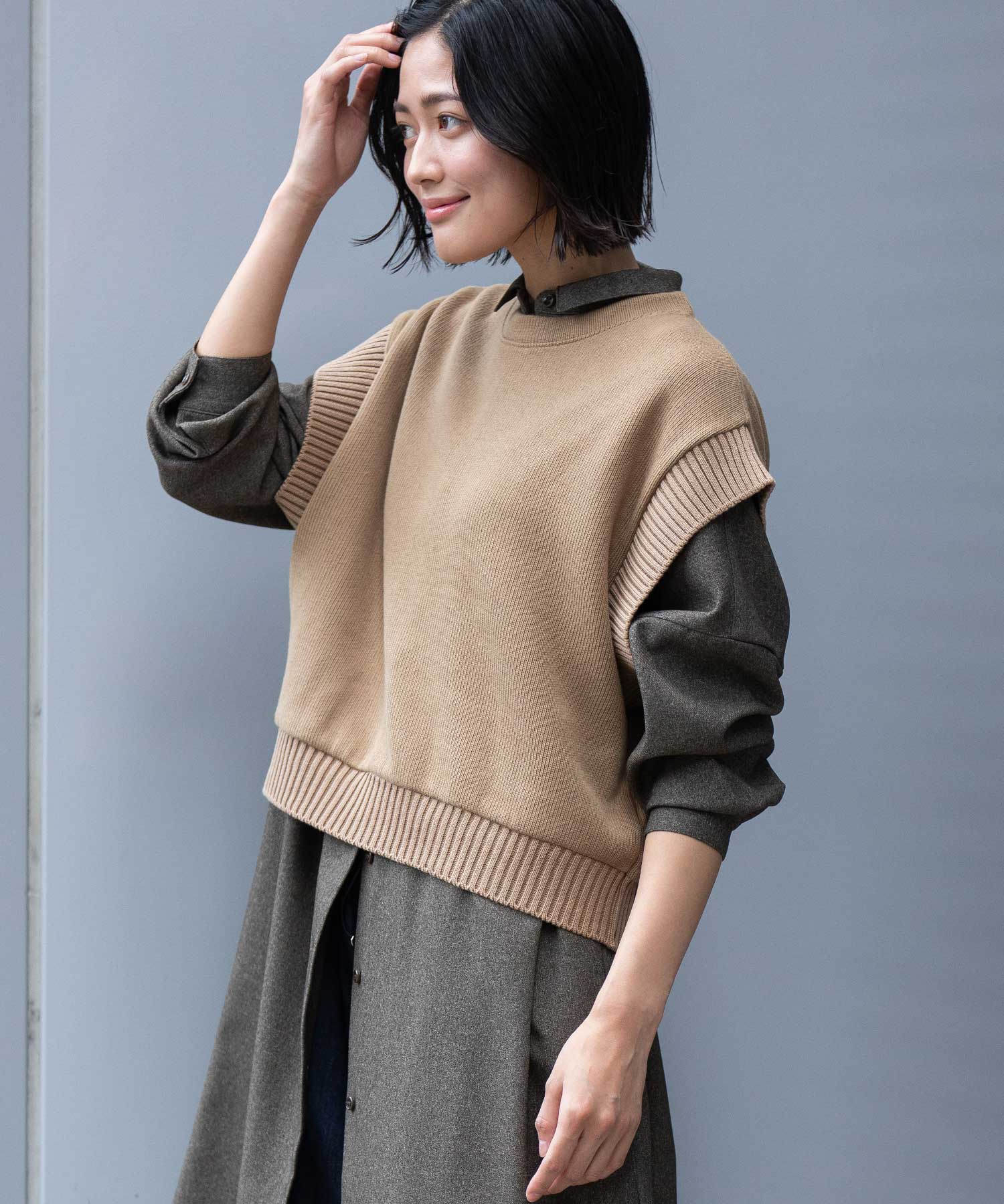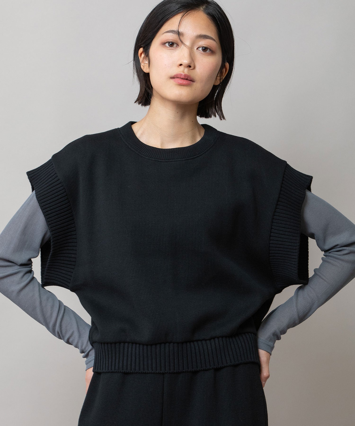 二の腕が気にならないくらいのノースリーブなので、シンプルなロンTに重ねたり、シアーインナーやリブインナーに重ねたりとレイヤードを楽しめるアイテムですが、素材がALLコットンなので、Tシャツやタンクトップに重ねて着用すればオールシーズン使えます。