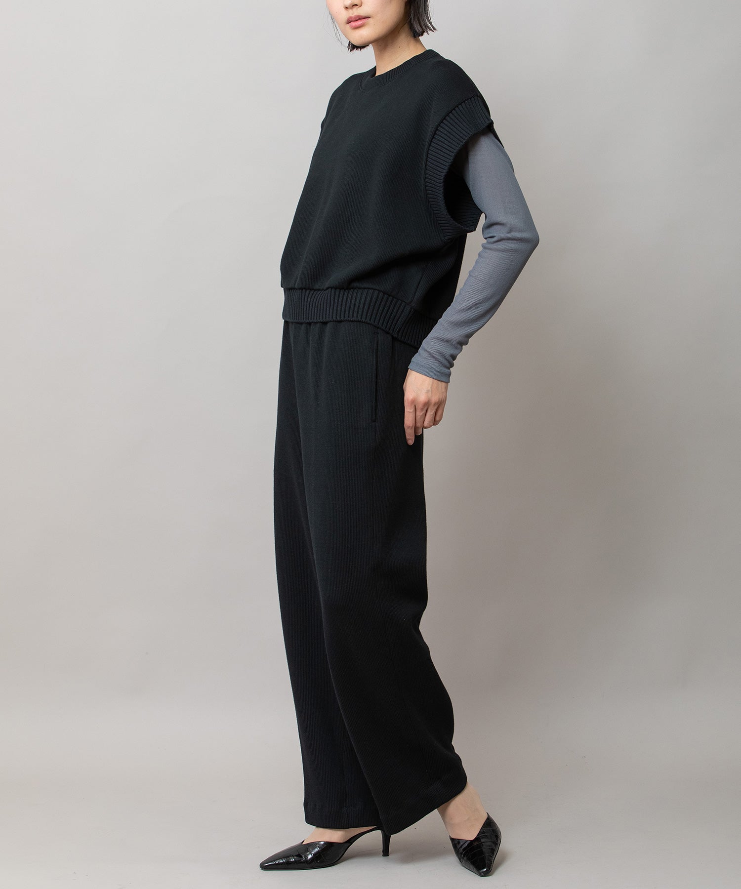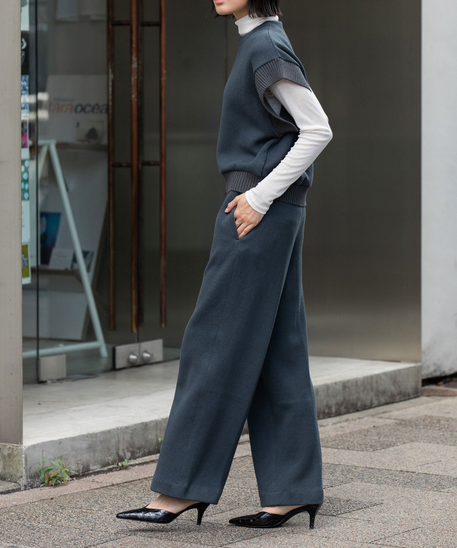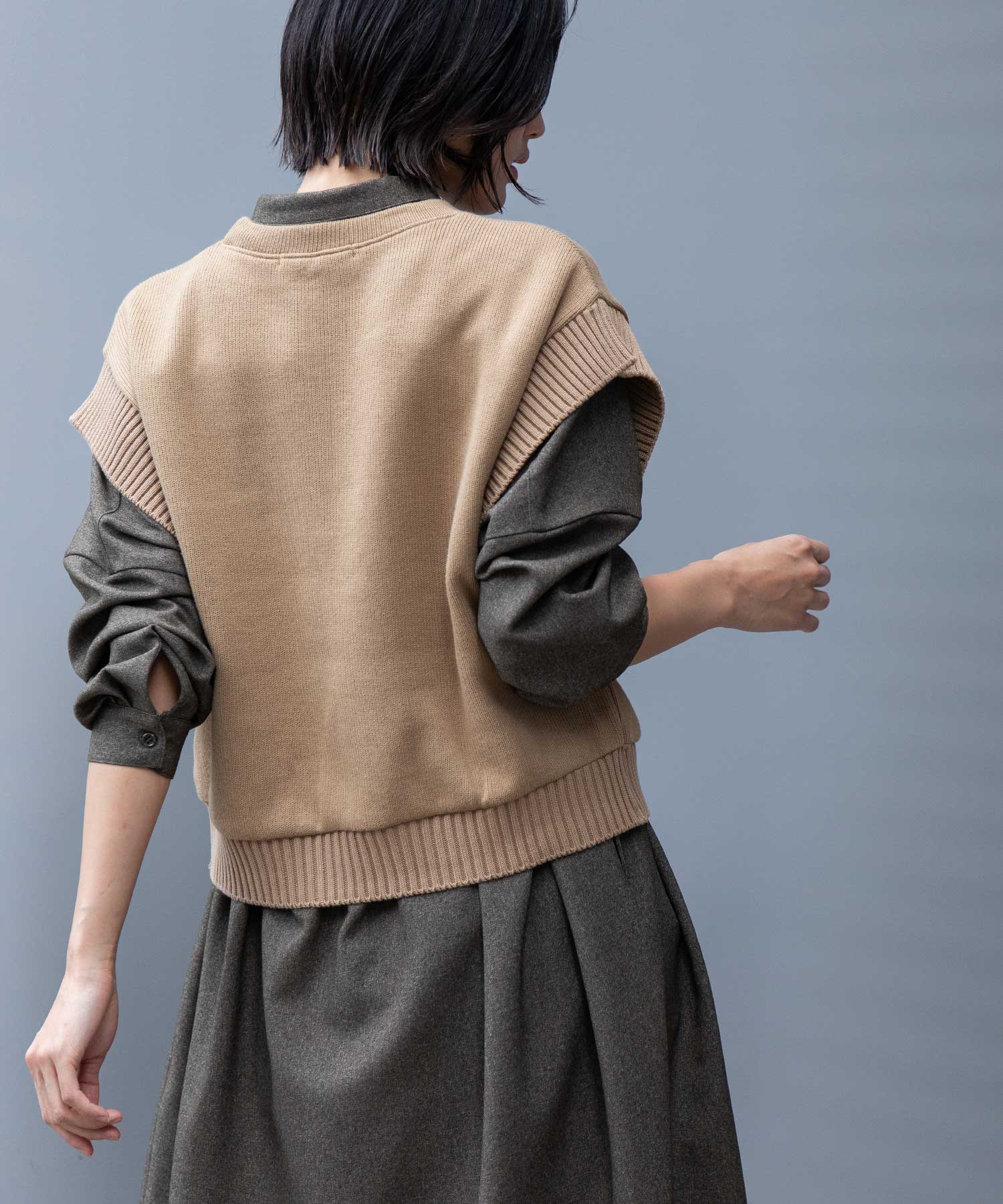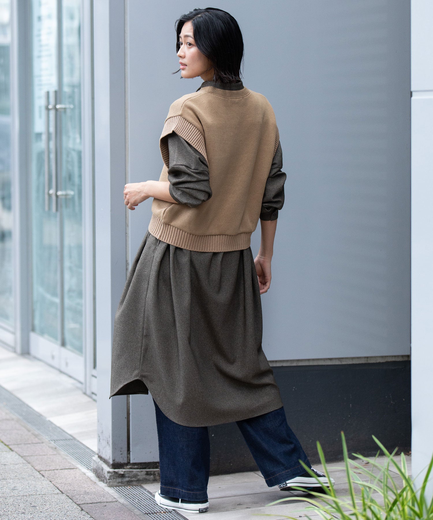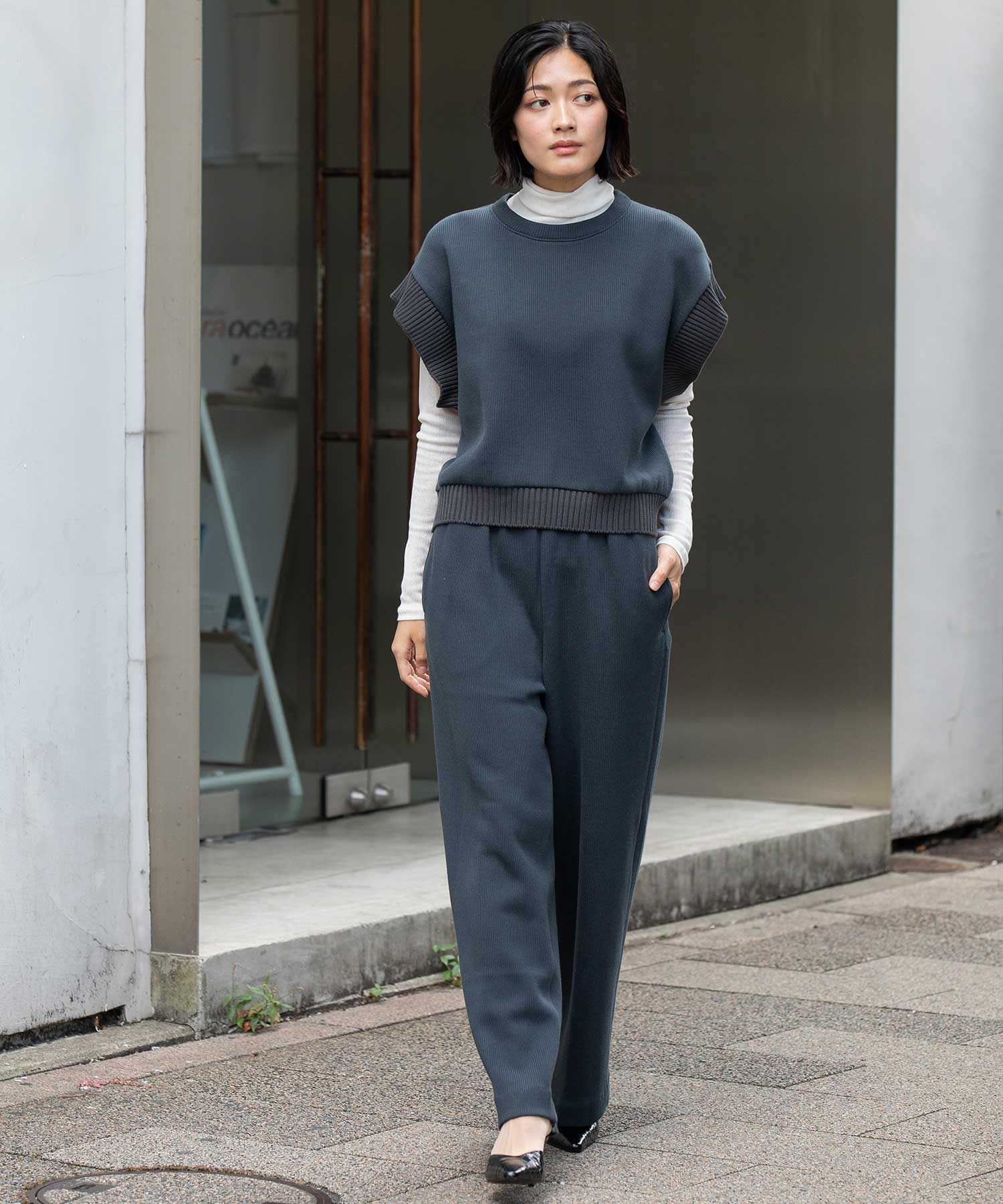 ざっくりとした表面ながら、編み立てのニットと比較すると伸びにくくだれにくいので、きれいなシルエットを長く保てるのがポイント。
