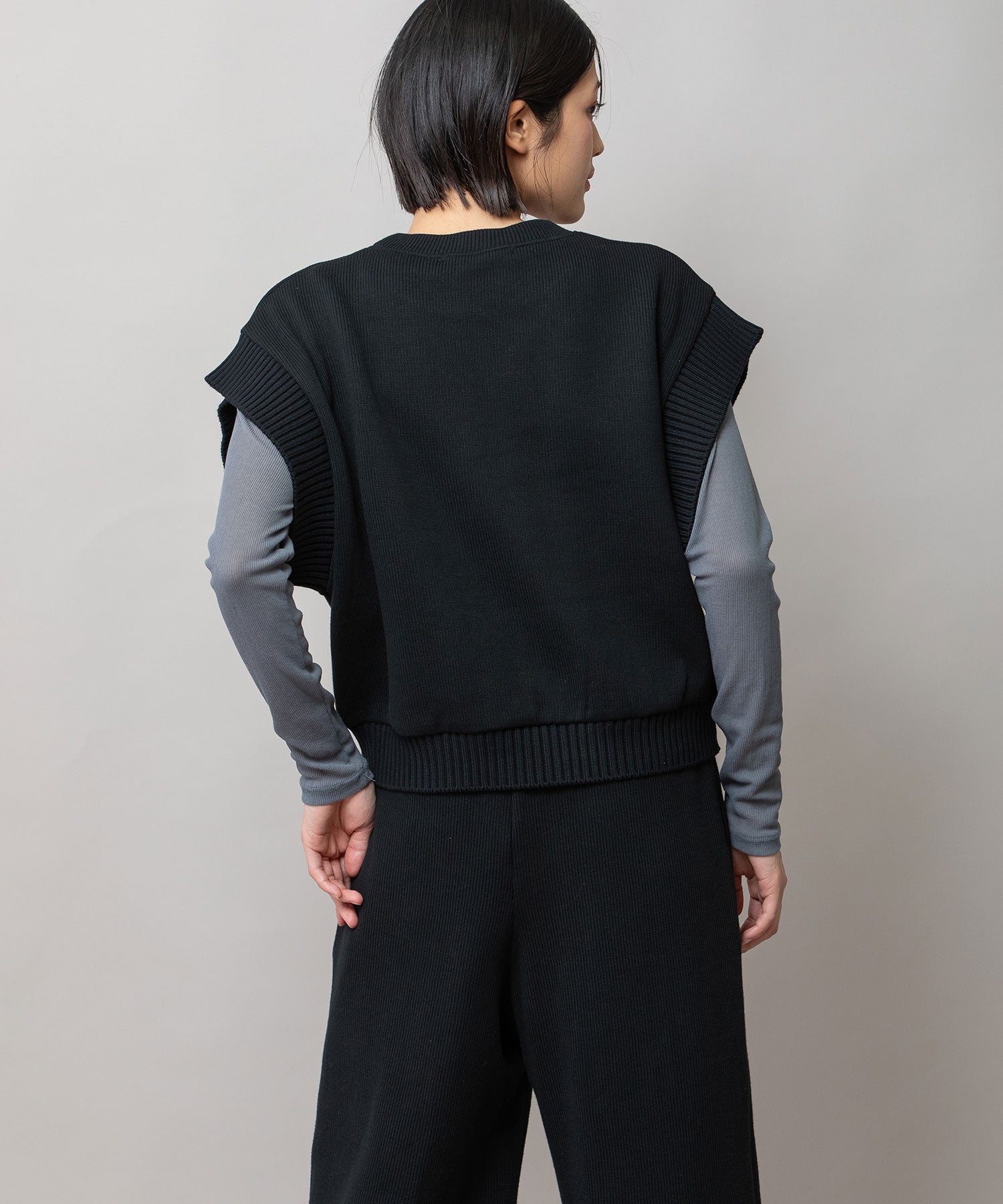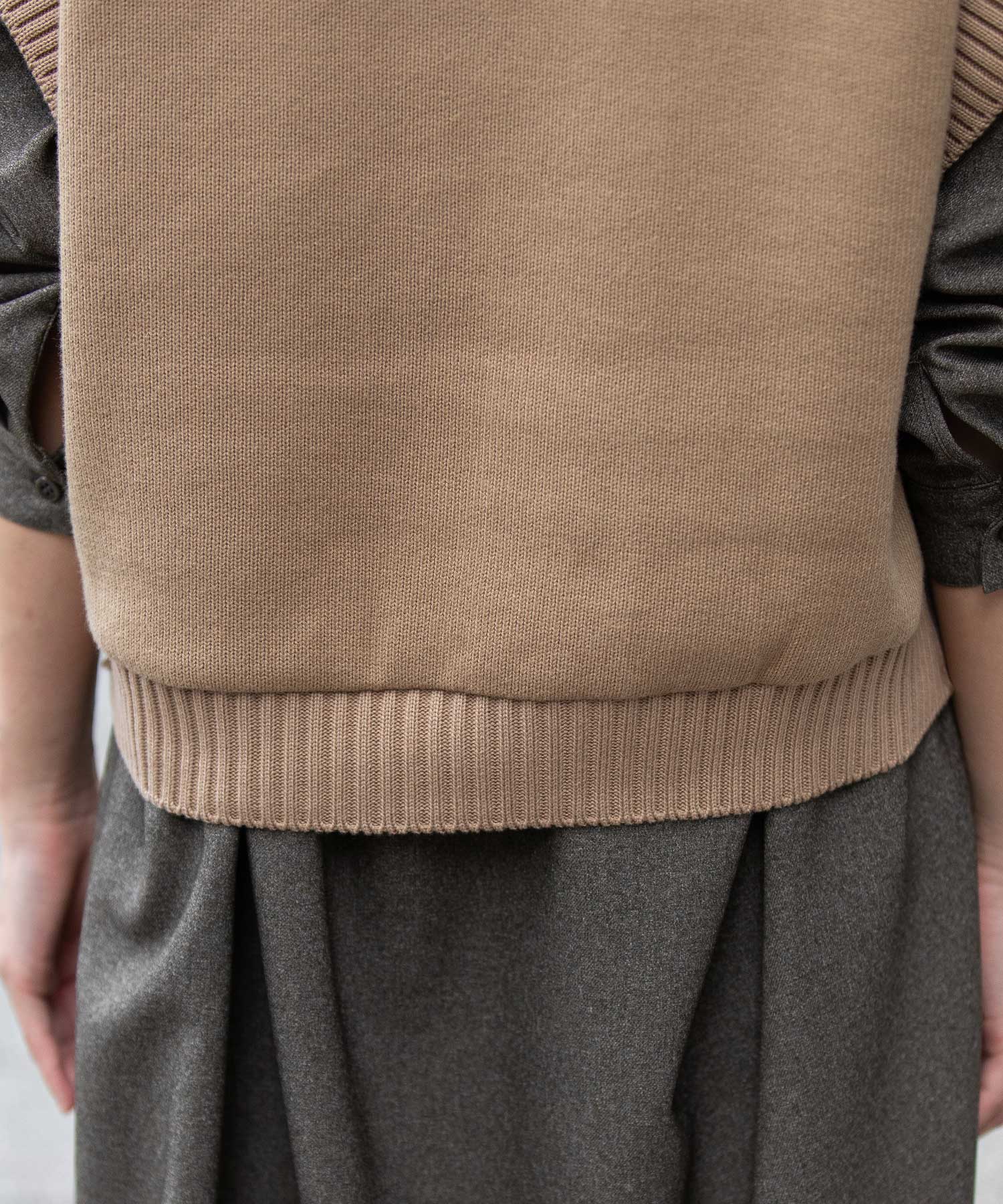 表側のニット天竺の様な表面感とのコントラストを付ける為、7GGの2x2リブで編み立てリブのラインを強調するデザインに。