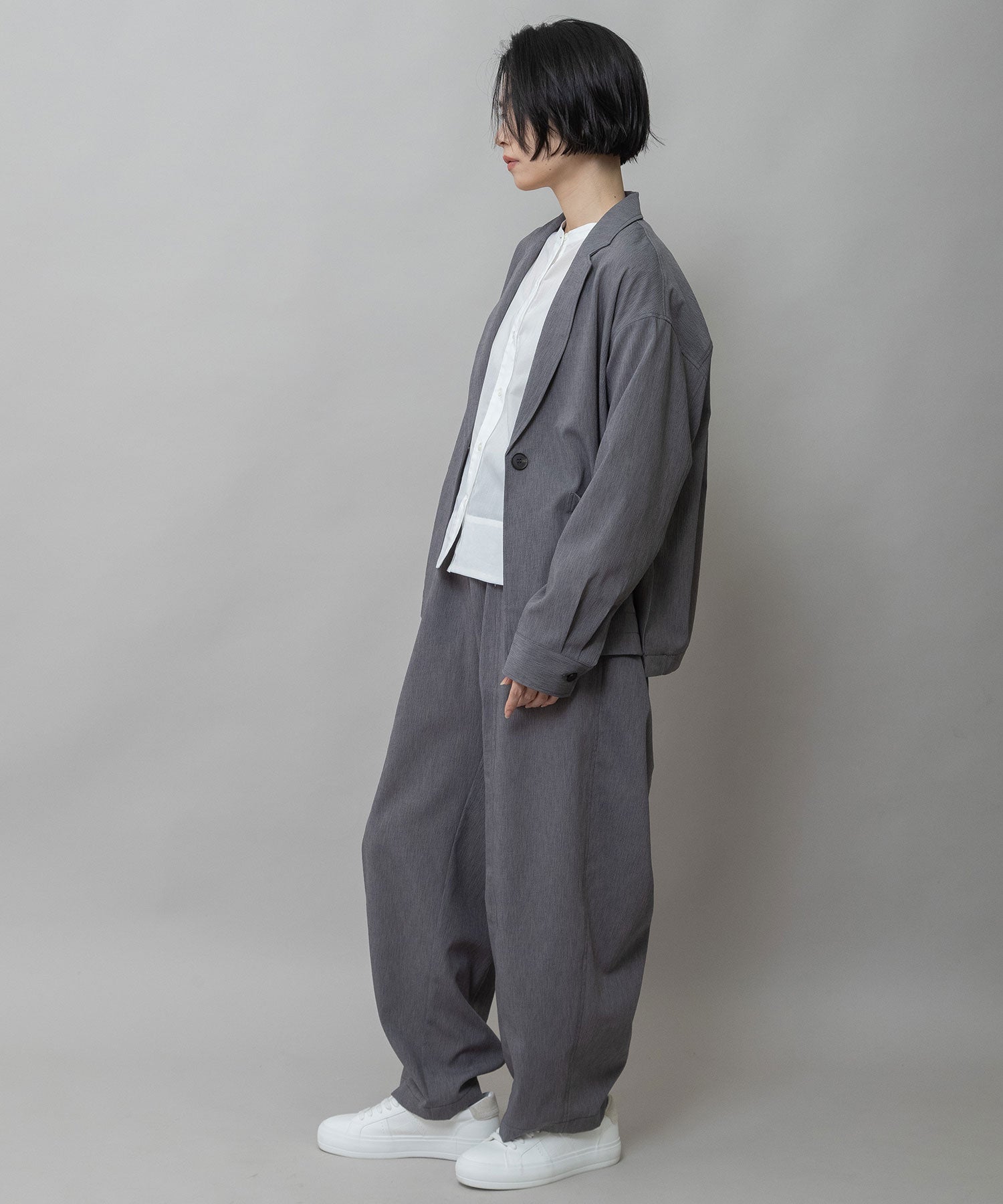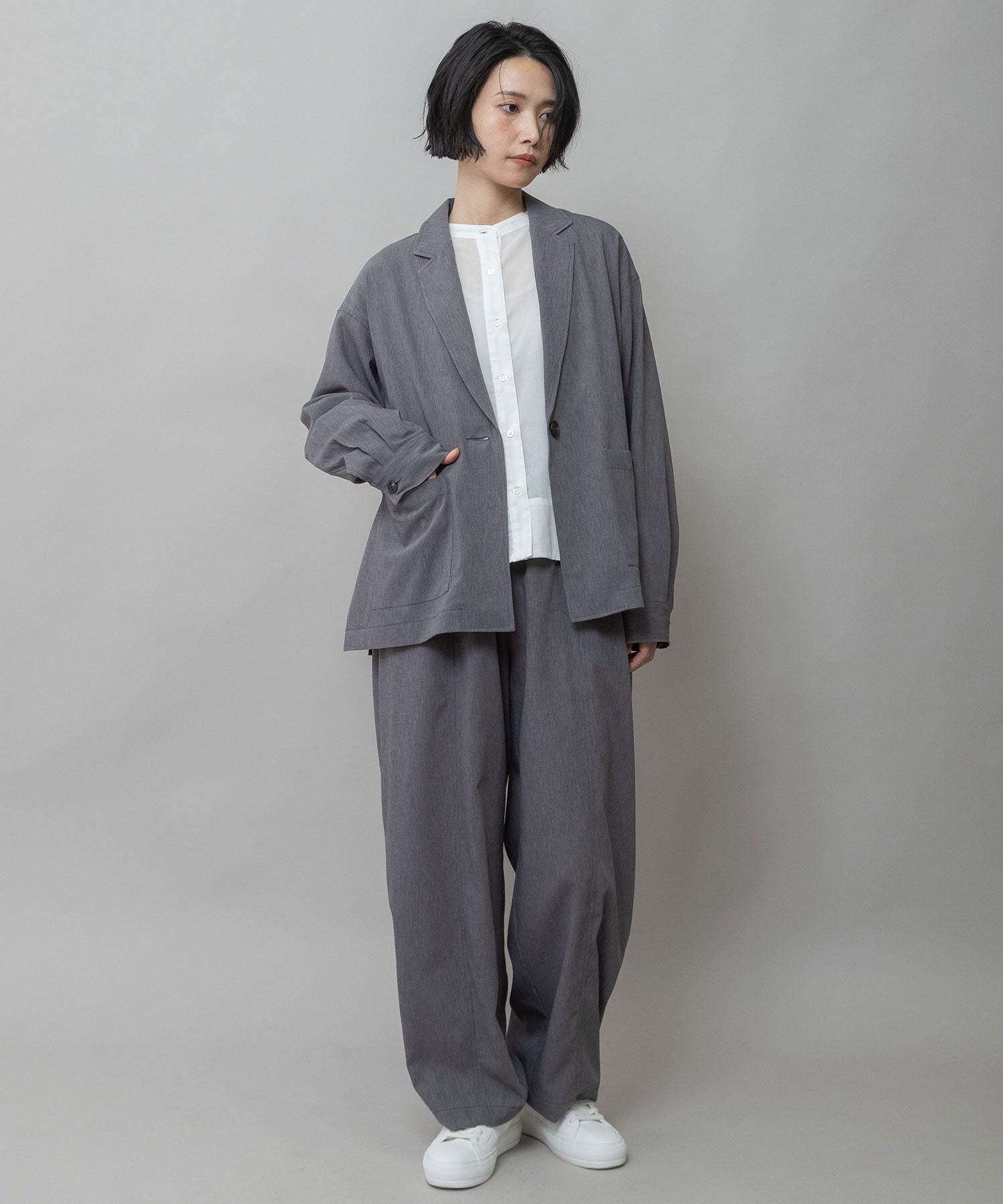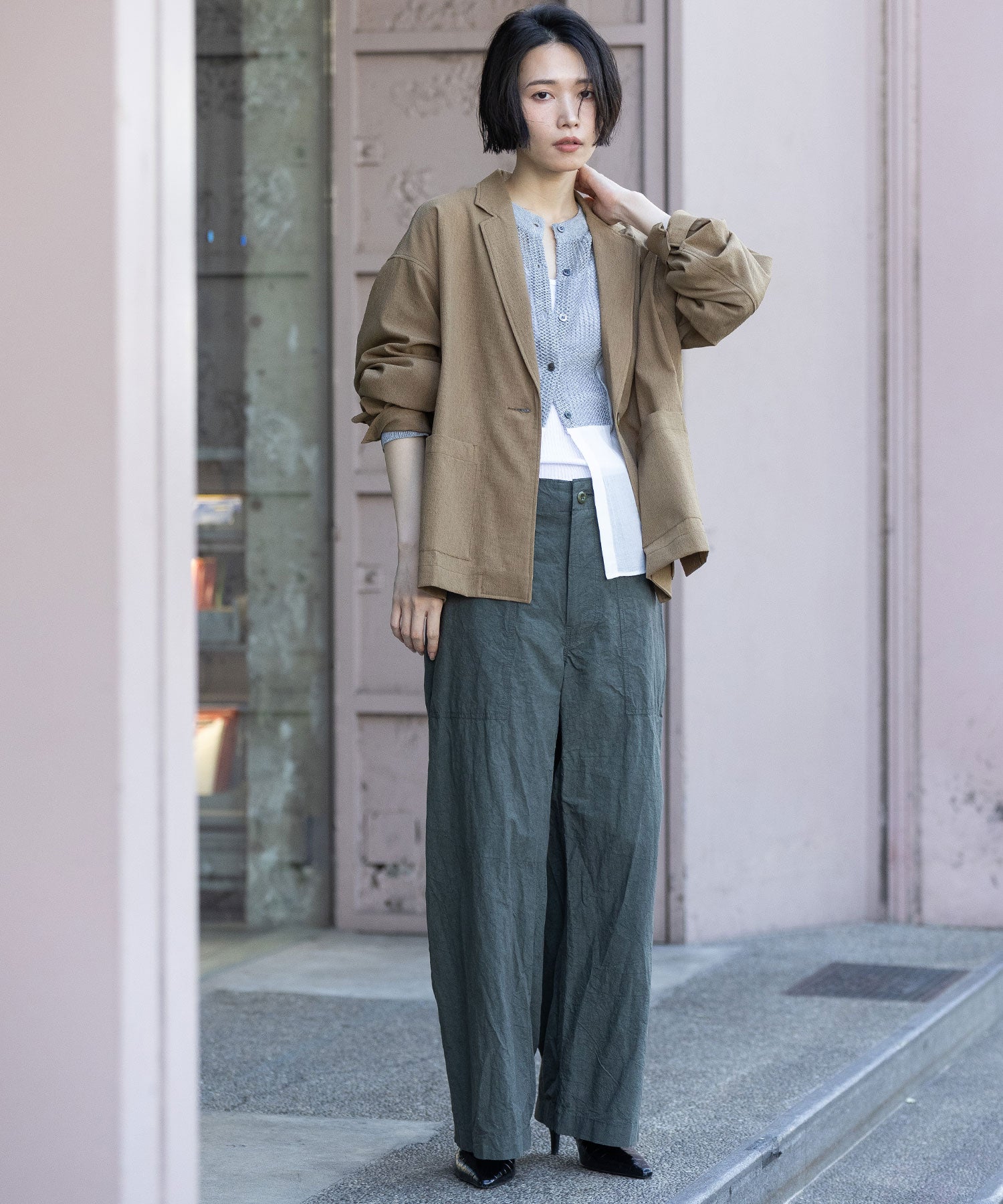 ボーイズライクやマニッシュな雰囲気に寄り過ぎないよう、あえて身体から離れる横広シルエットを強くして羽織ったときの抜け感につなげました。