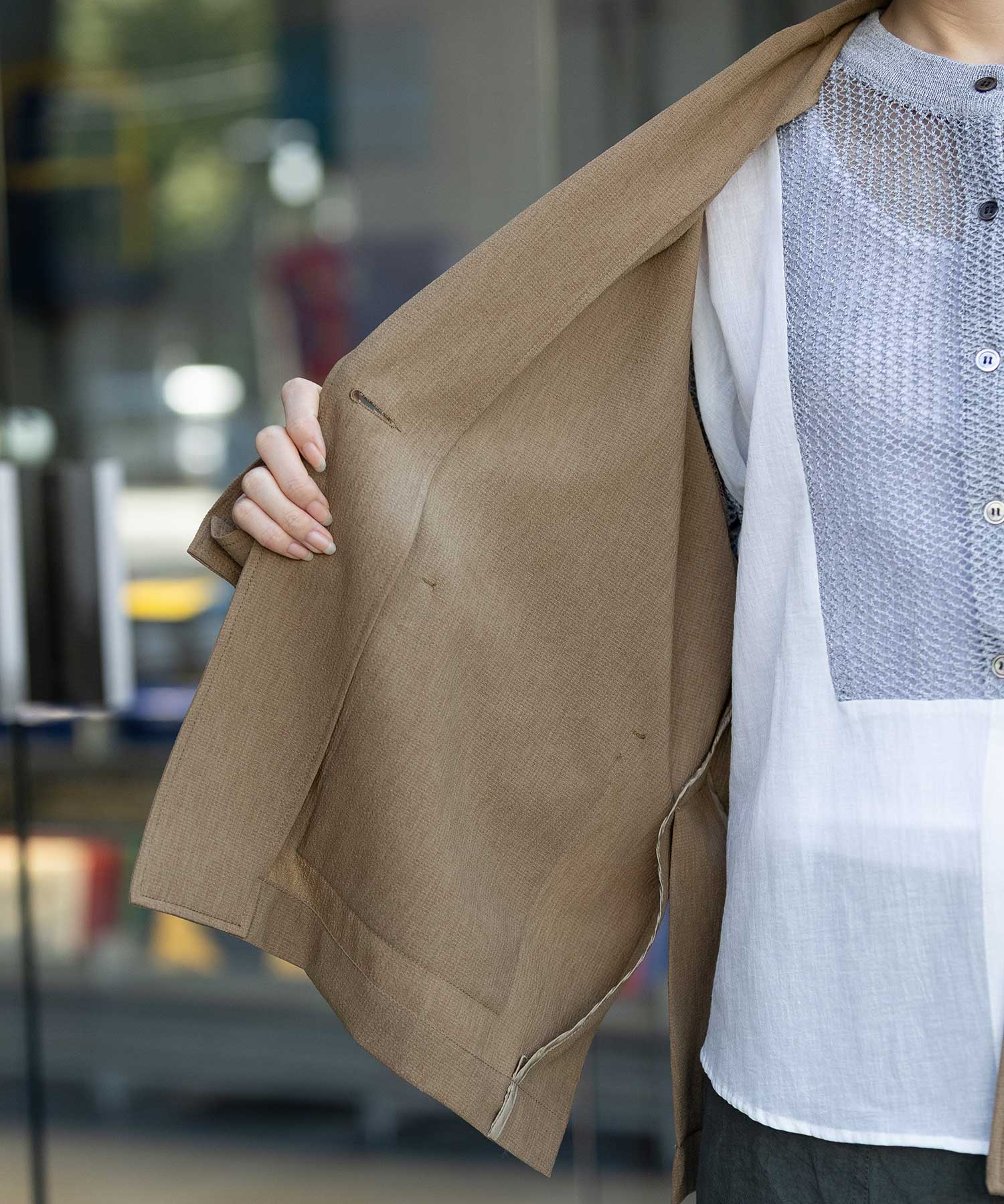 前あきはテーラードですが、後ろヨークに袖のカフス切替やタックなどのシャツディテールを加えて、軽快な印象を与える肩の凝らないジャケットに仕上げています。