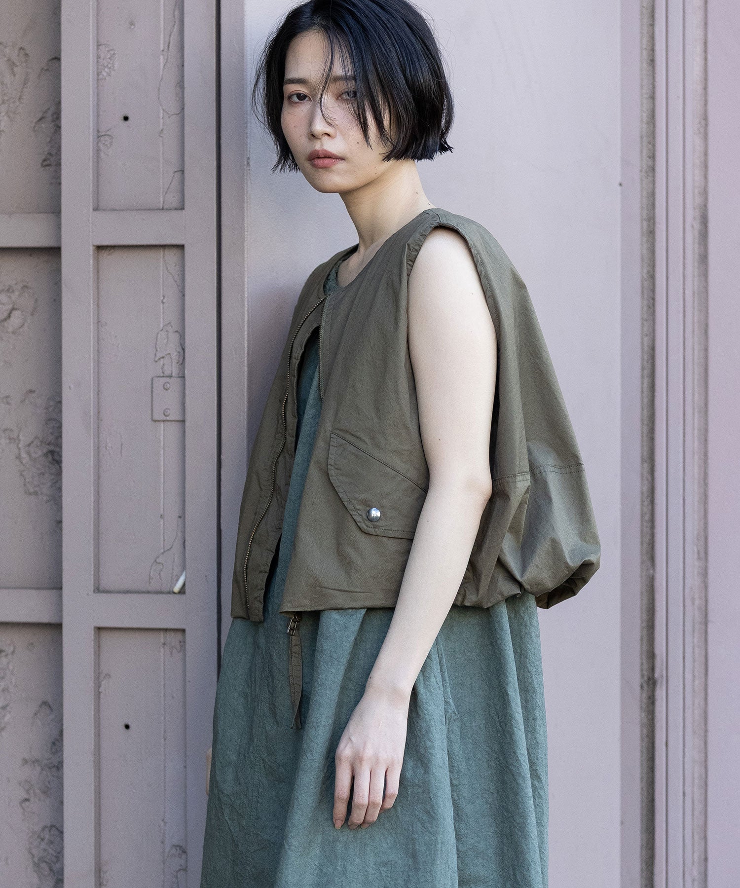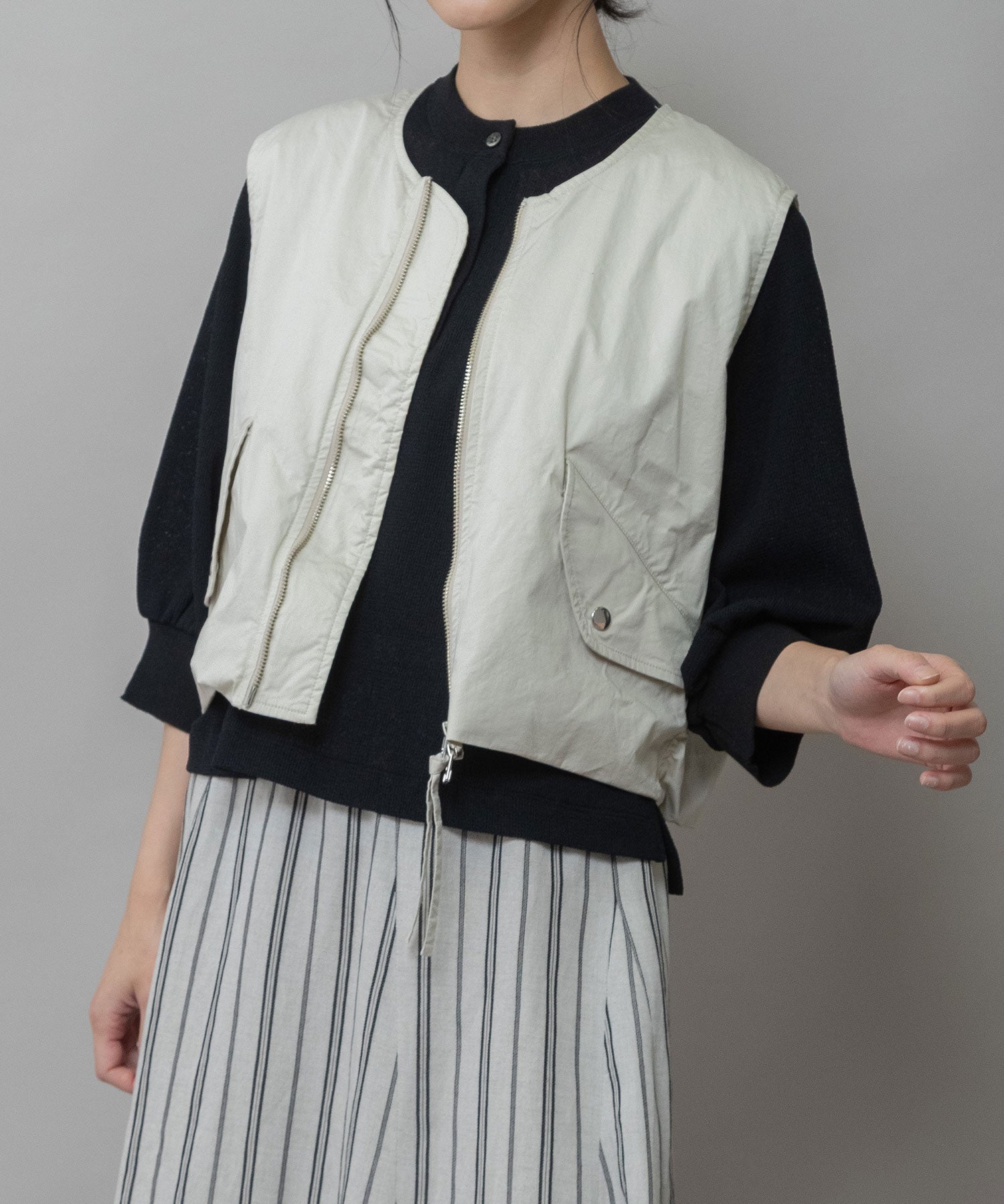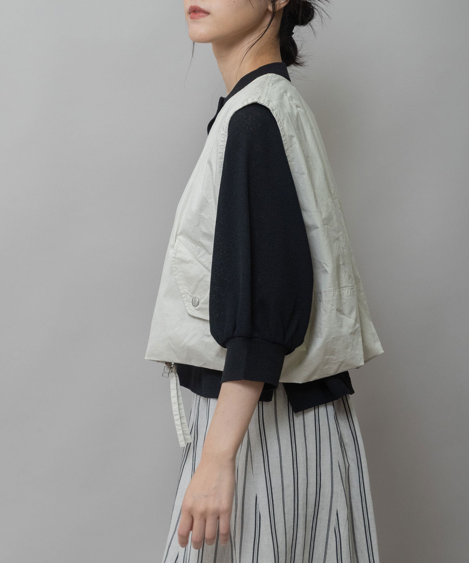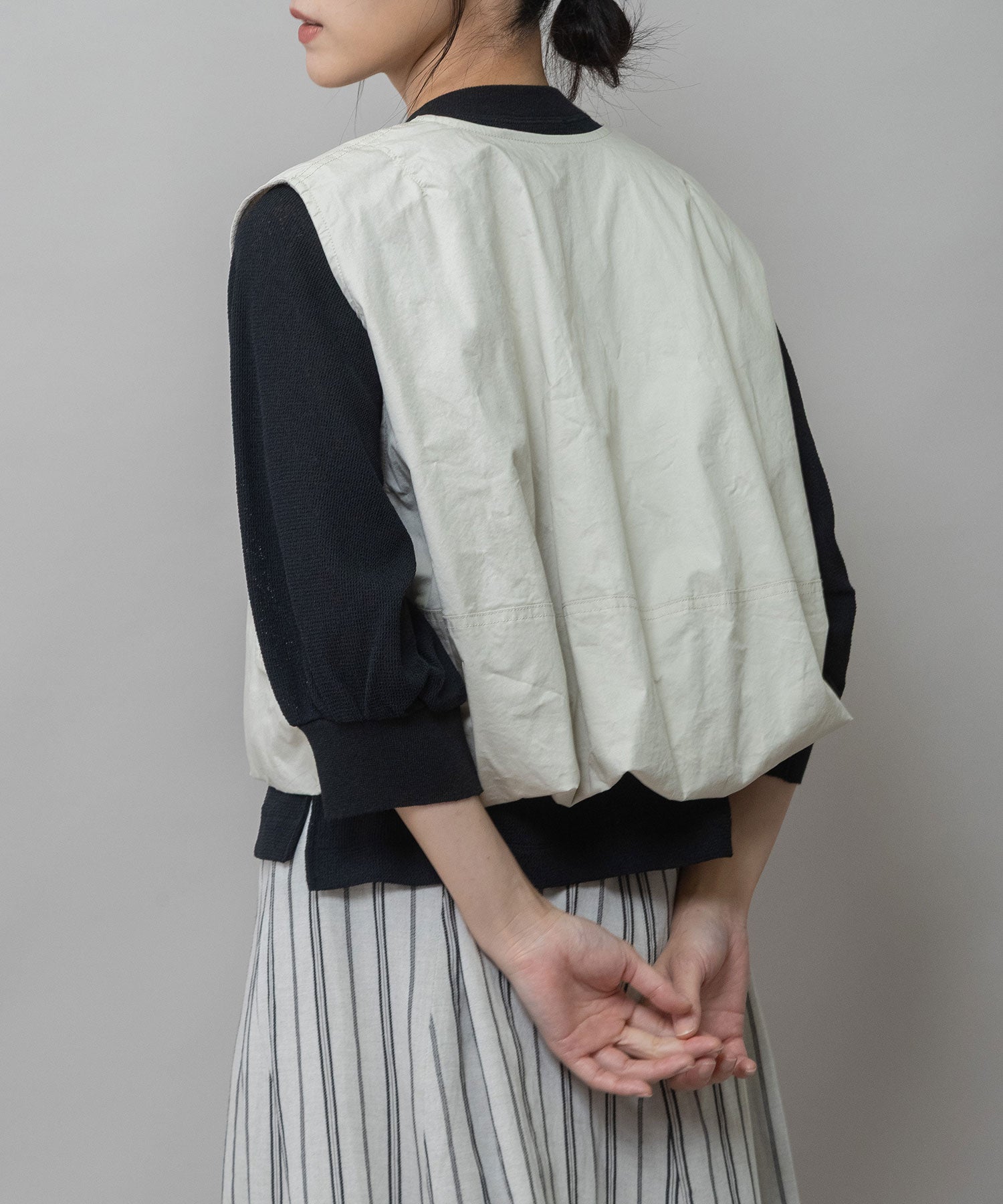 ショート丈で後ろ身頃のみ型紙を展開してバルーンシルエットにしたフライトジャケットモチーフのベストです。