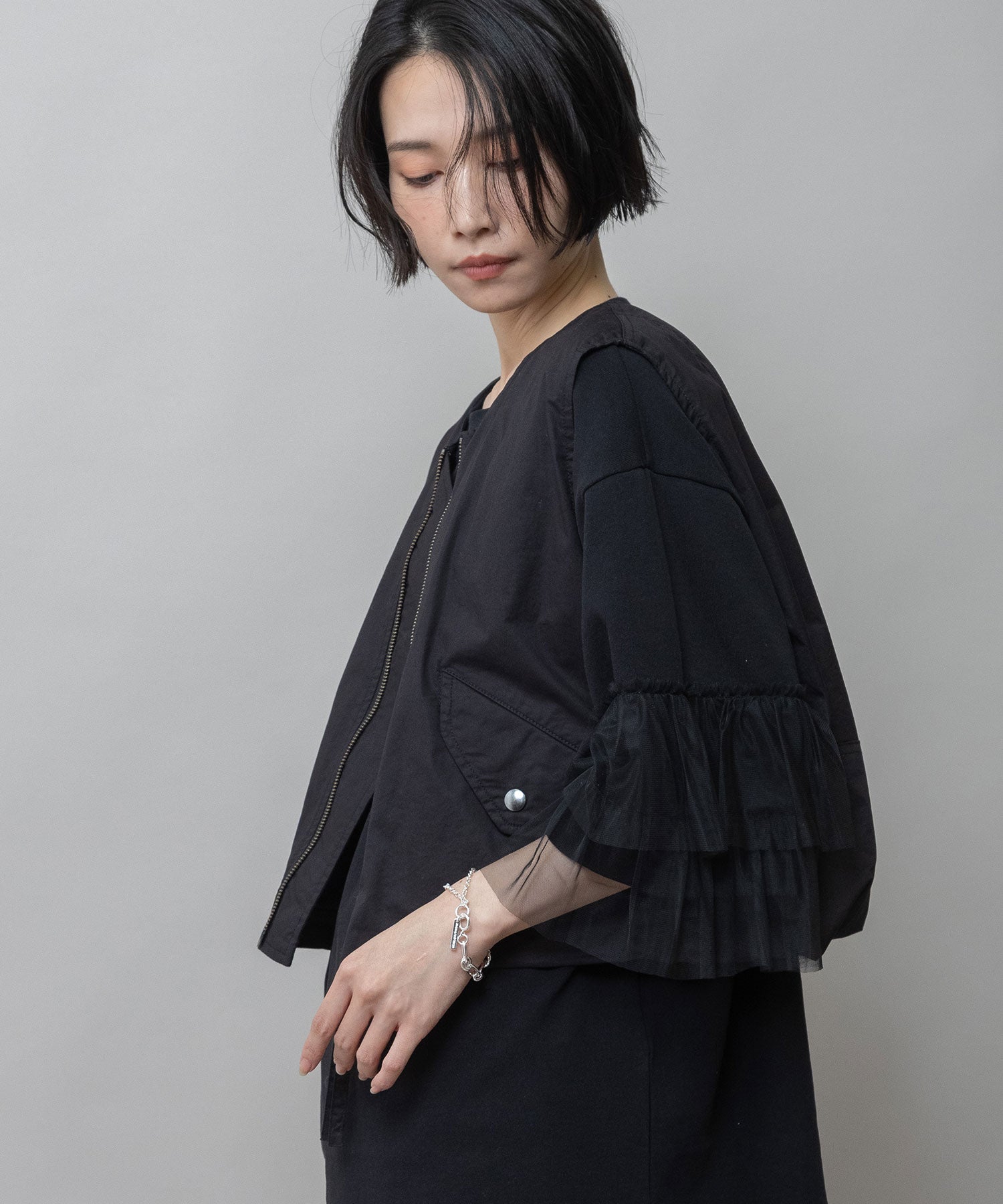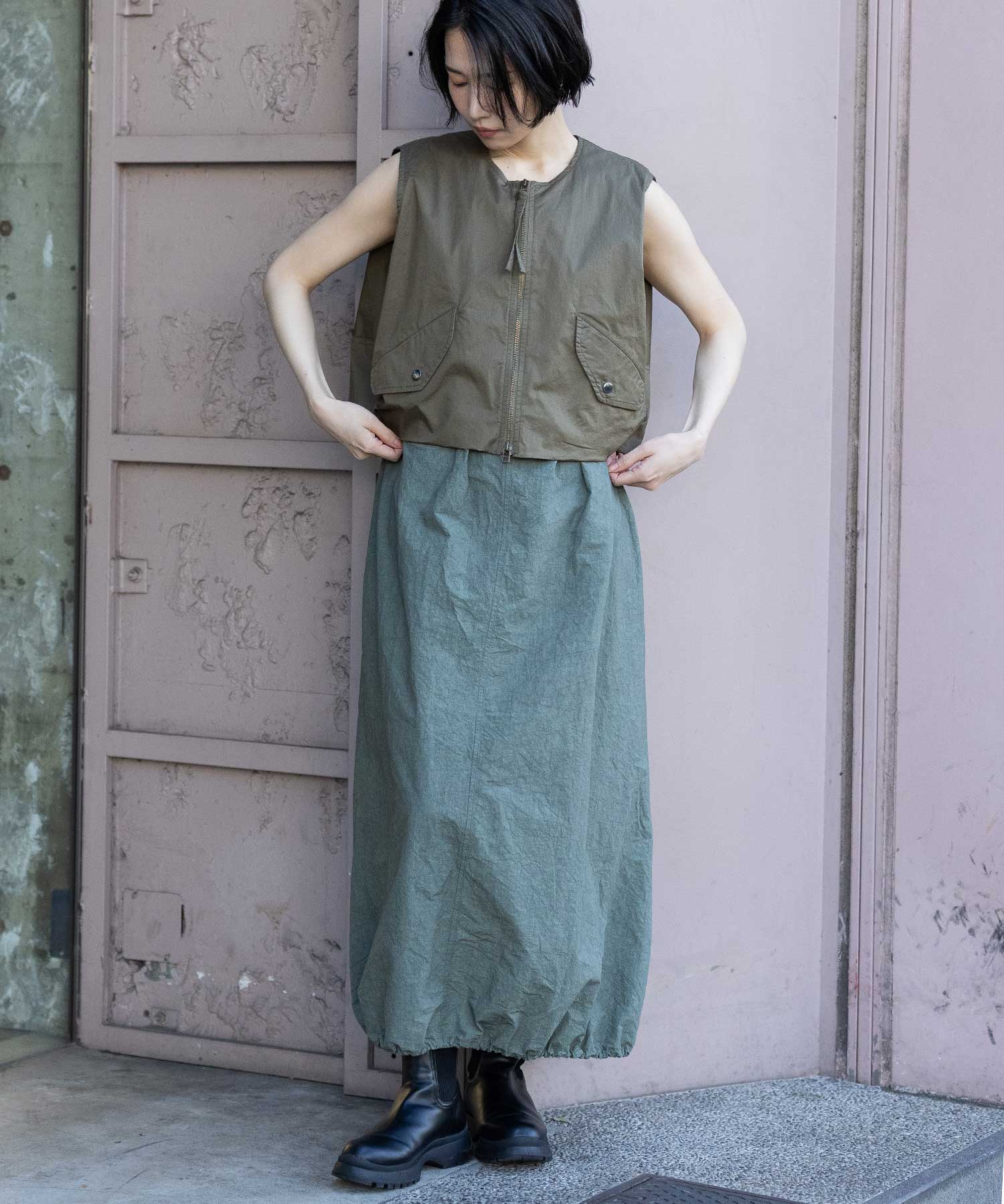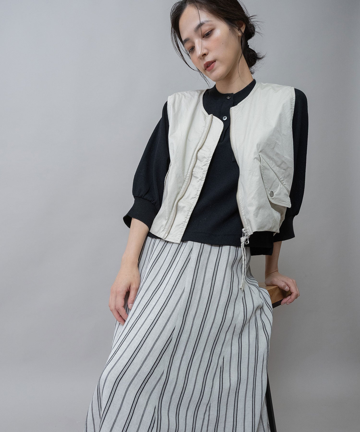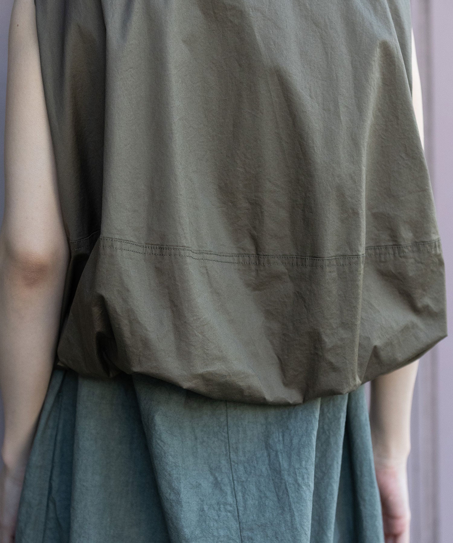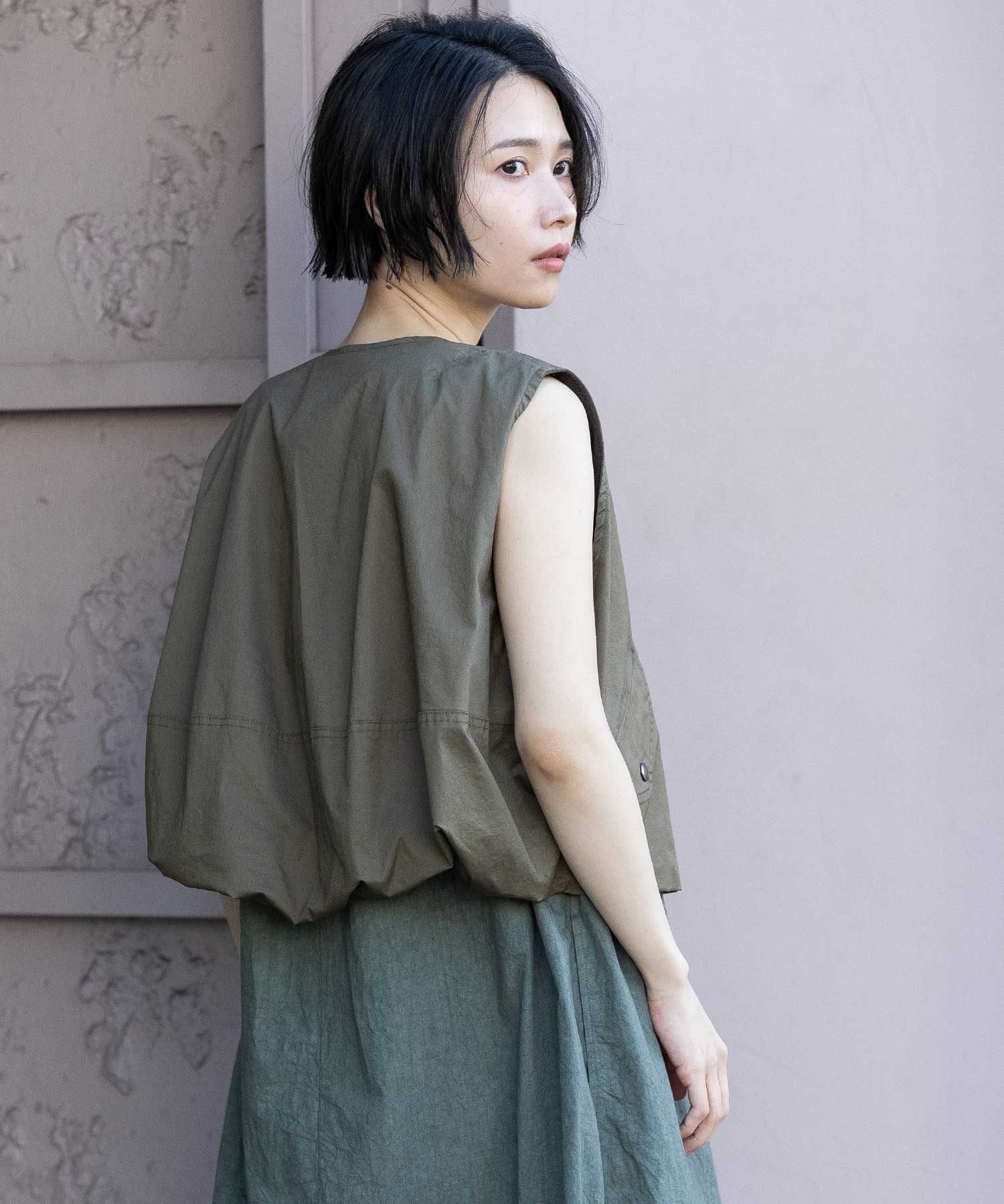 ショート丈で後ろ身頃のみ型紙を展開してバルーンシルエットにしたフライトジャケットモチーフのベストです。