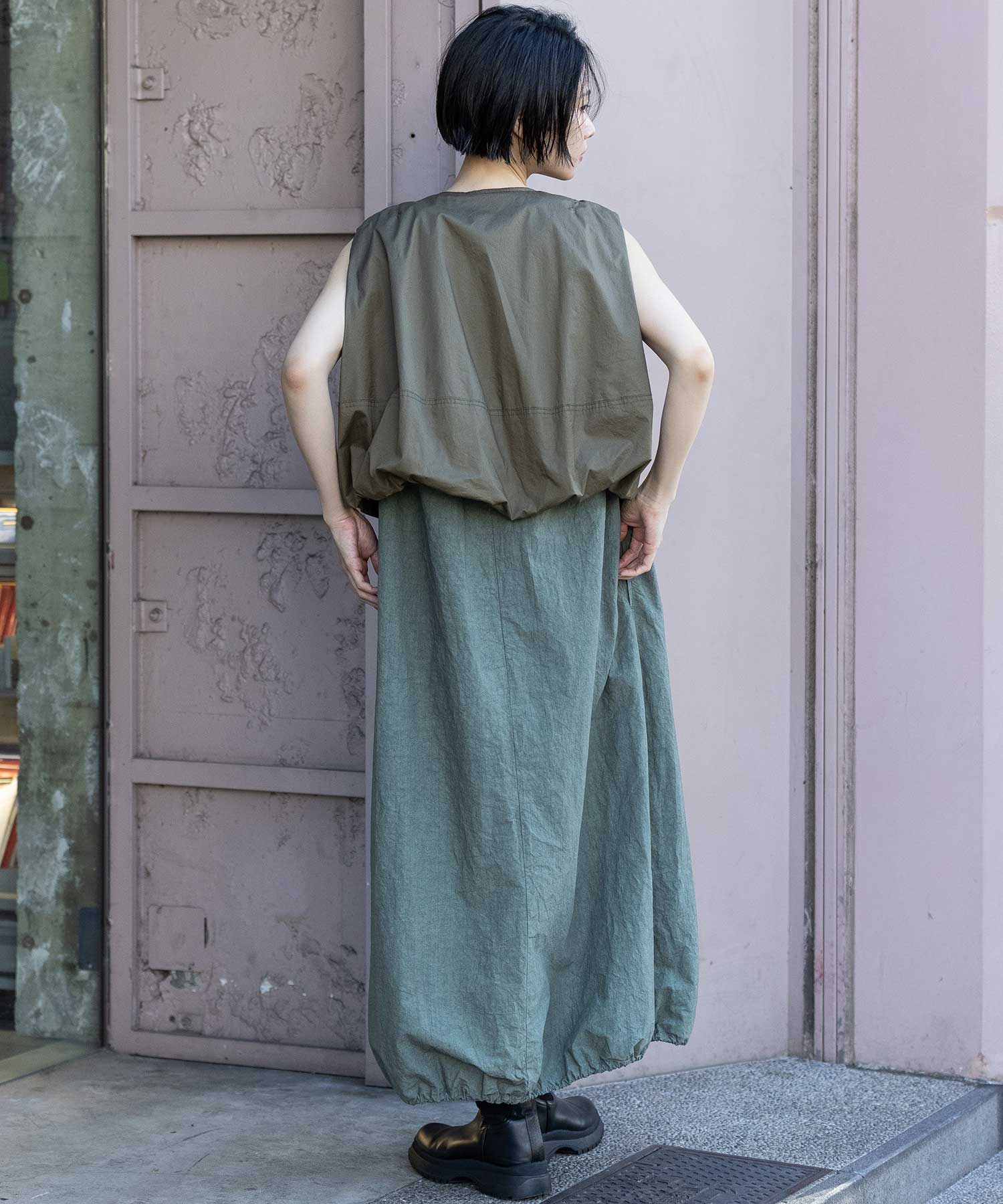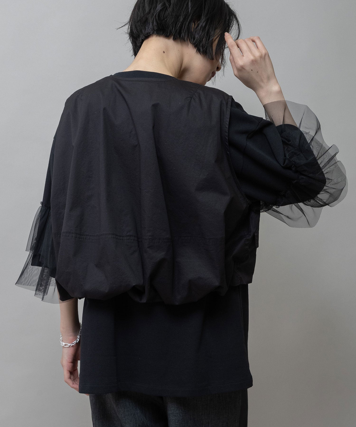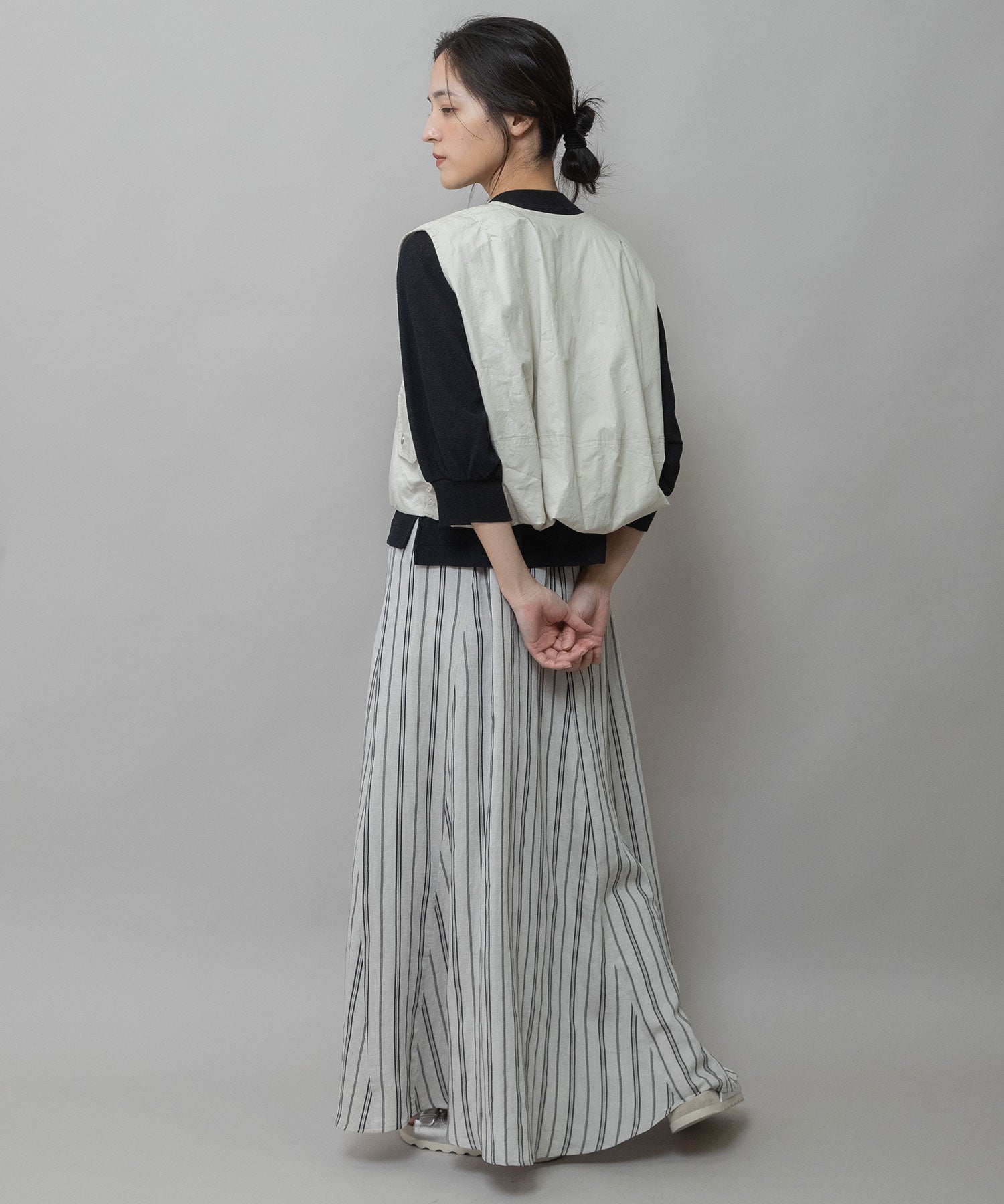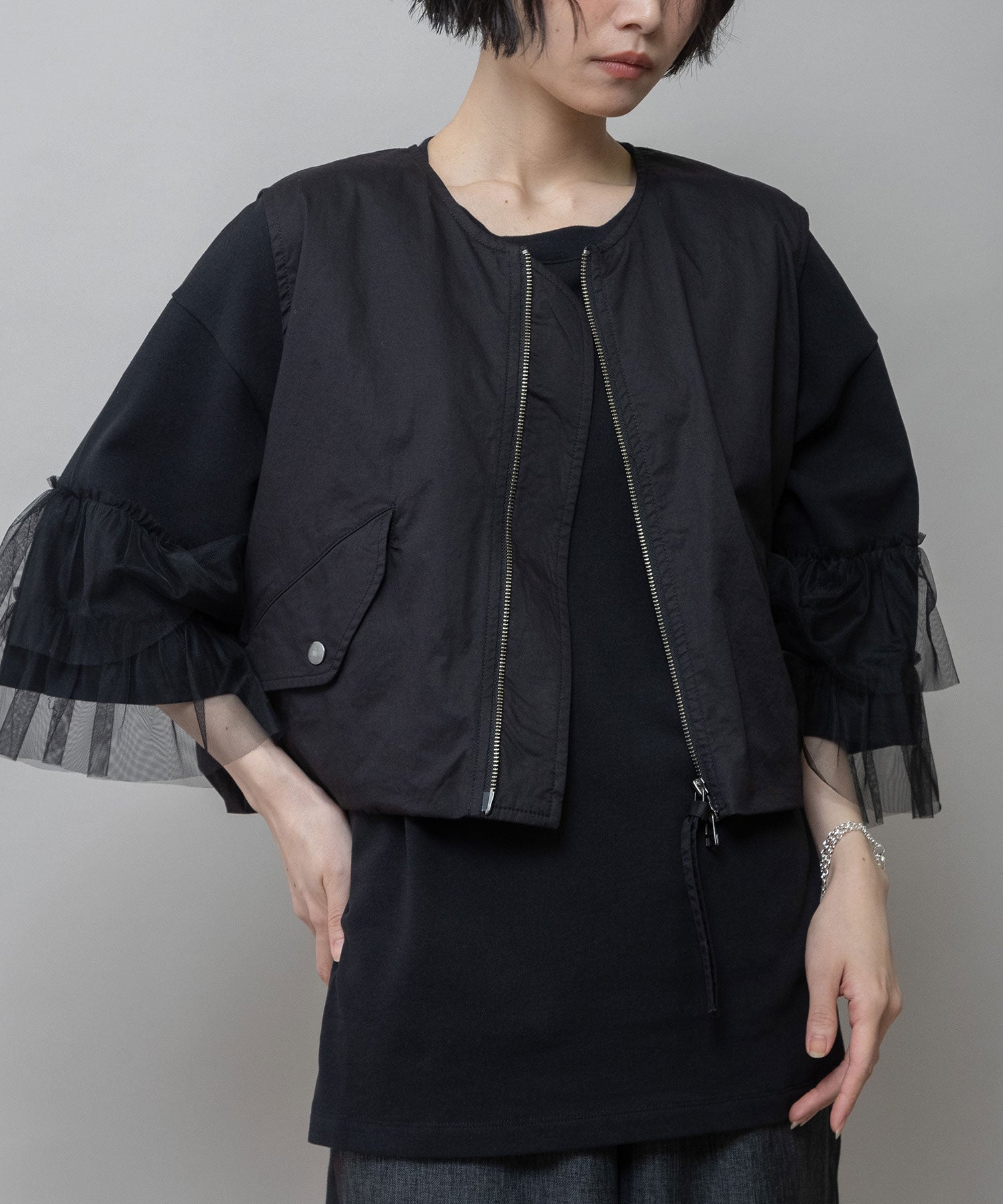 ショート丈で後ろ身頃のみ型紙を展開してバルーンシルエットにしたフライトジャケットモチーフのベストです。