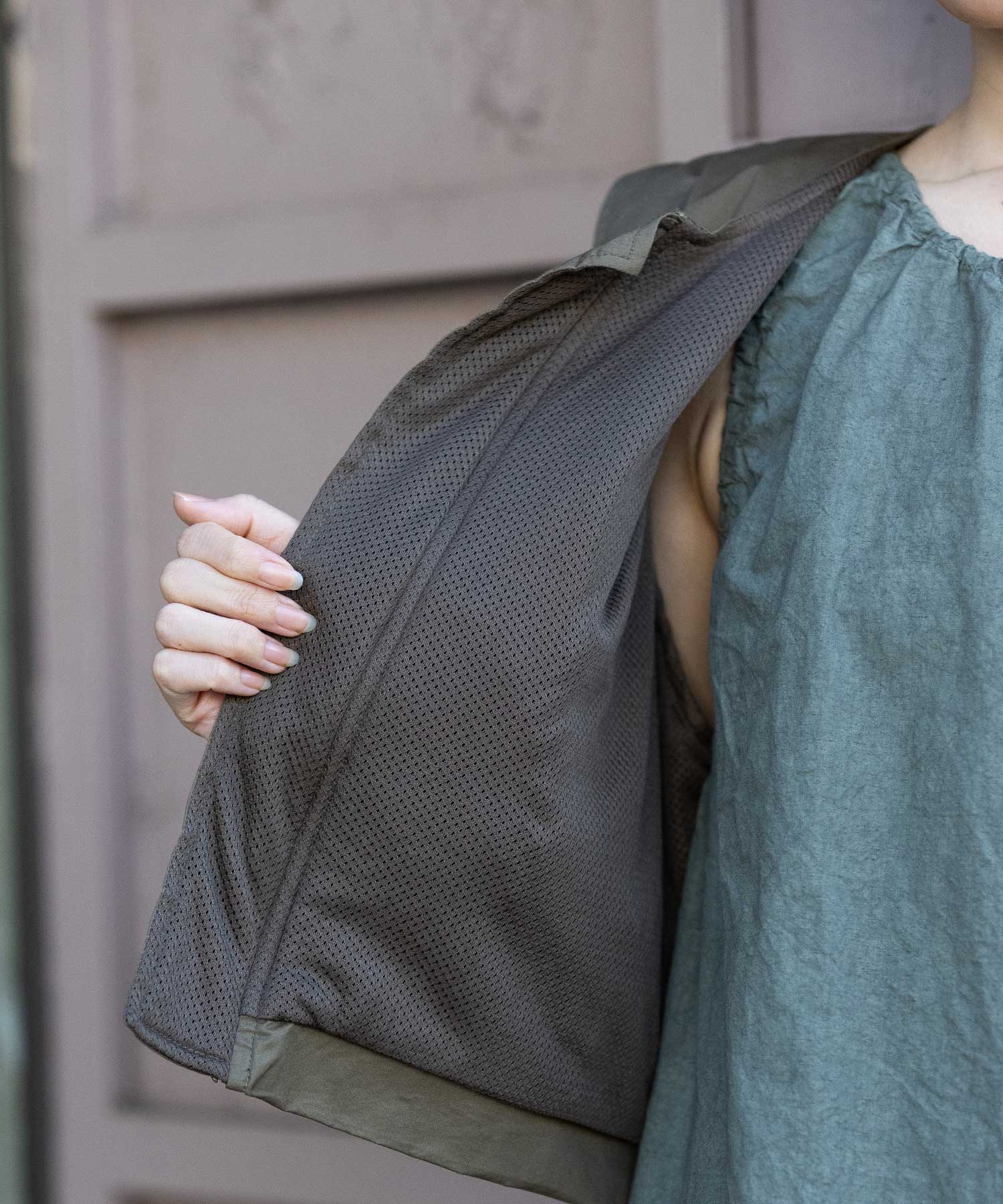 裏地のOctaは薄手バージョンを使っているのでより暖かくなり過ぎない機能性で半袖、スリーブレスの季節もコーデのアクセントとして使えます。