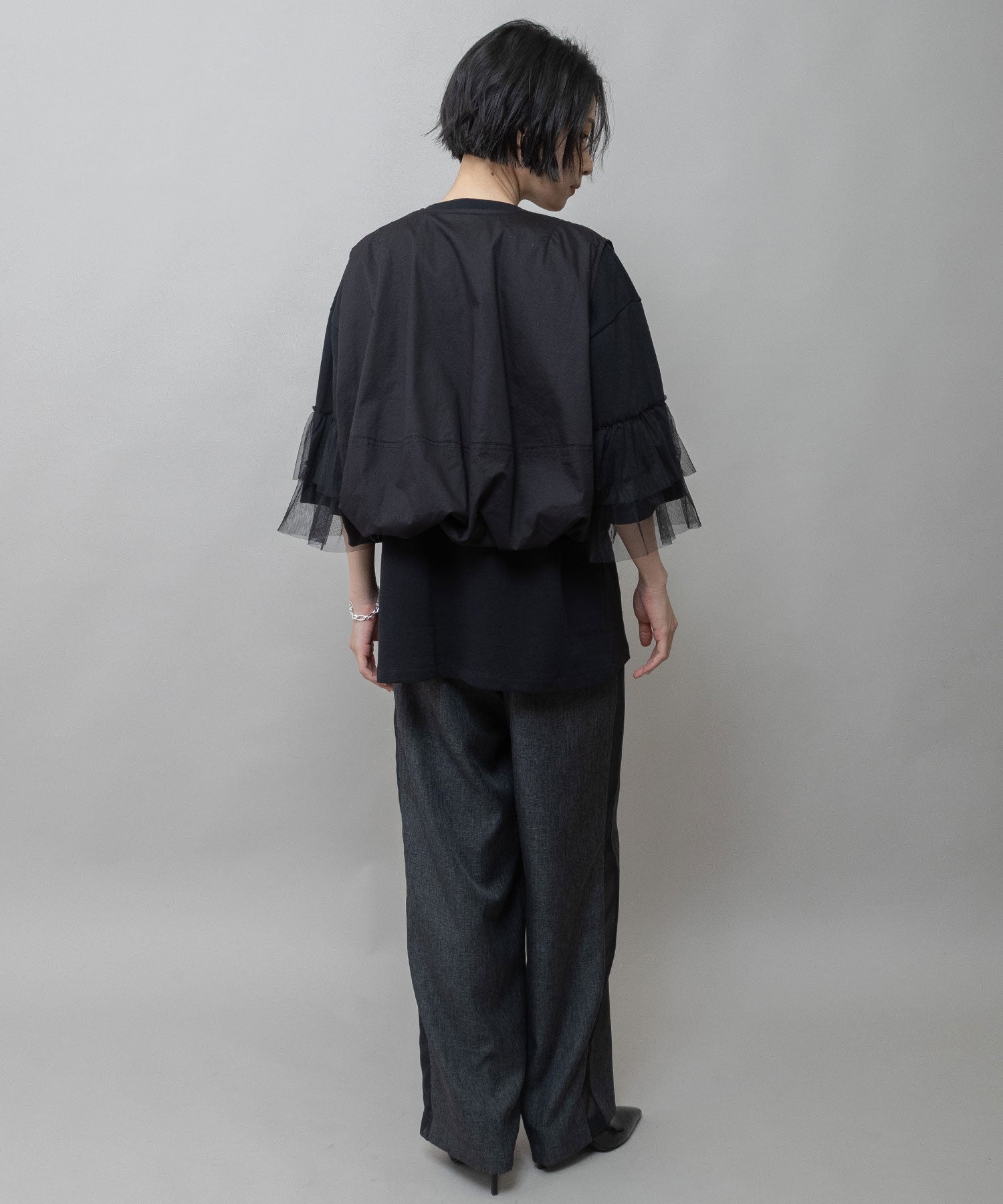 バックスタイルはふくらみがありながら身巾を大きく展開しているのでアームホールのくびれが隠れたスクエアなアウトラインになるのが特徴で、ふくらみのあるシルエットはサイド寄りで顕著に出ます。