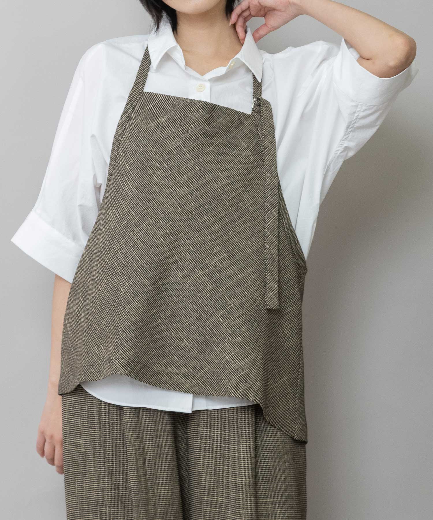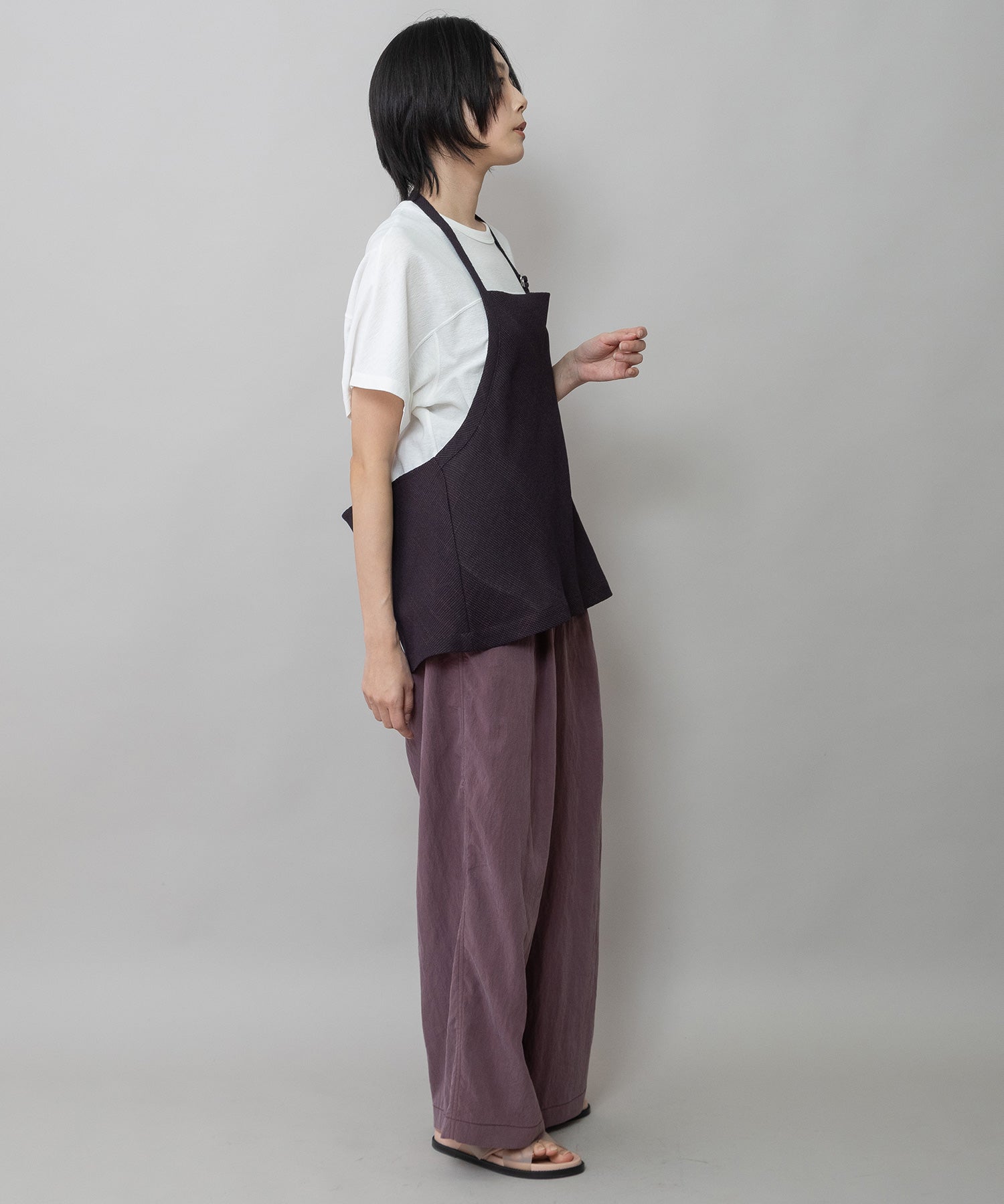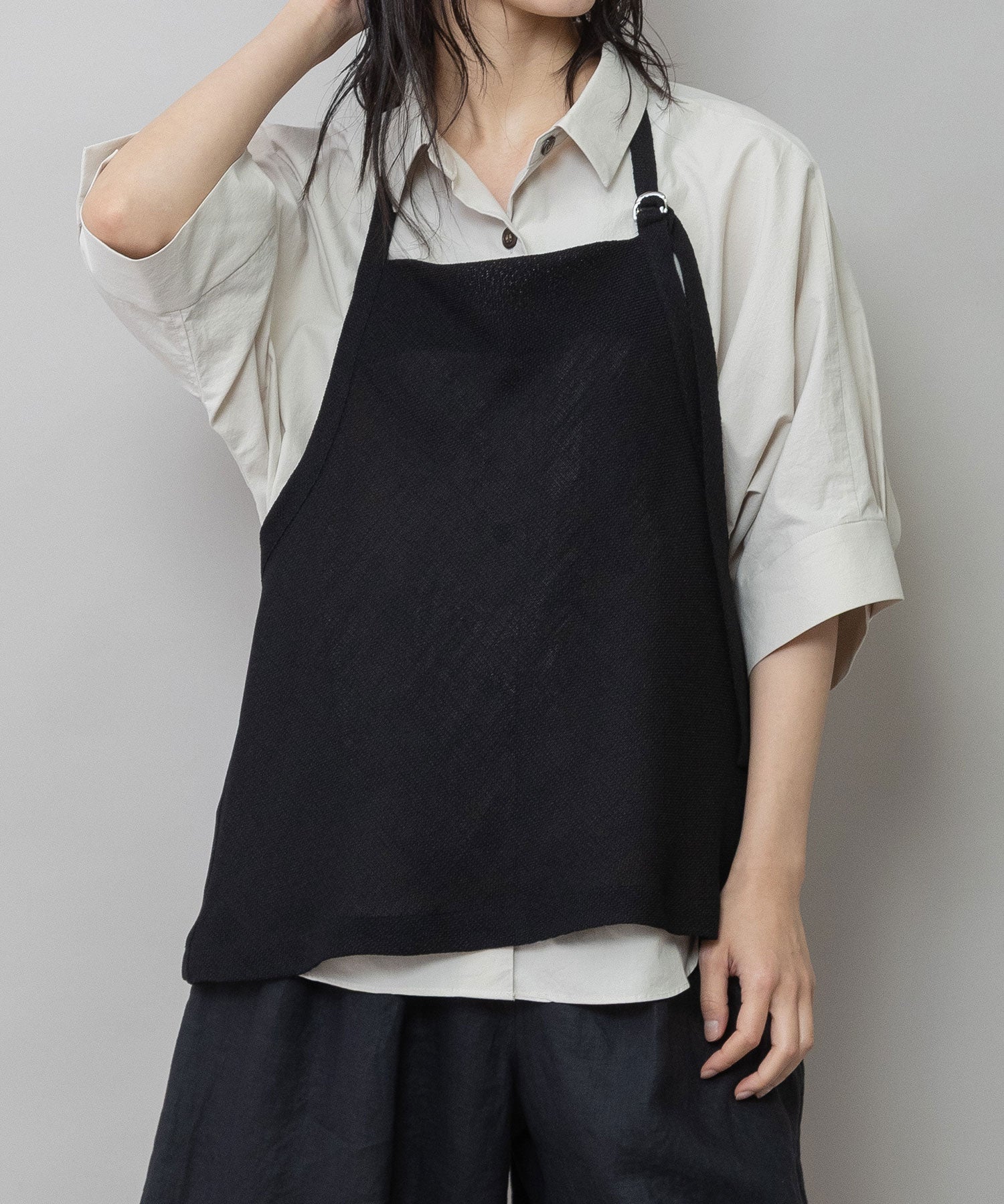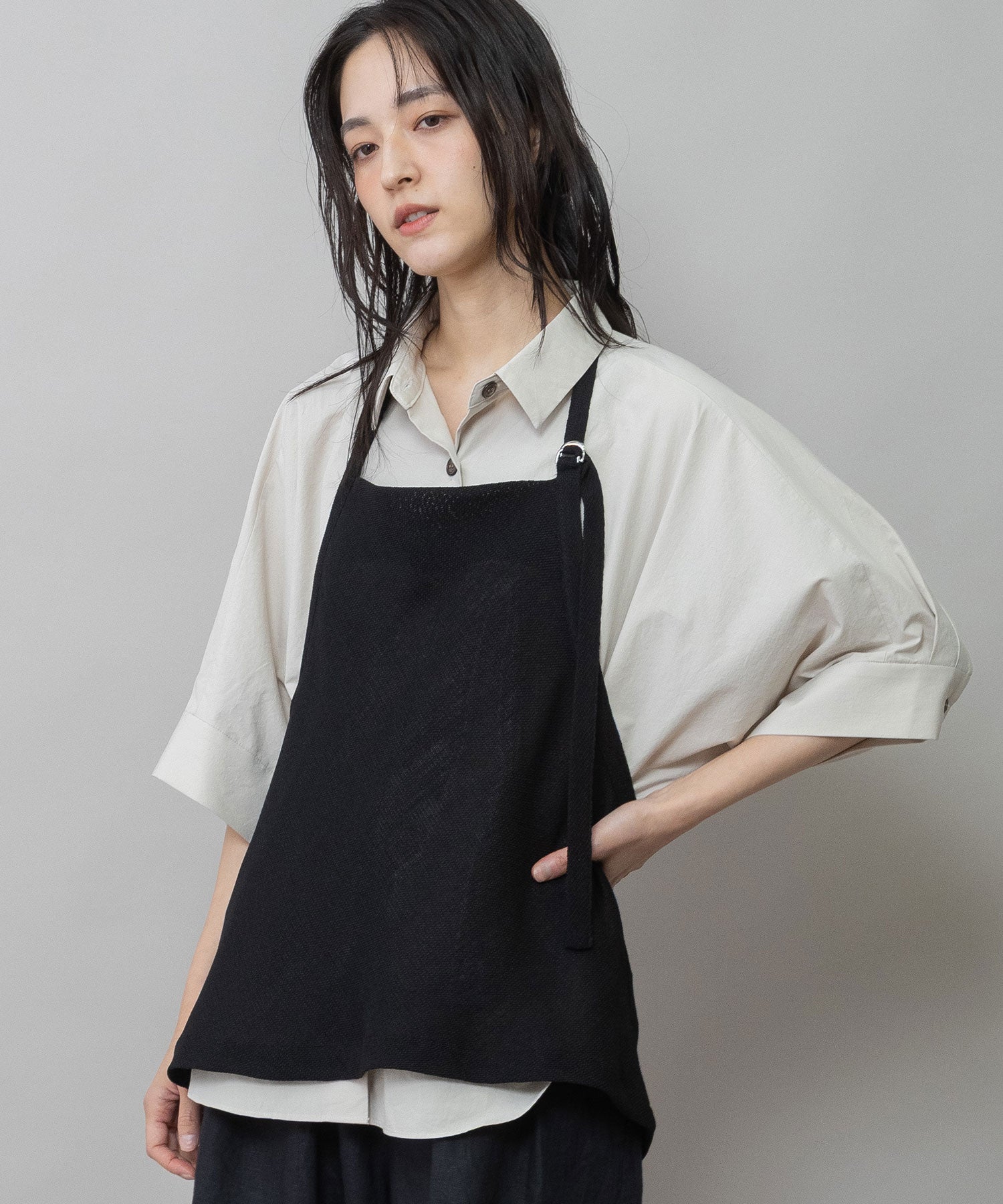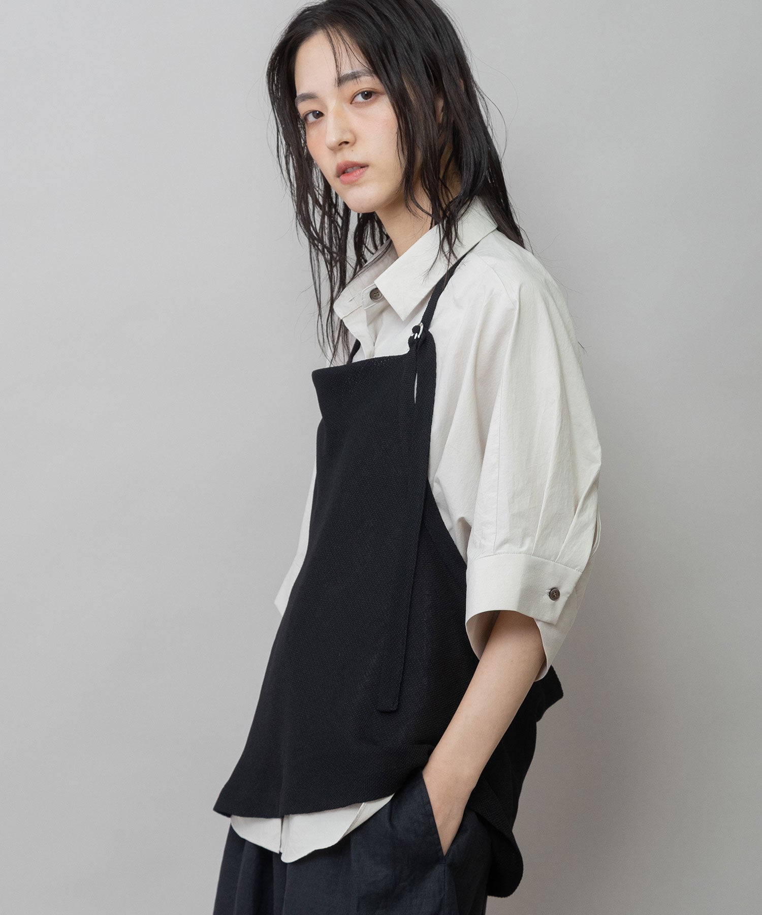 ホルターネックのエプロンみたいな筒をバイアス裁断することで衿元がドレープしたり、重ねて着る際に落ちたり分量が留まったりし、ニュアンスが出やすいように仕立てました。