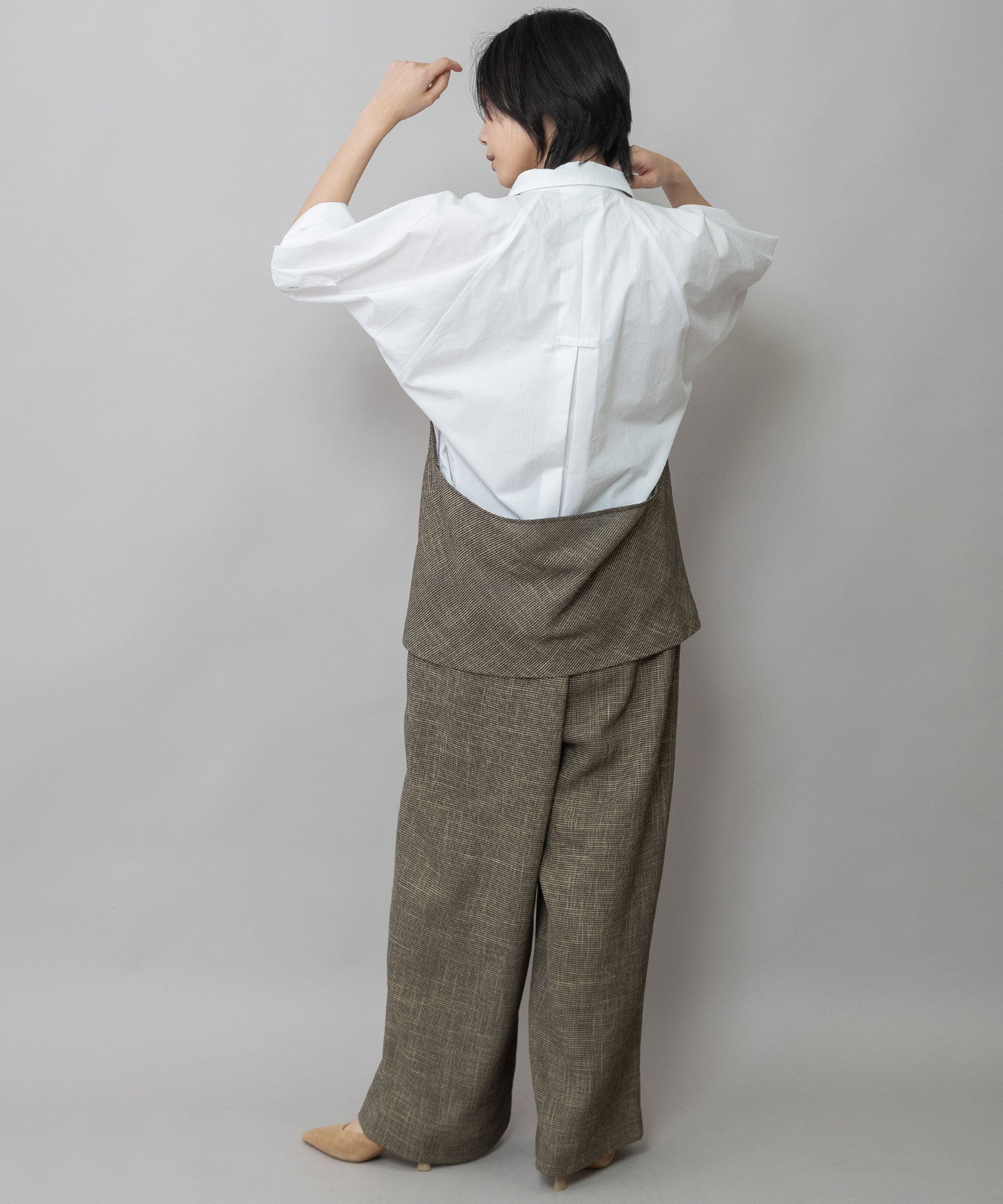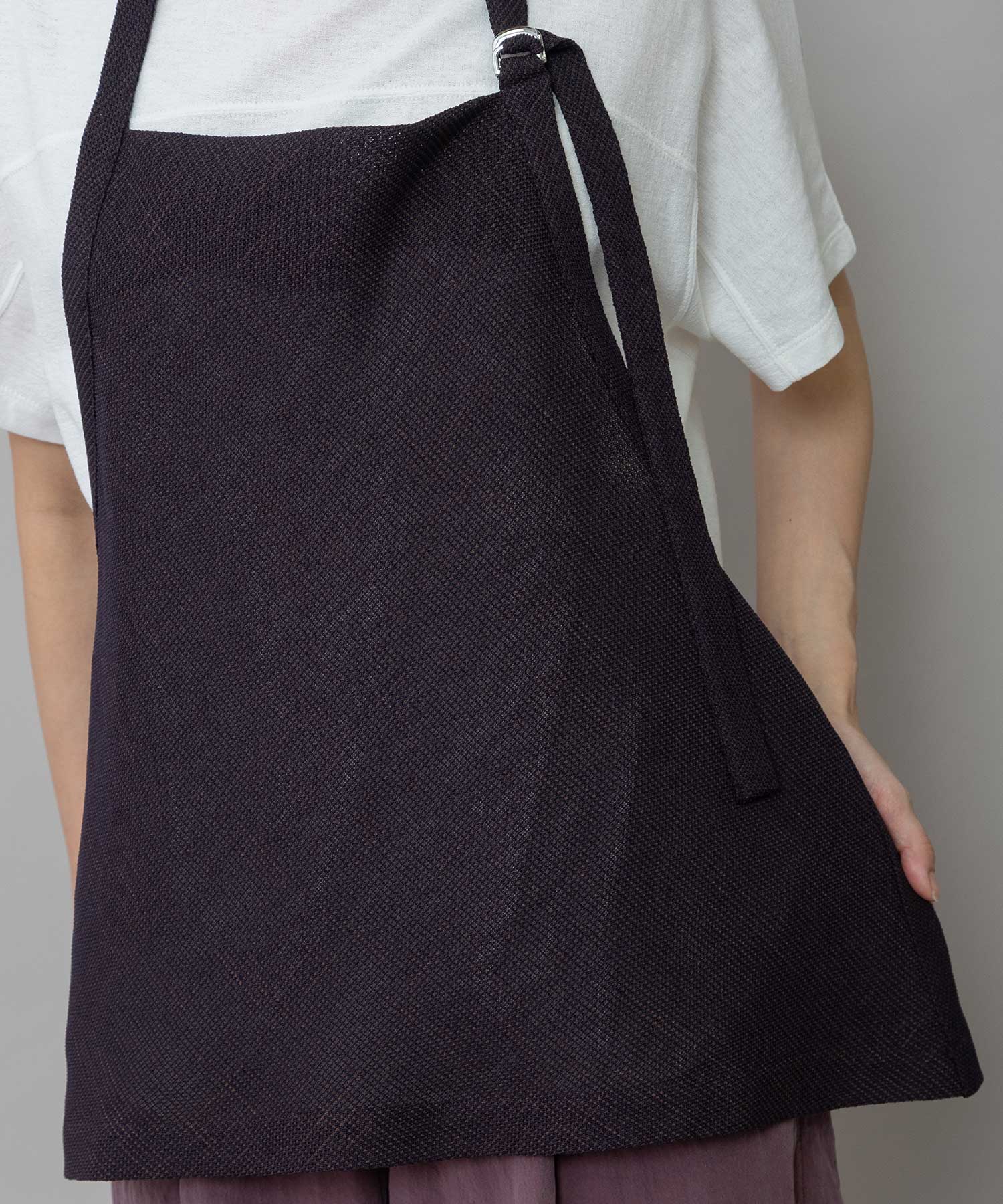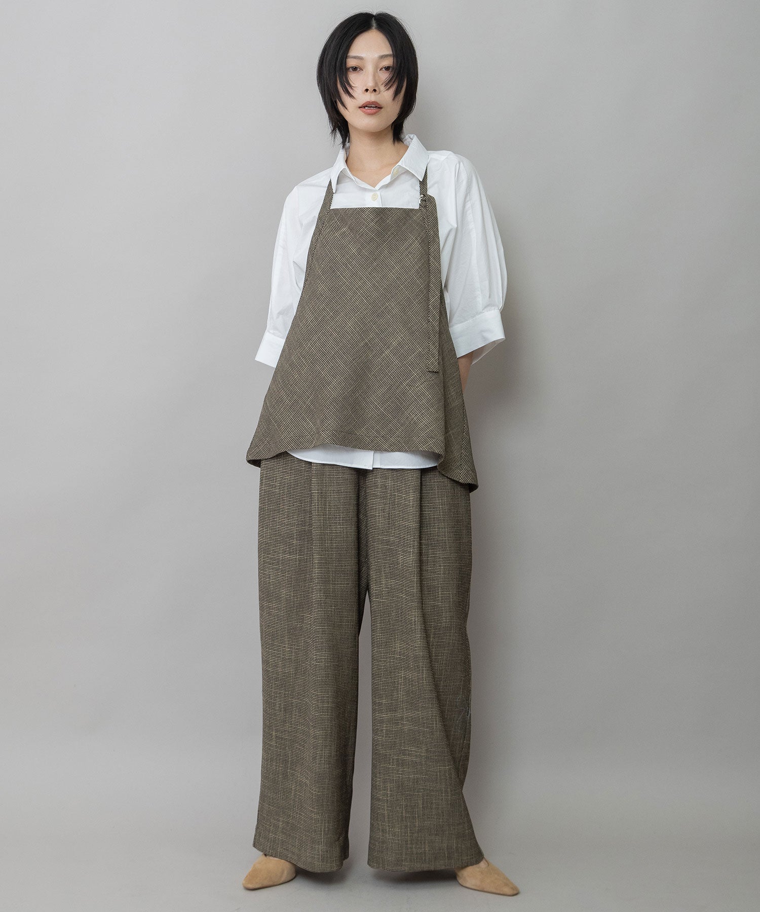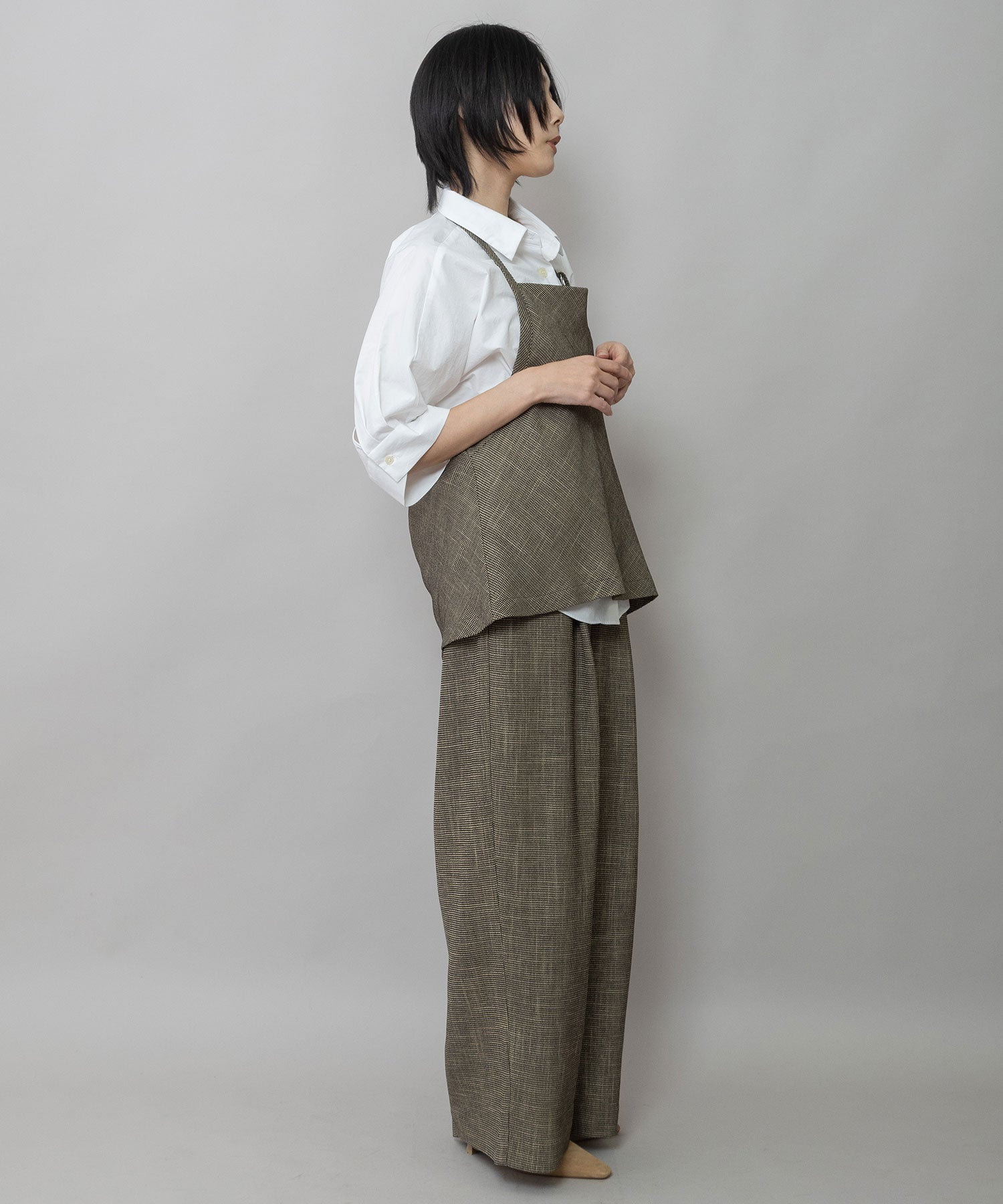 ホルターネックのエプロンみたいな筒をバイアス裁断することで衿元がドレープしたり、重ねて着る際に落ちたり分量が留まったりし、ニュアンスが出やすいように仕立てました。