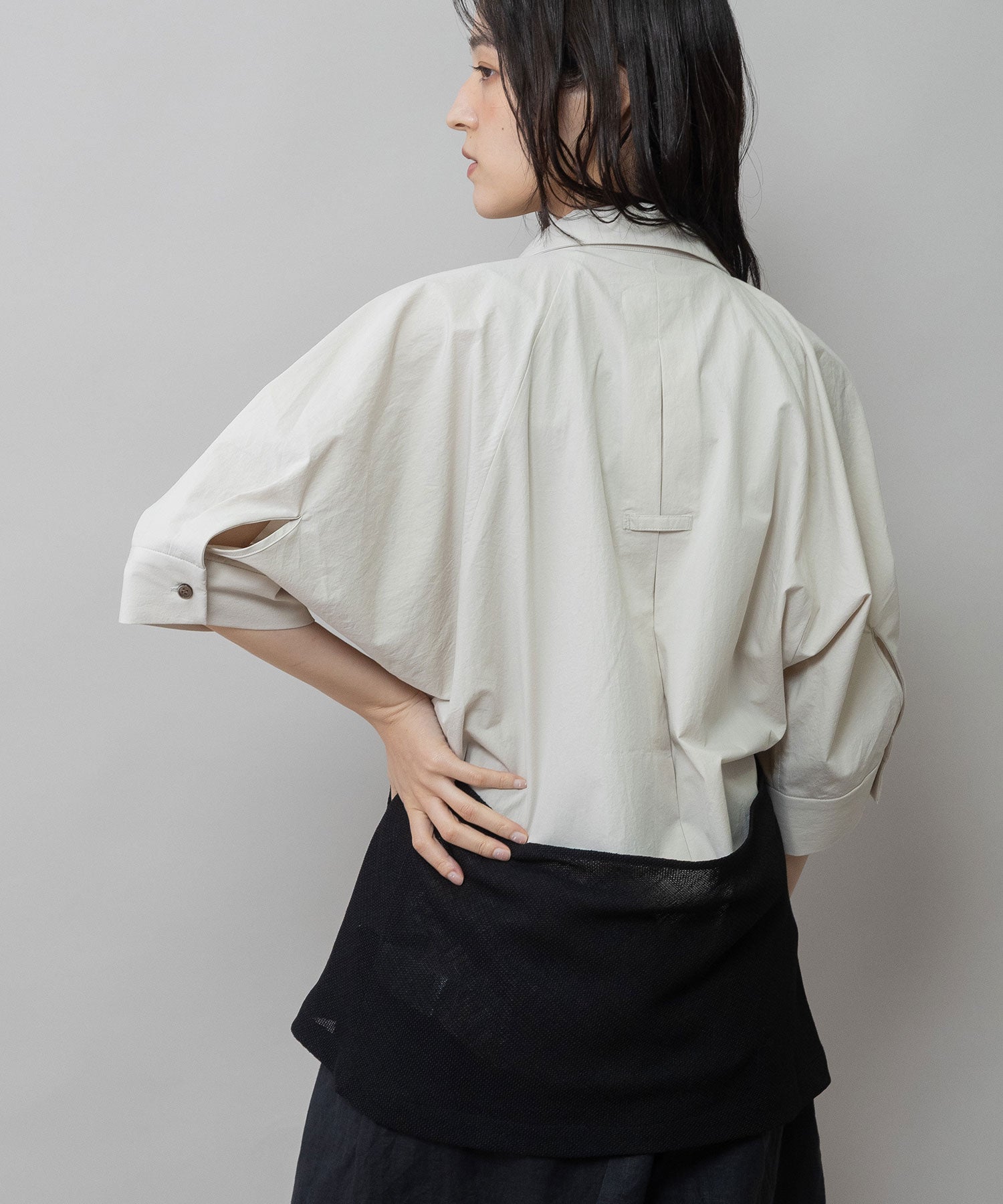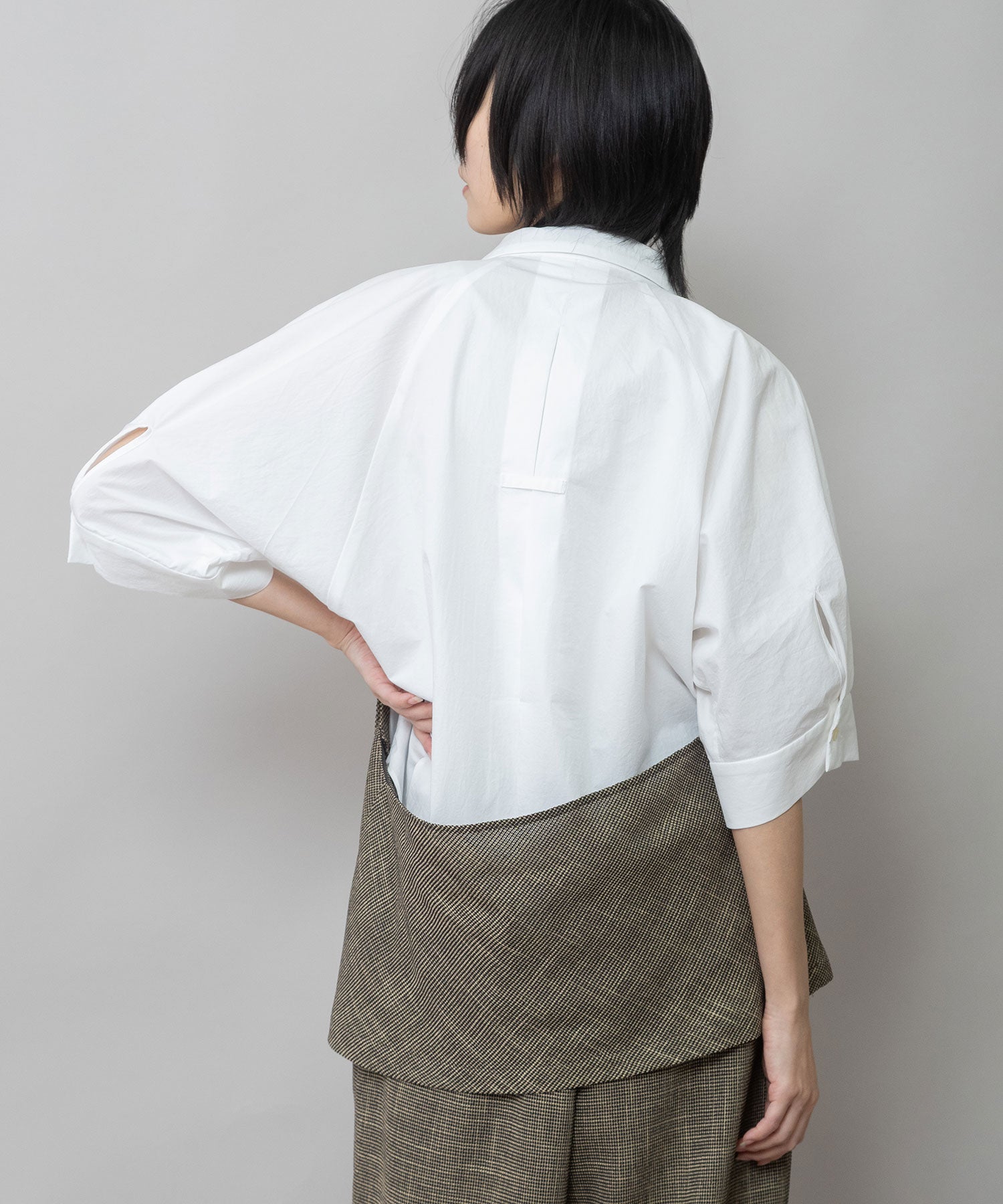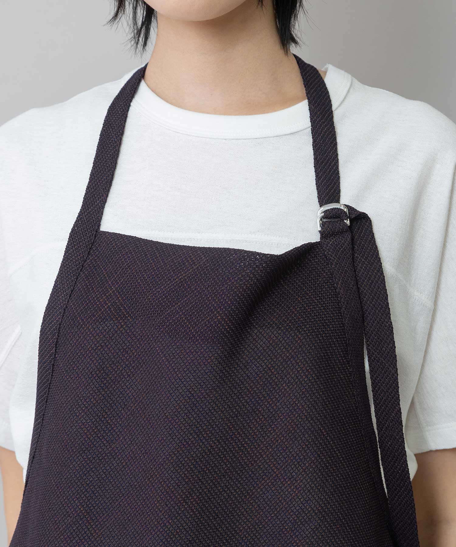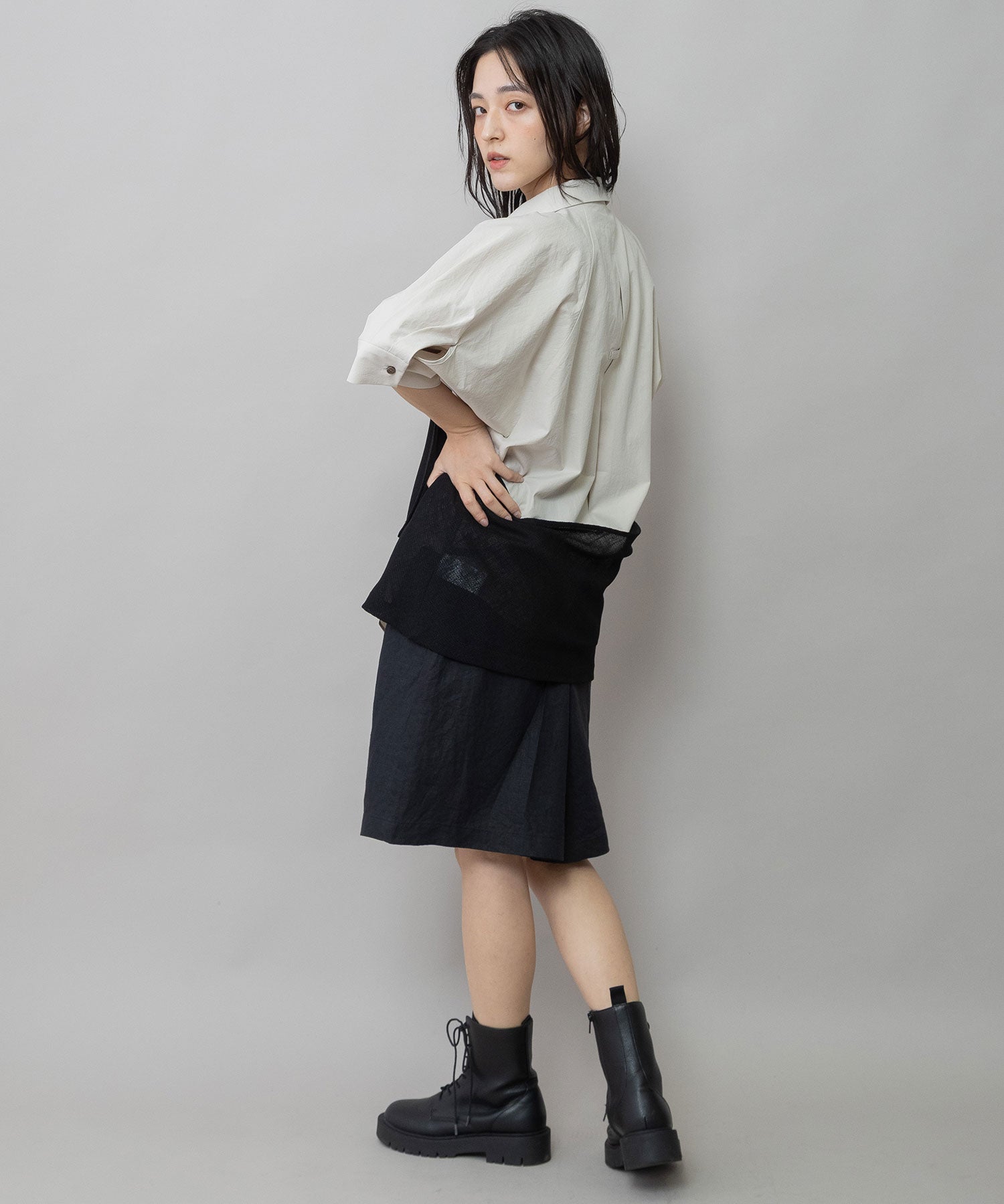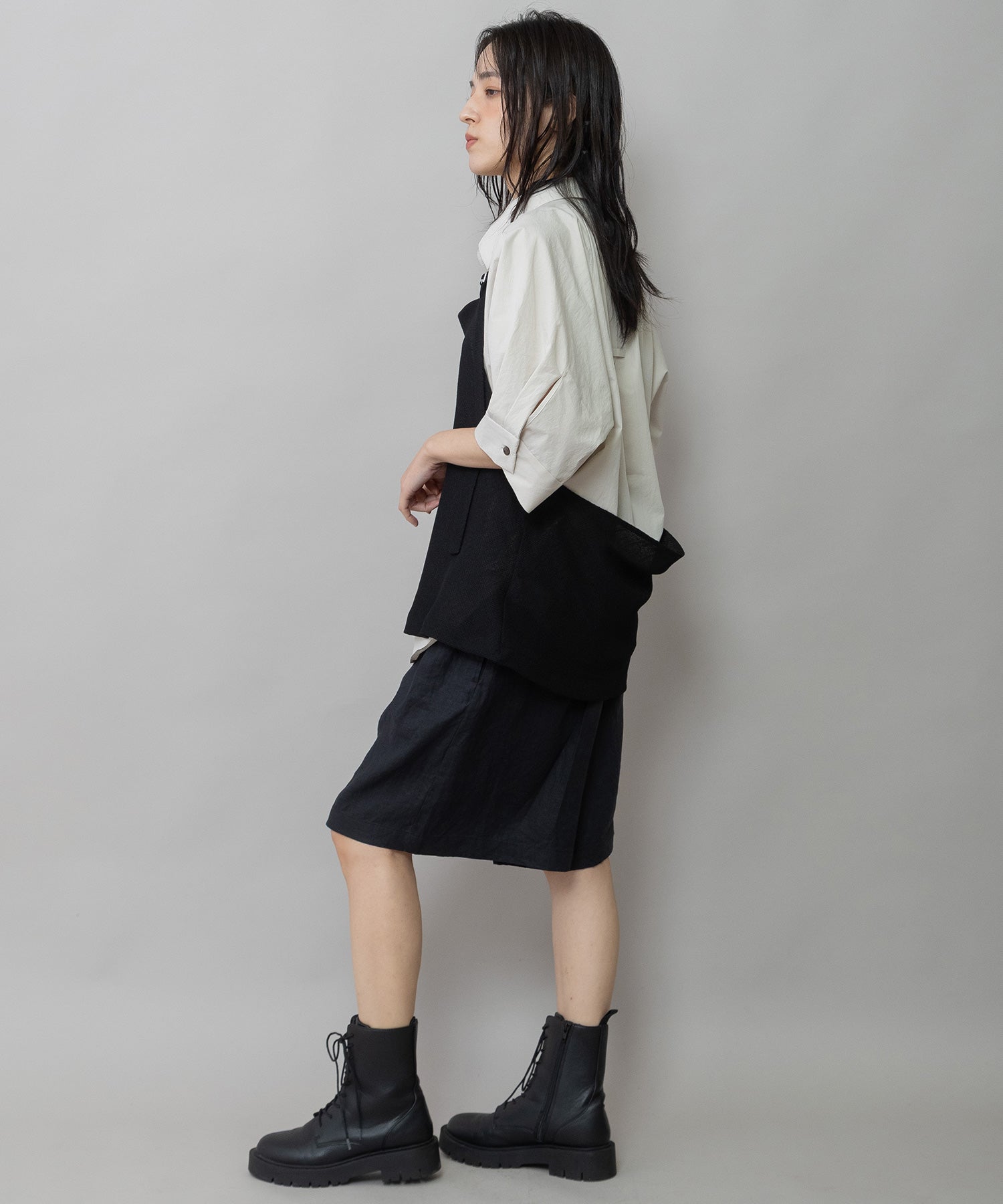 ホルターネックのエプロンみたいな筒をバイアス裁断することで衿元がドレープしたり、重ねて着る際に落ちたり分量が留まったりし、ニュアンスが出やすいように仕立てました。