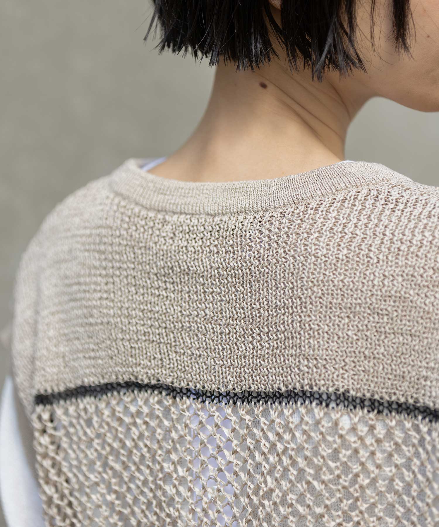 長袖ですが程良いゆとりのあるサイズ感で、編地がスカスカなので、風通しも良く涼しく着られるのがポイントで、肌寒い時期はスカシ編みからインナーを覗かせるコーディネートも楽しめそうです。