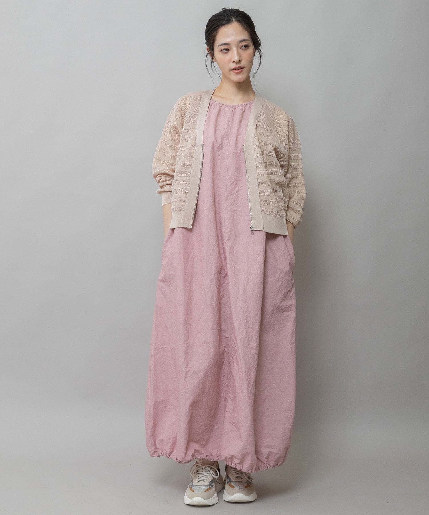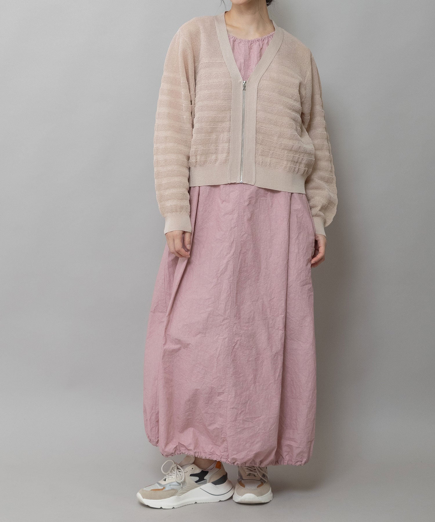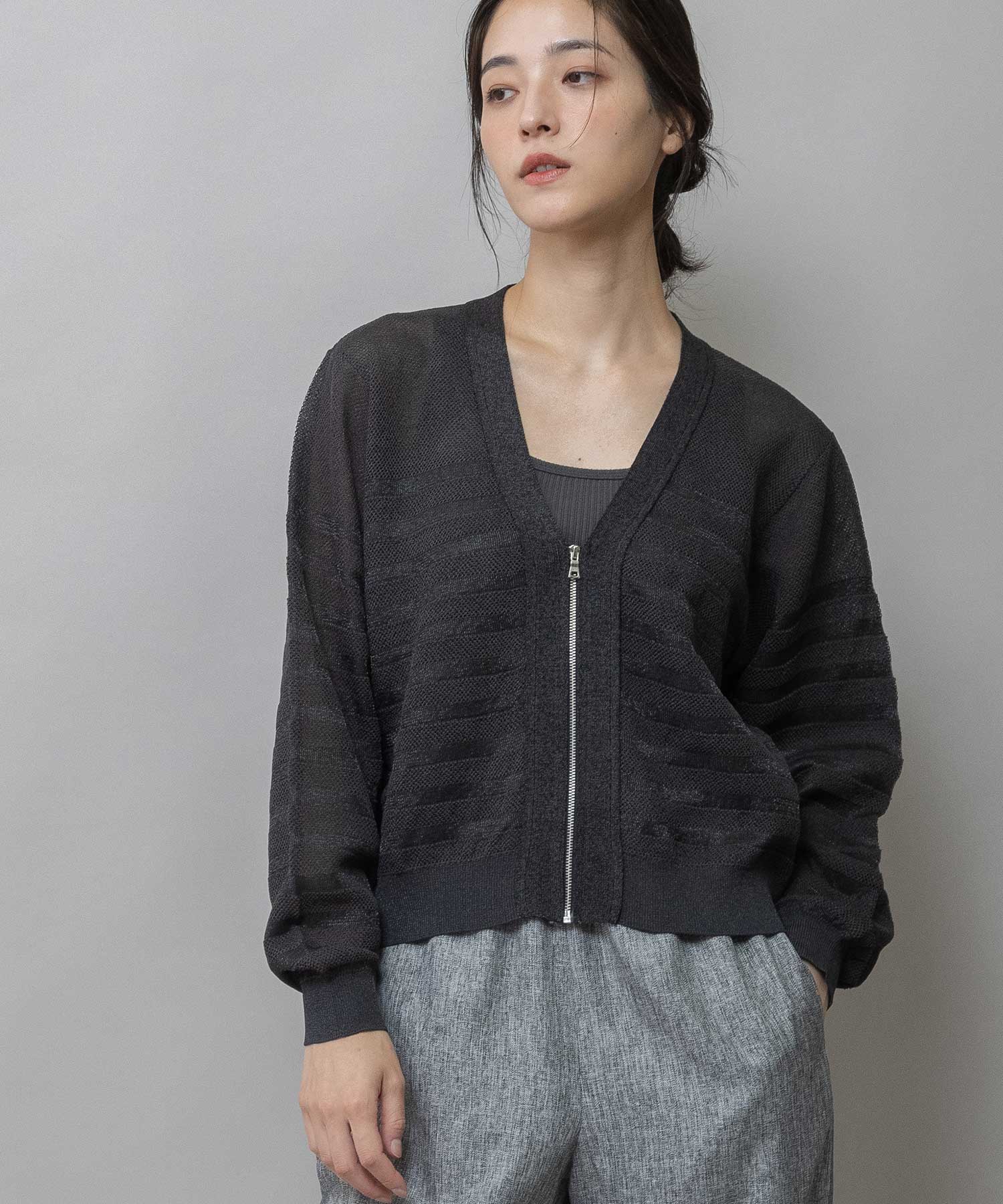 フロントのジップあき&衿からつながる編立のニットテープですっきりした印象をプラスしています。