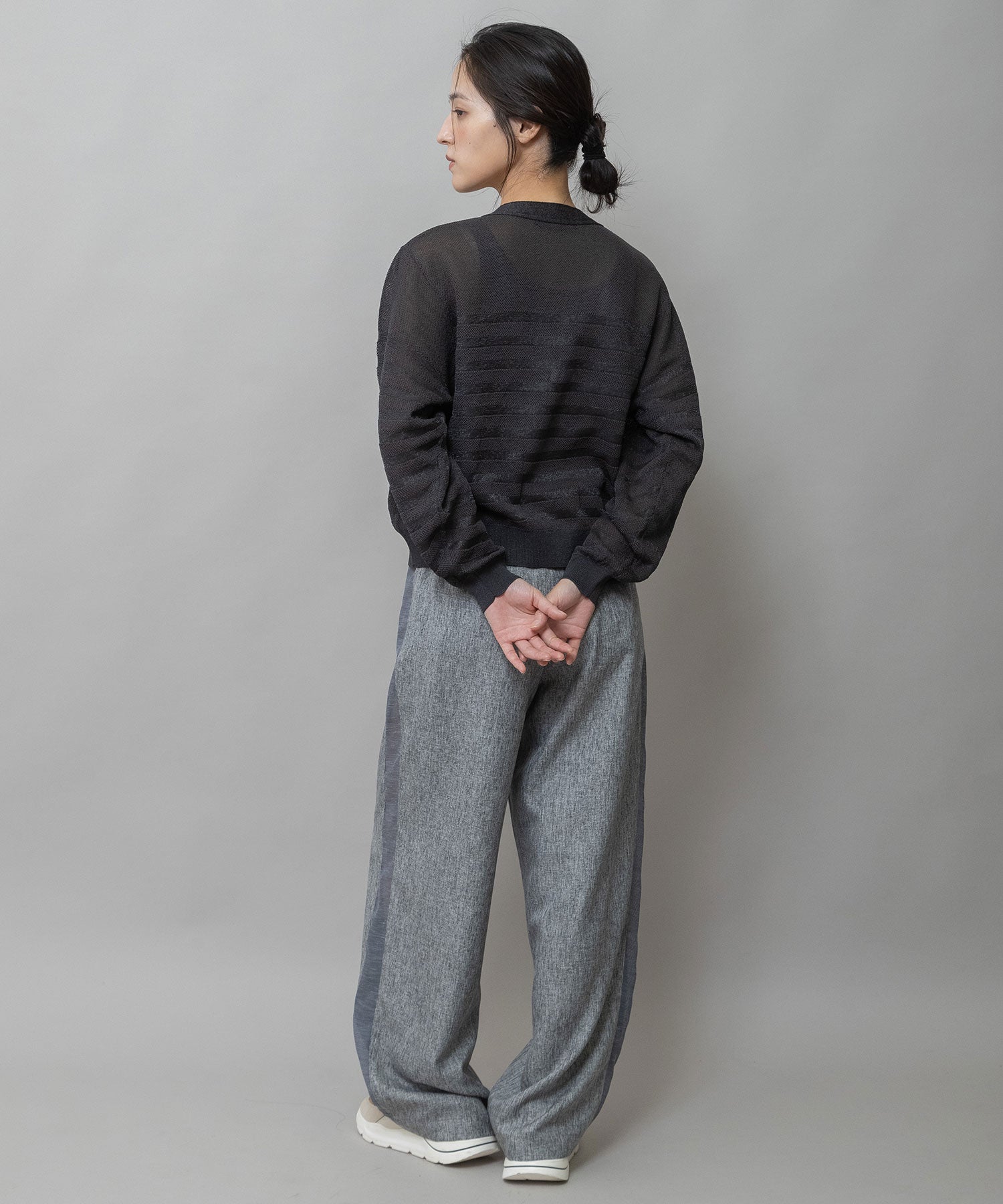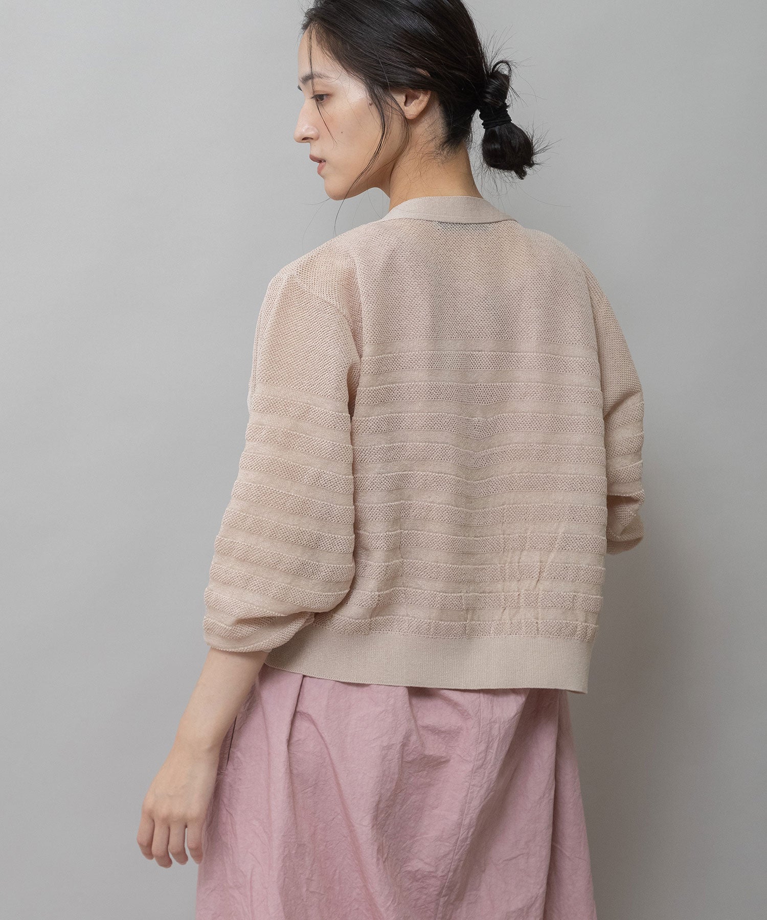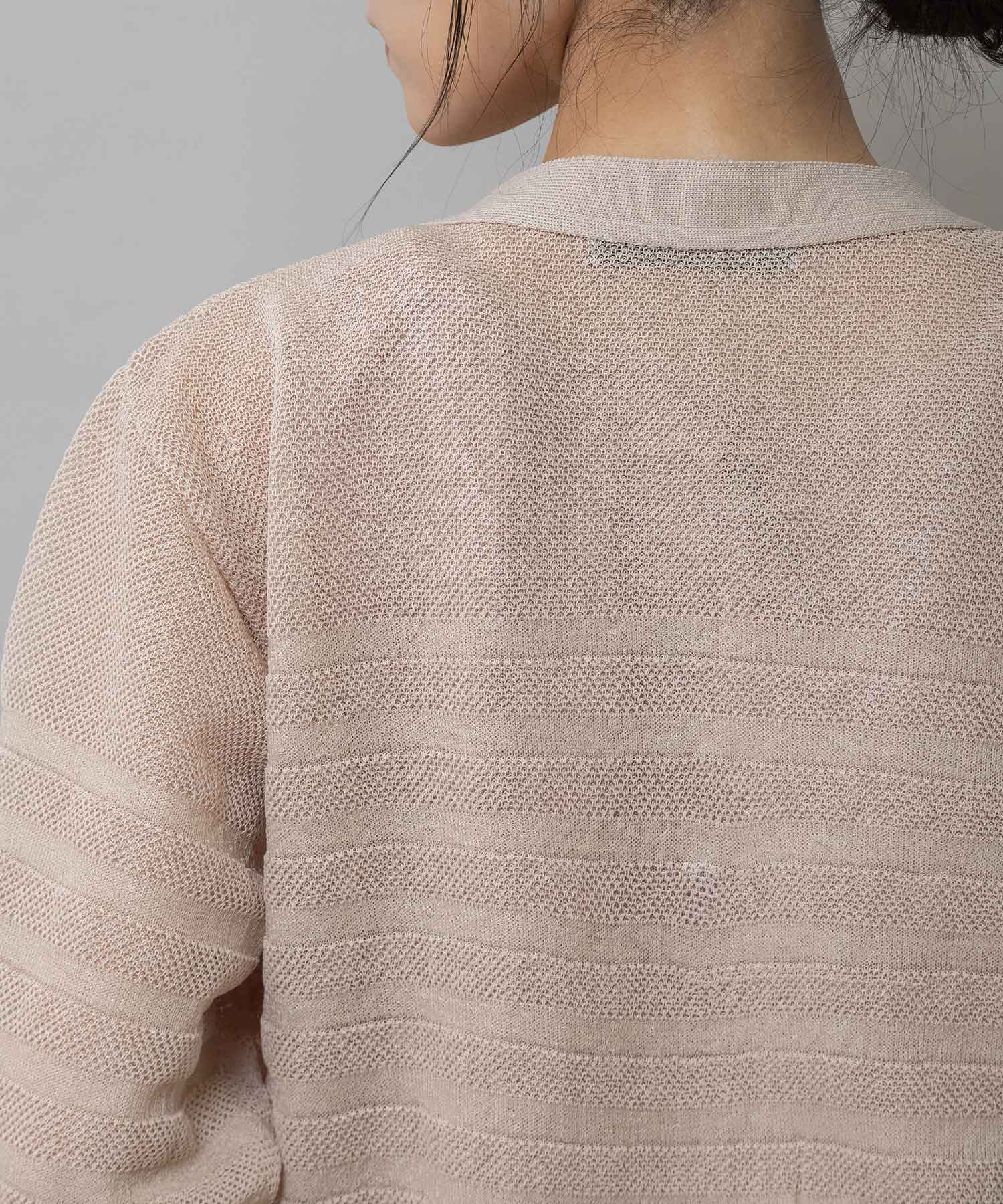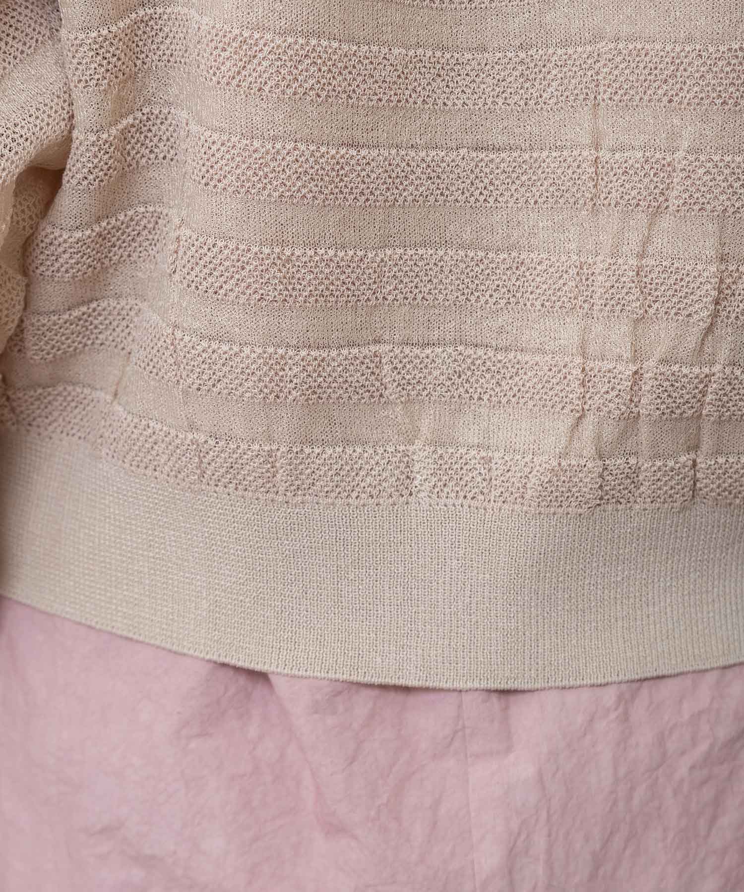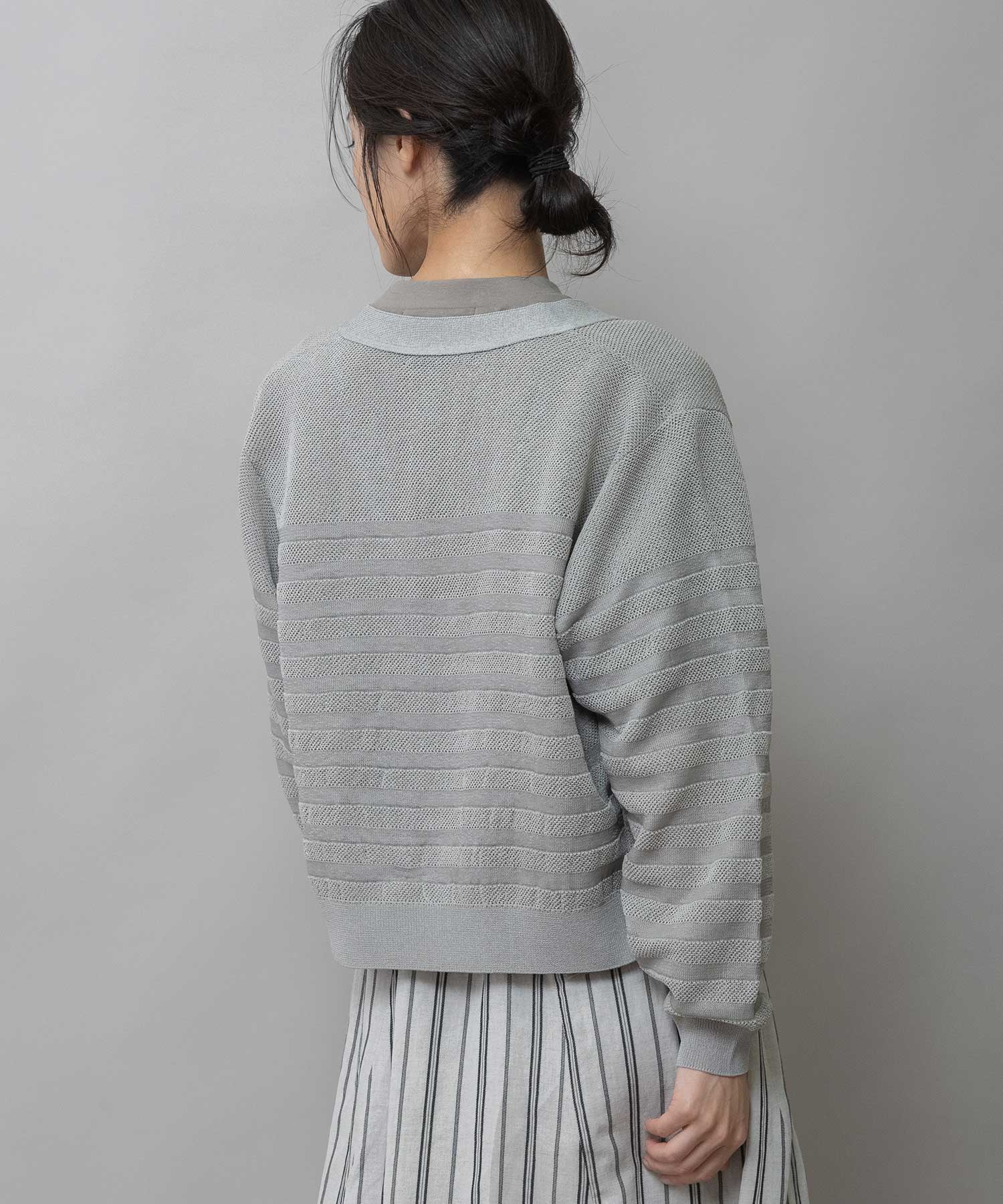 透け感のないオーソドックスなストレートヤーンと透け感のある極細な糸を、同色系で組み合わせたメッシュジャガードボーダー。