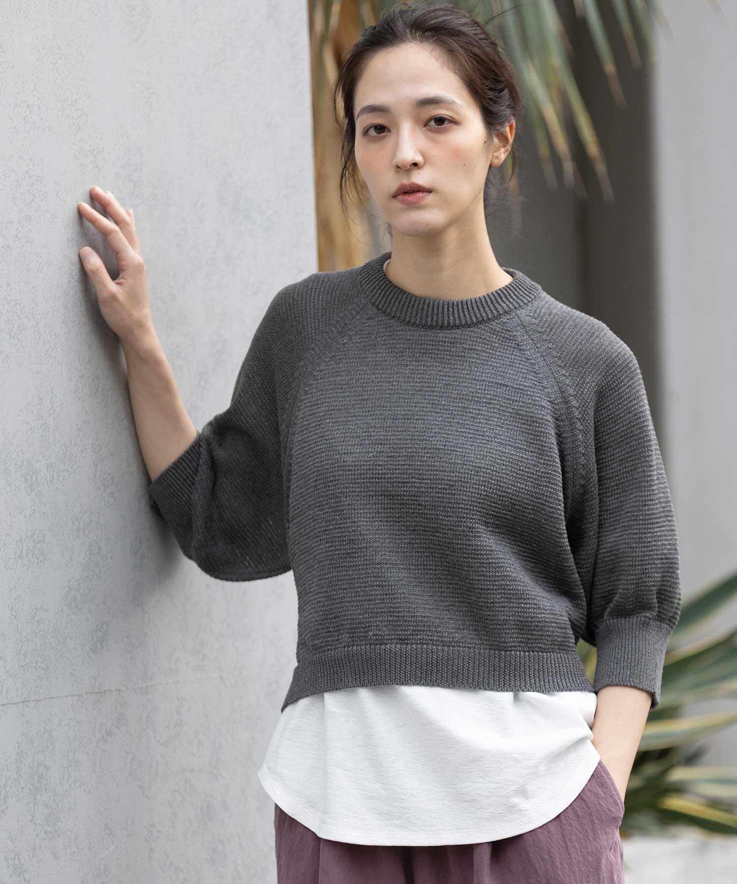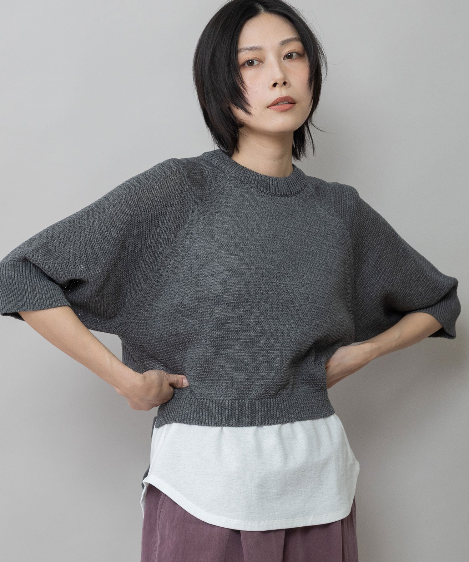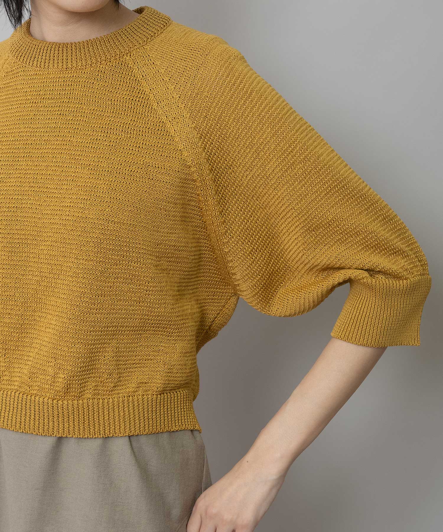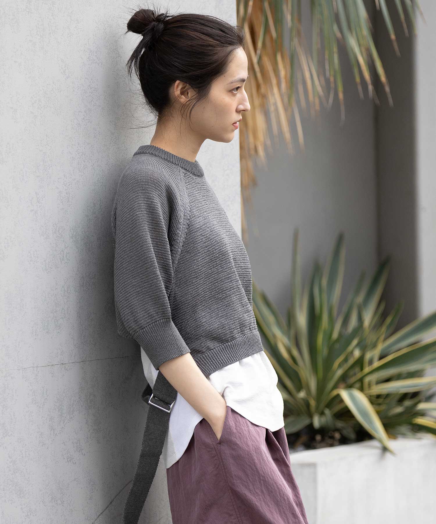 コンパクトな丈感に、ひじが隠れる大人袖を組み合わせてバランスを取り、トレンド感あるトップスに仕上げました。