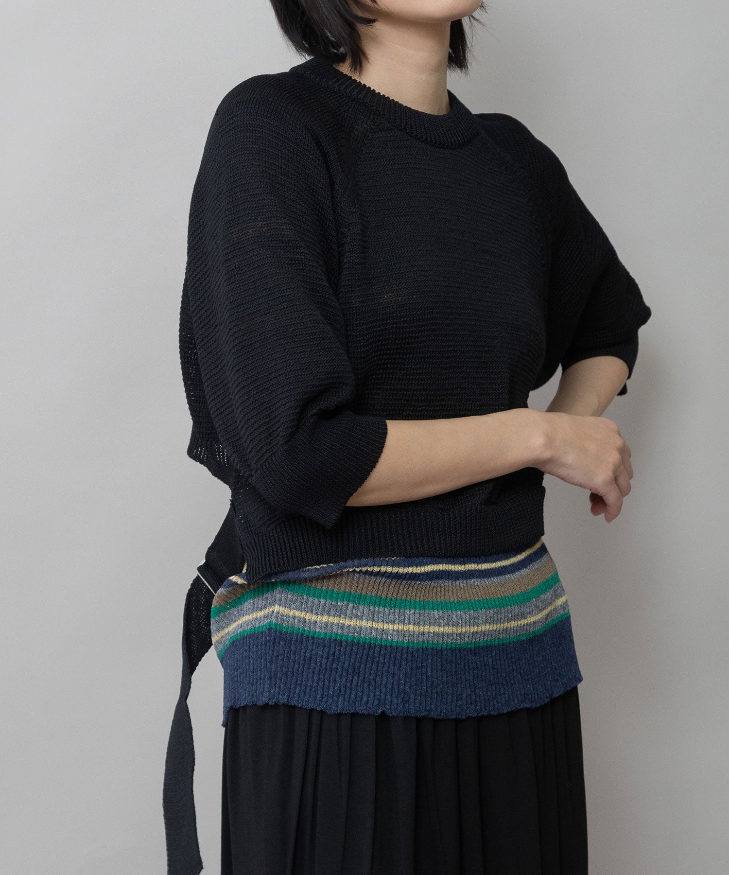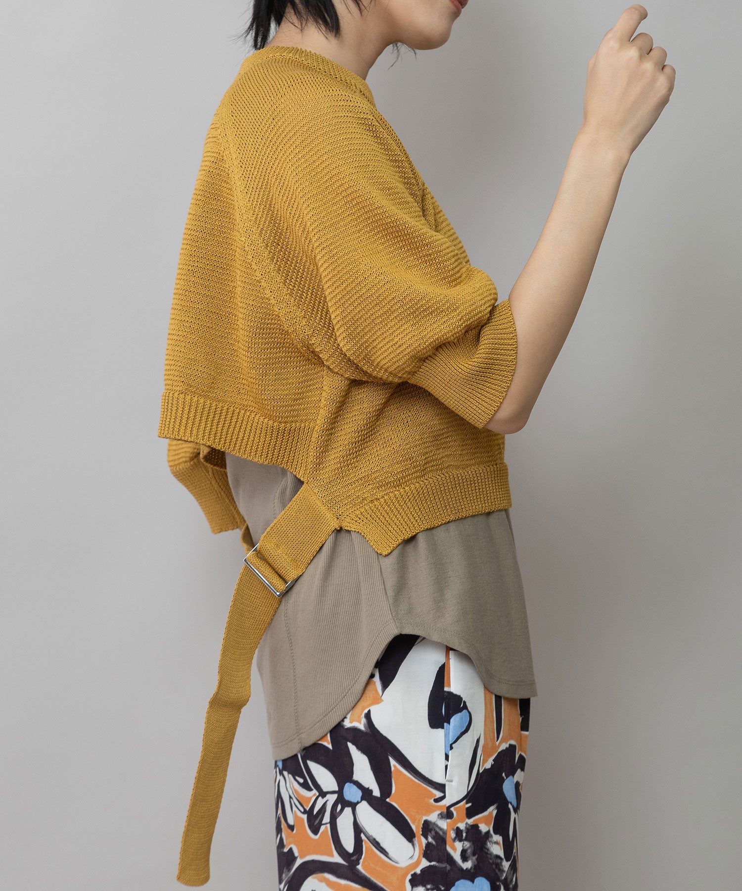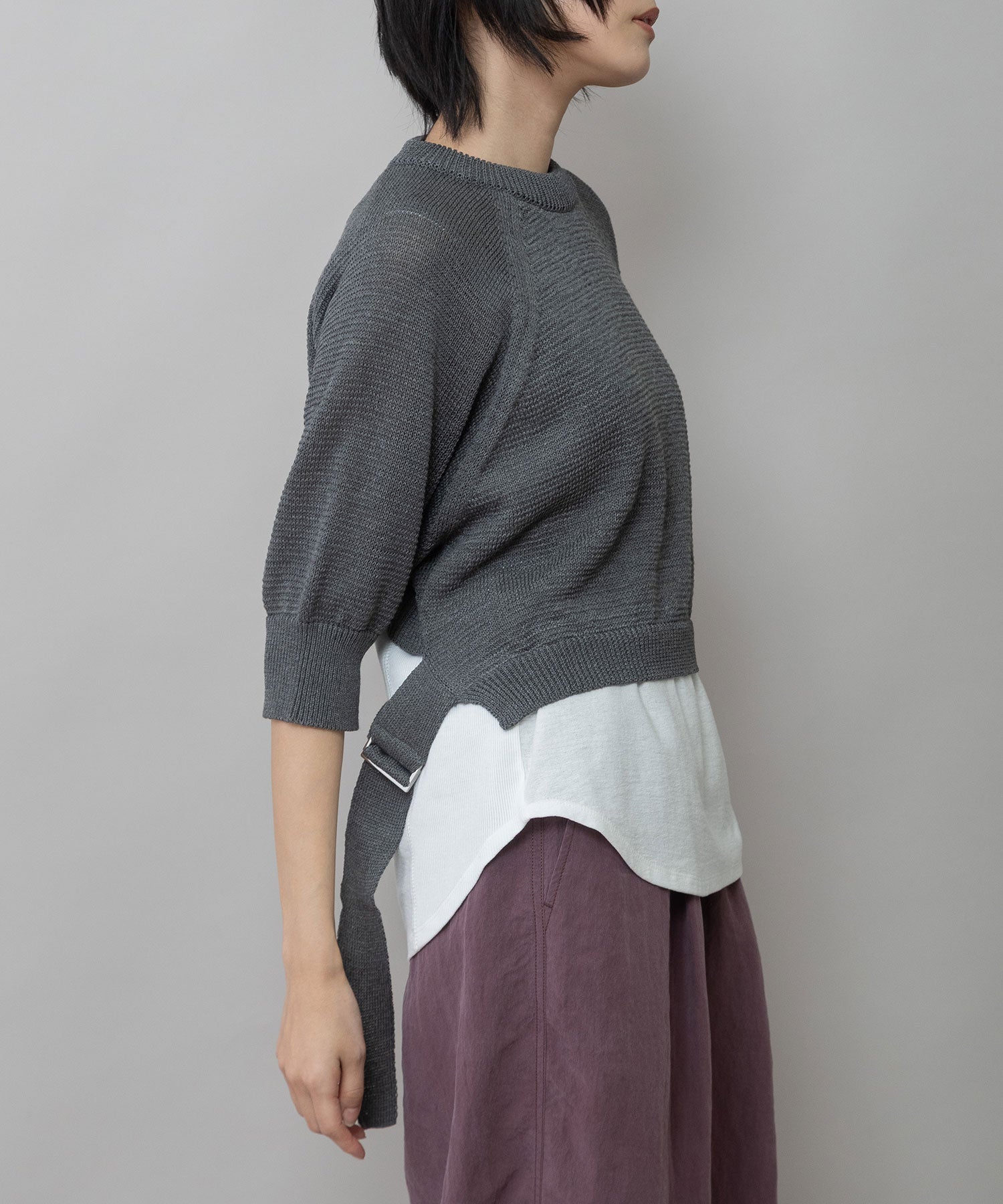長めのニットテープとDカンのディティールで、シルエットに変化を付け、バックスタイルに抜け感を加えたニットプルオーバー。