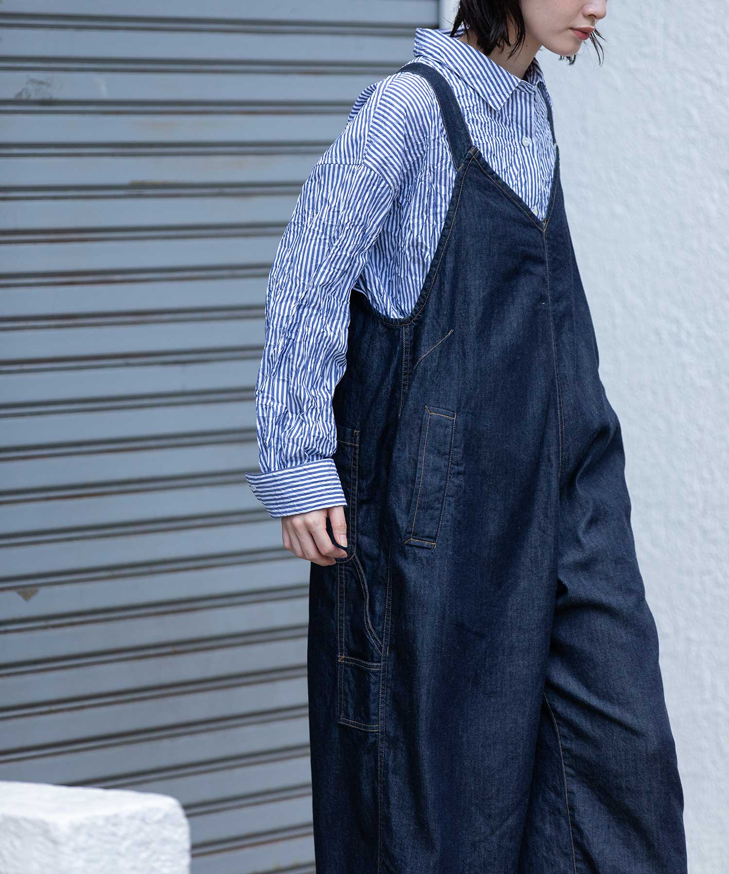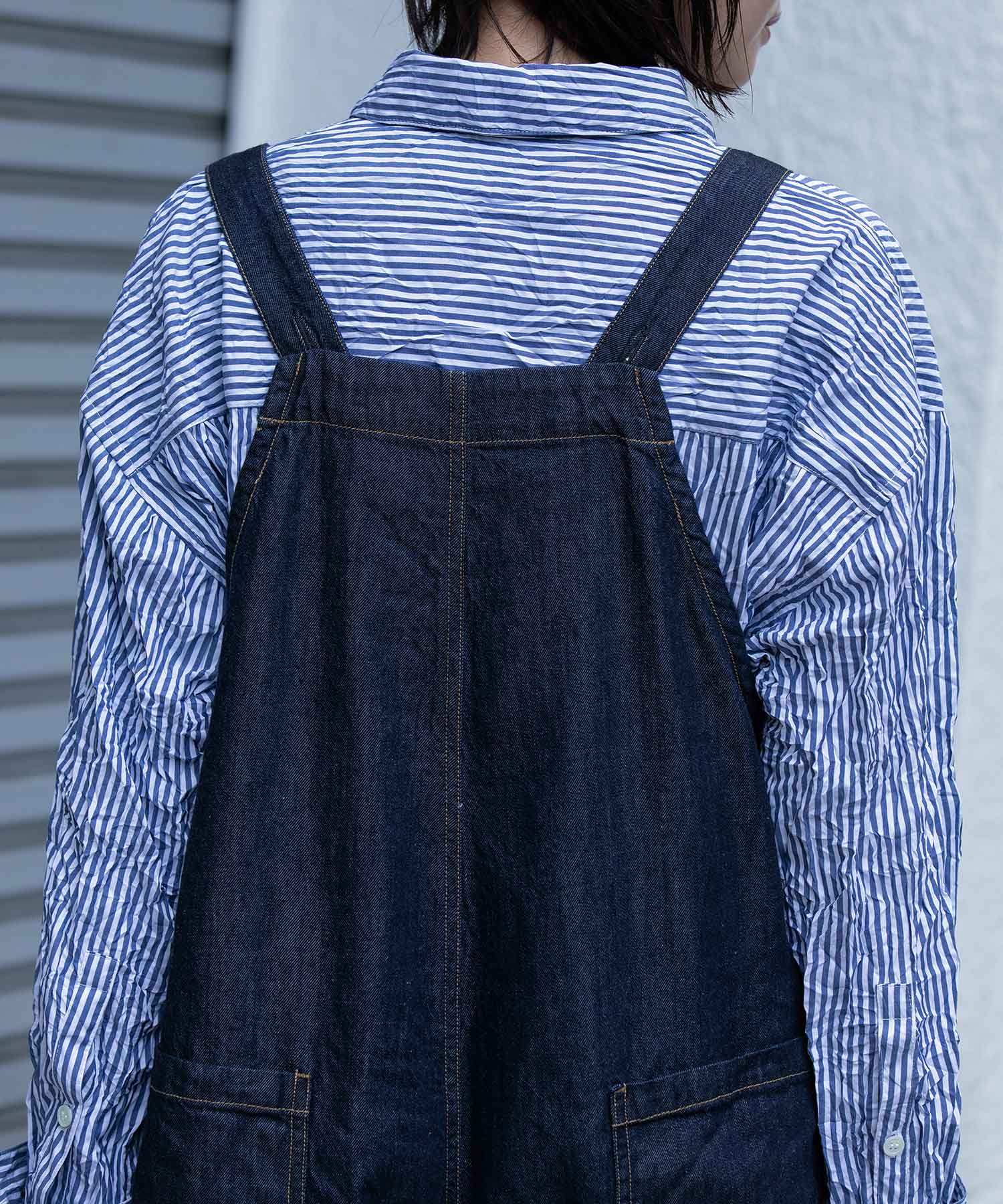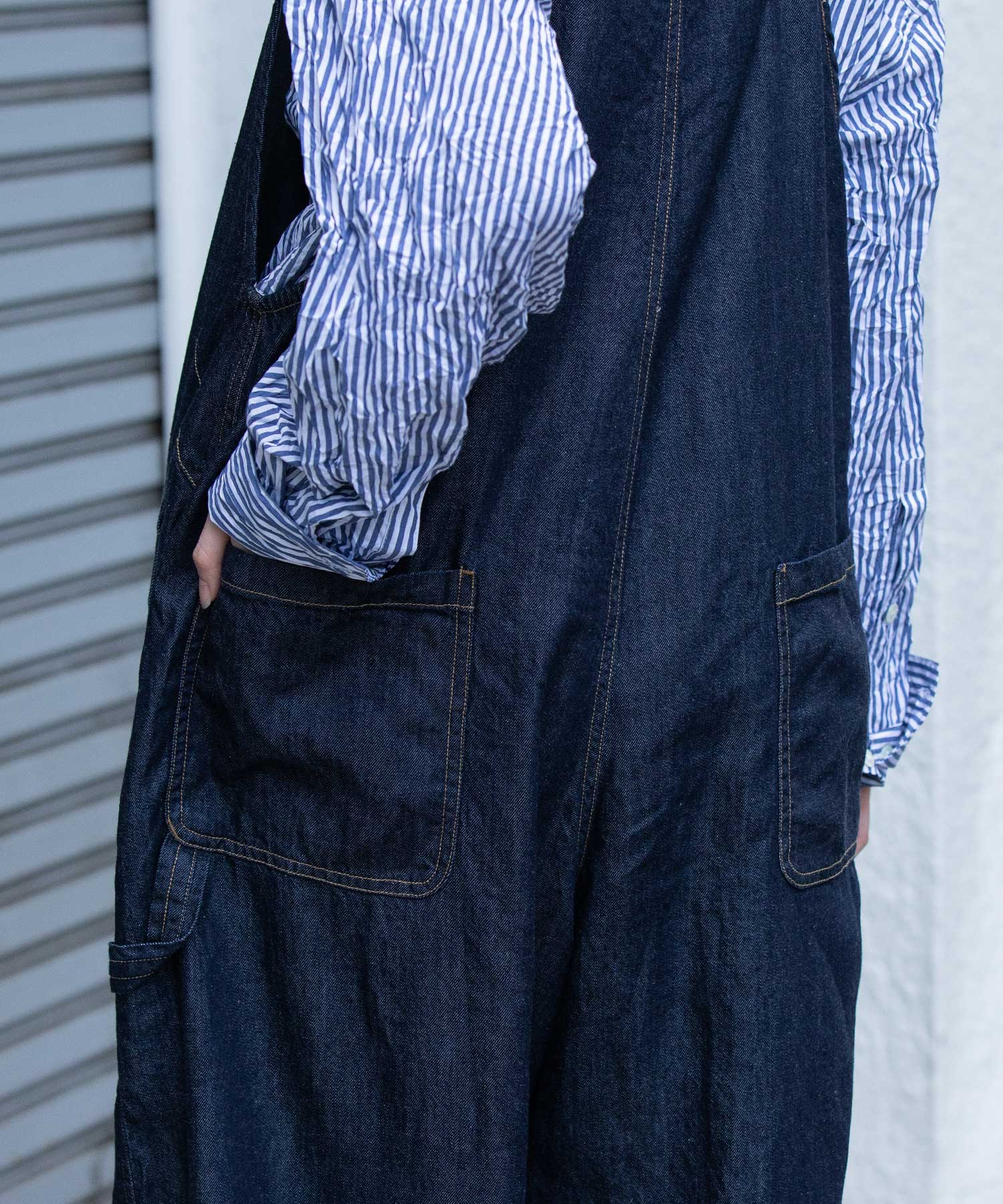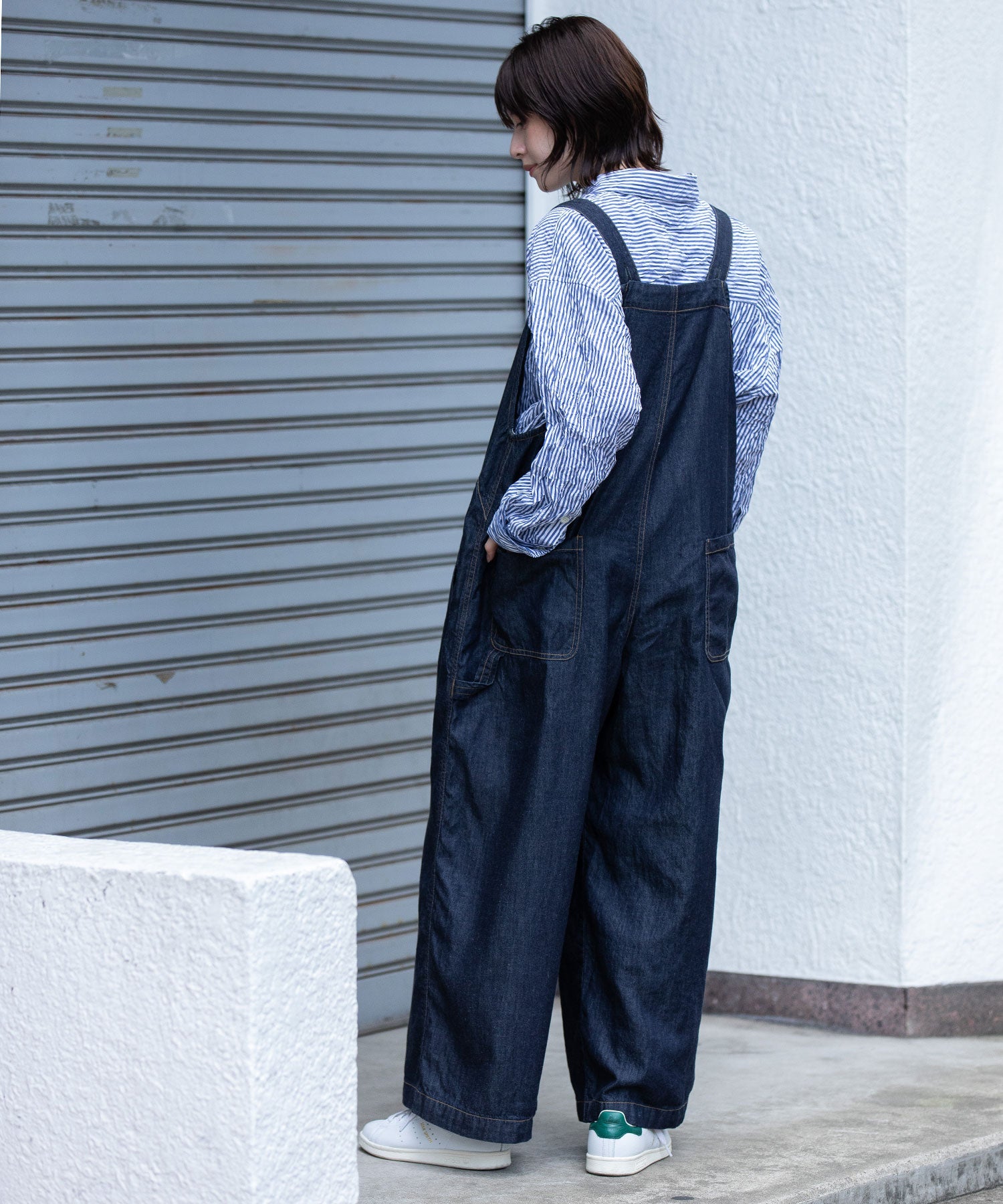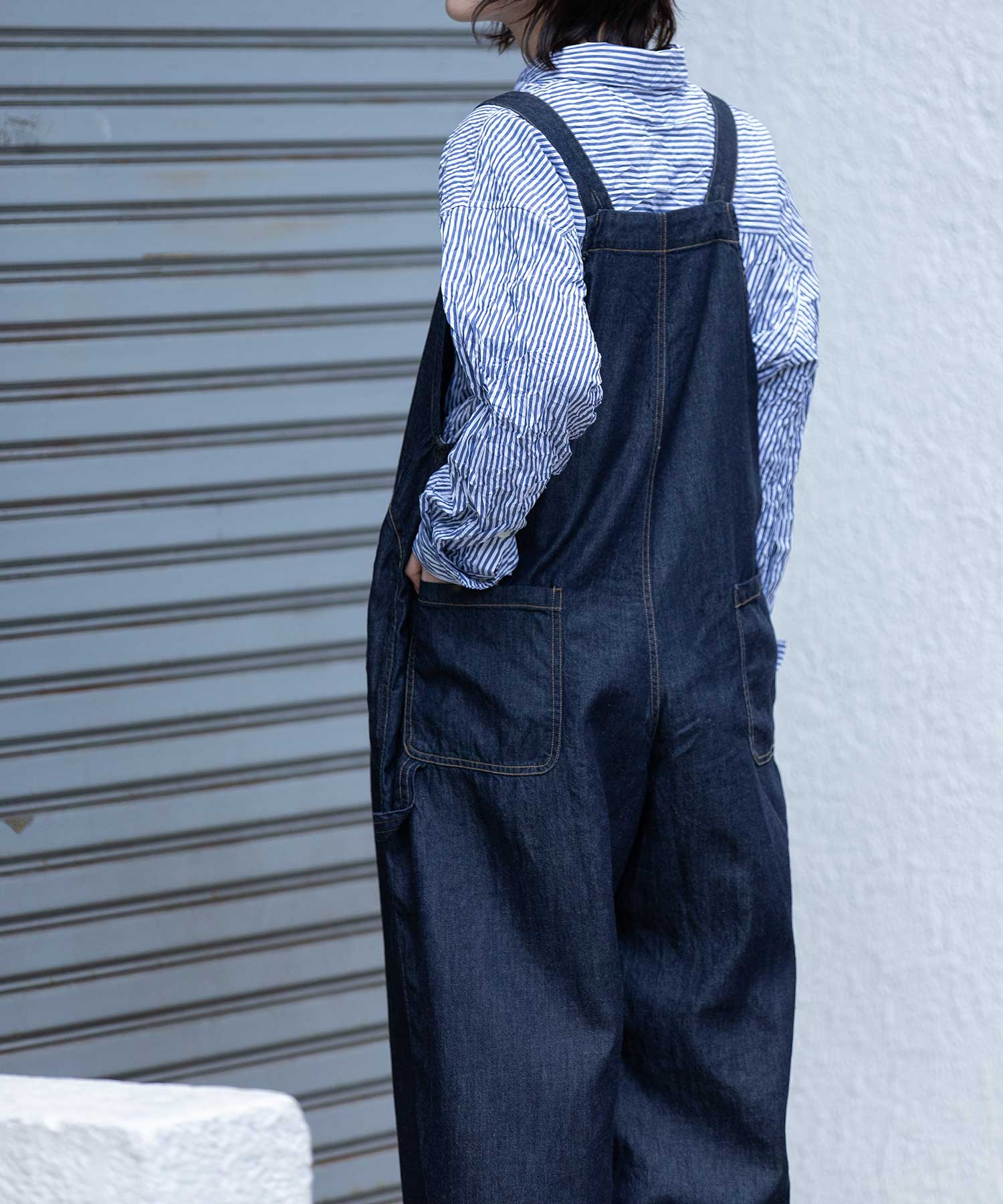 量感のあるボリューミーなオーバーオールですが、リヨセル混のデニム使いなので着用時は程よくドレープが効いて落ち着いたシルエットになります。