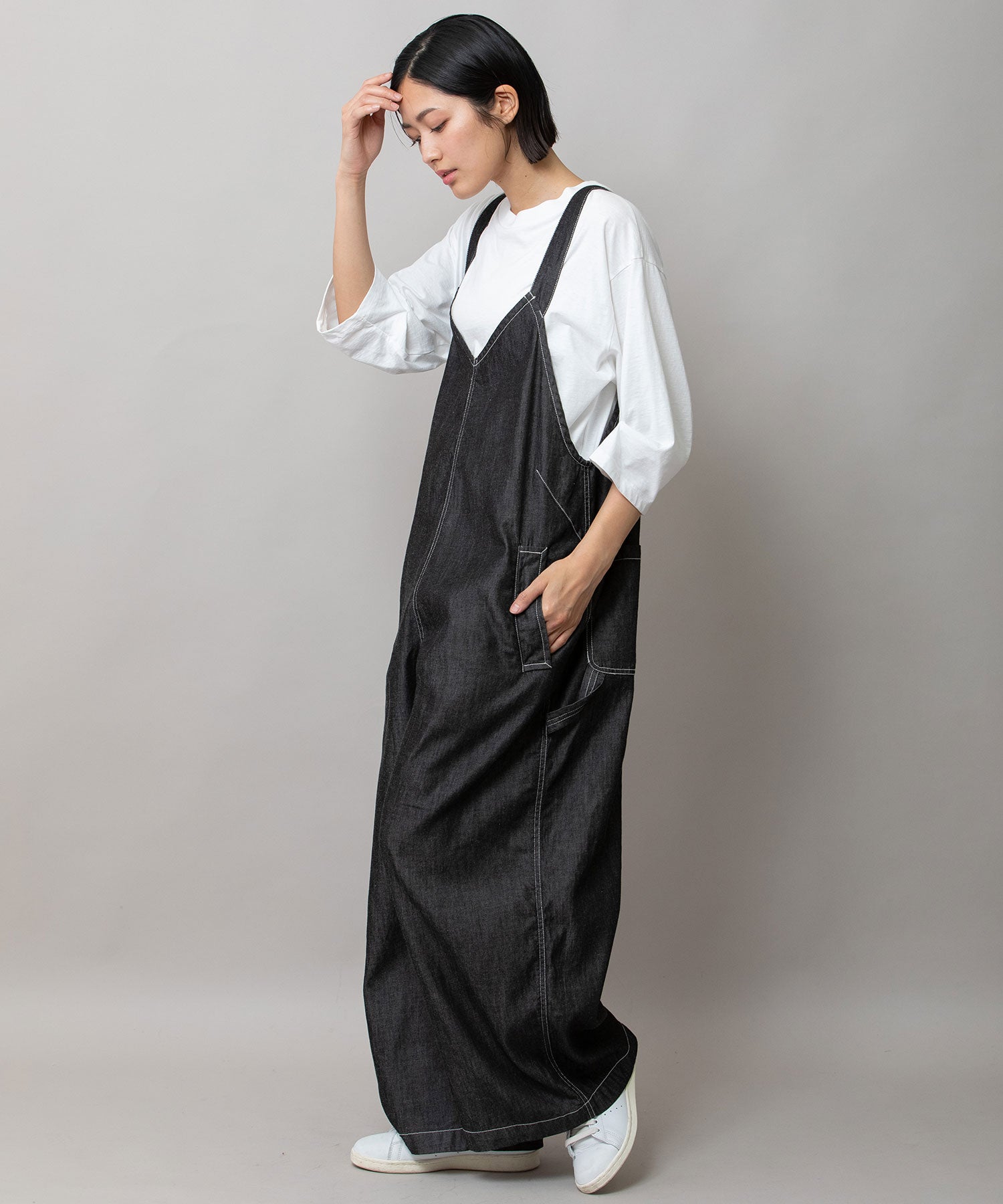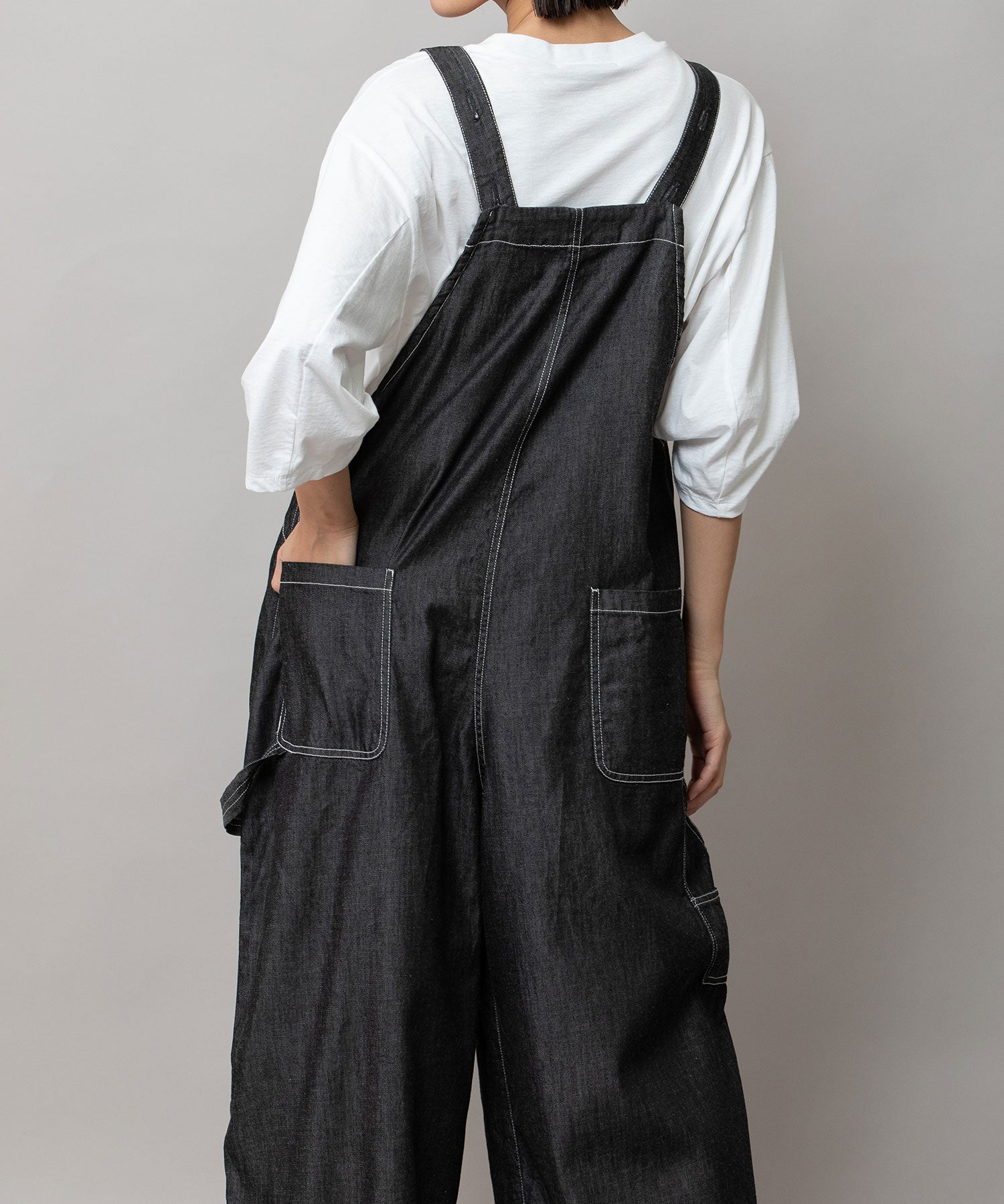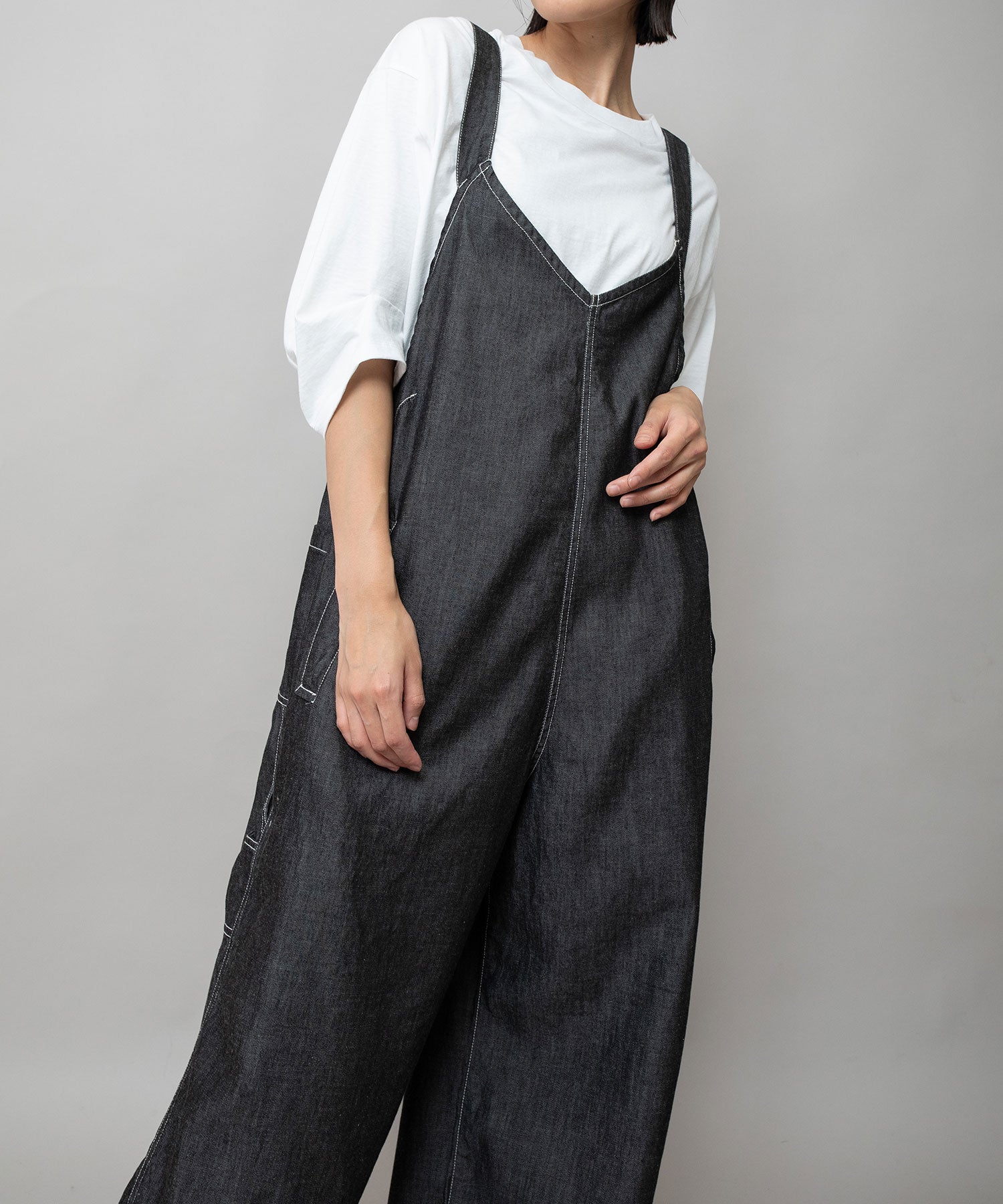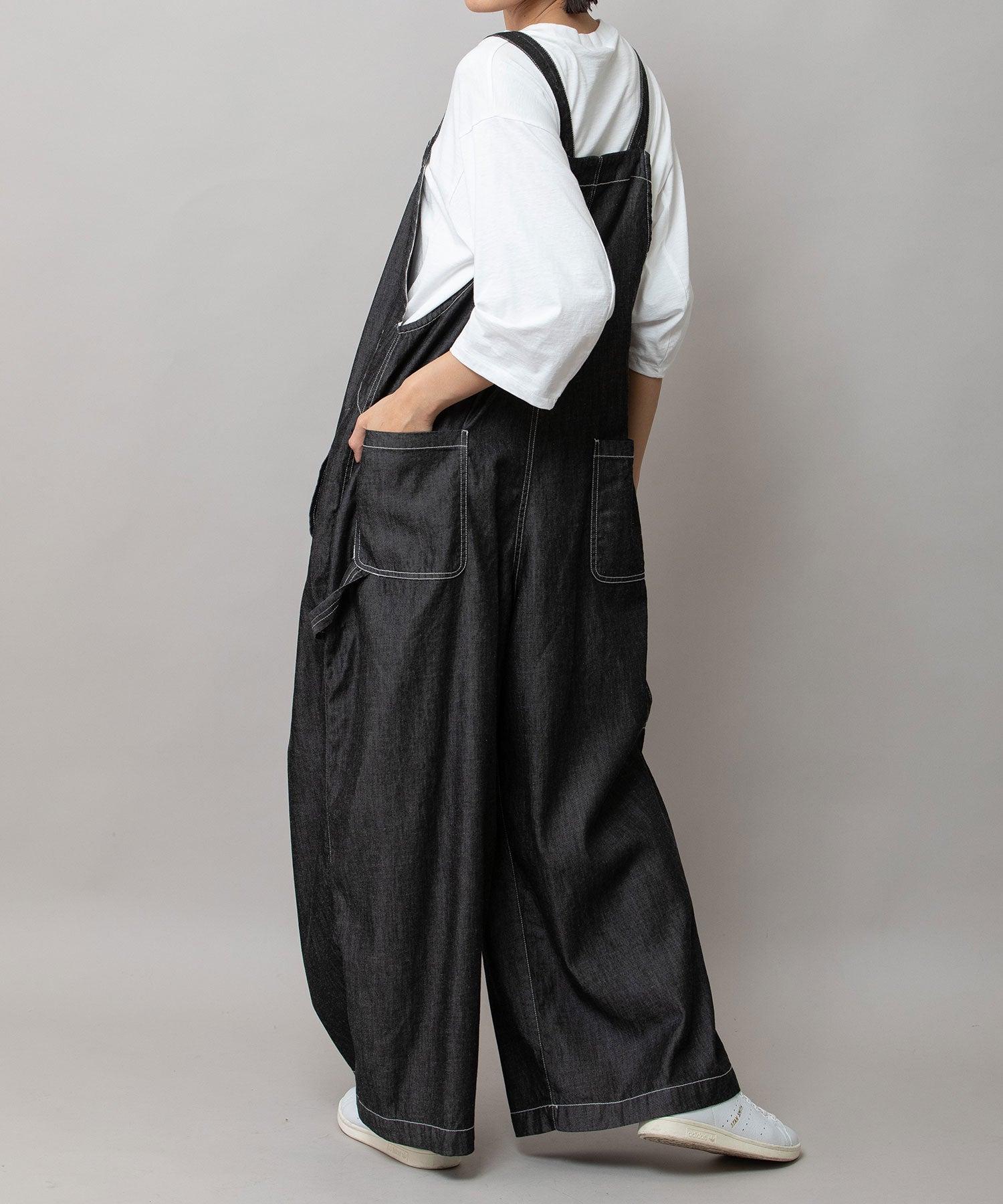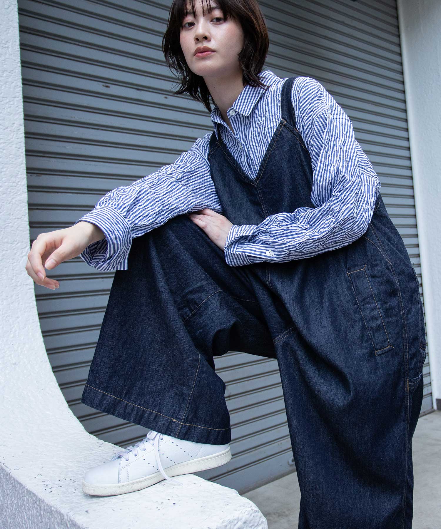 量感のあるボリューミーなオーバーオールですが、リヨセル混のデニム使いなので着用時は程よくドレープが効いて落ち着いたシルエットになります。