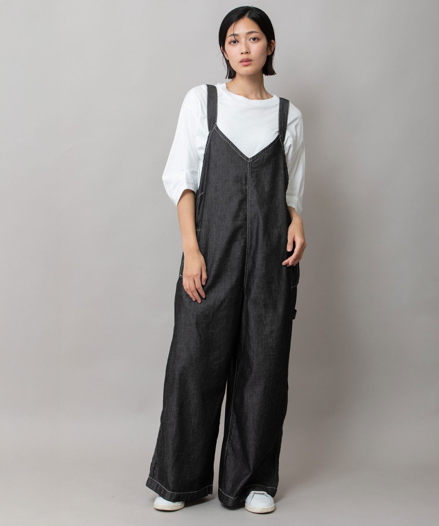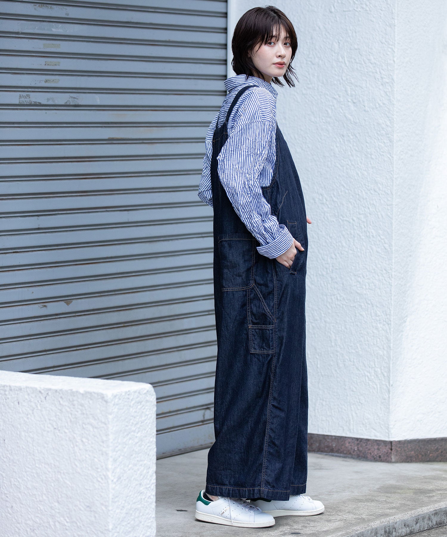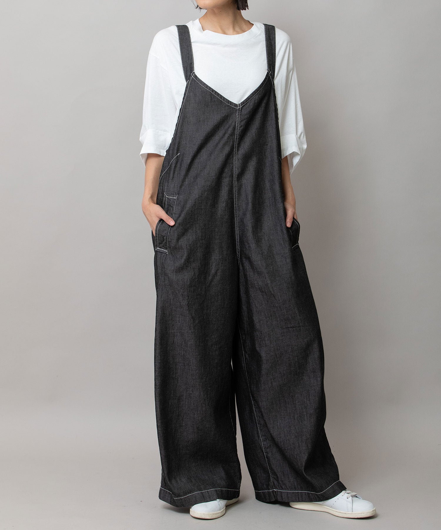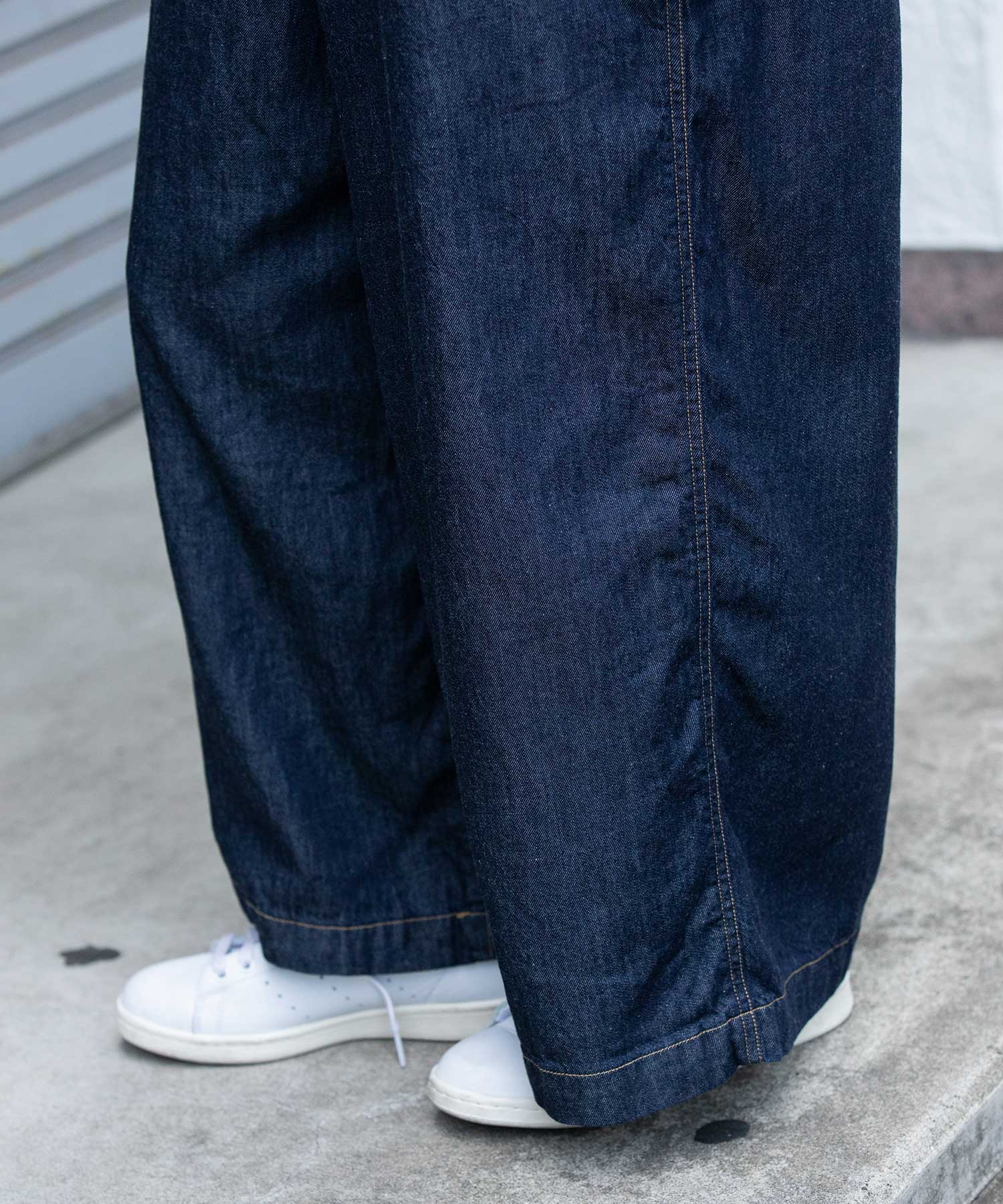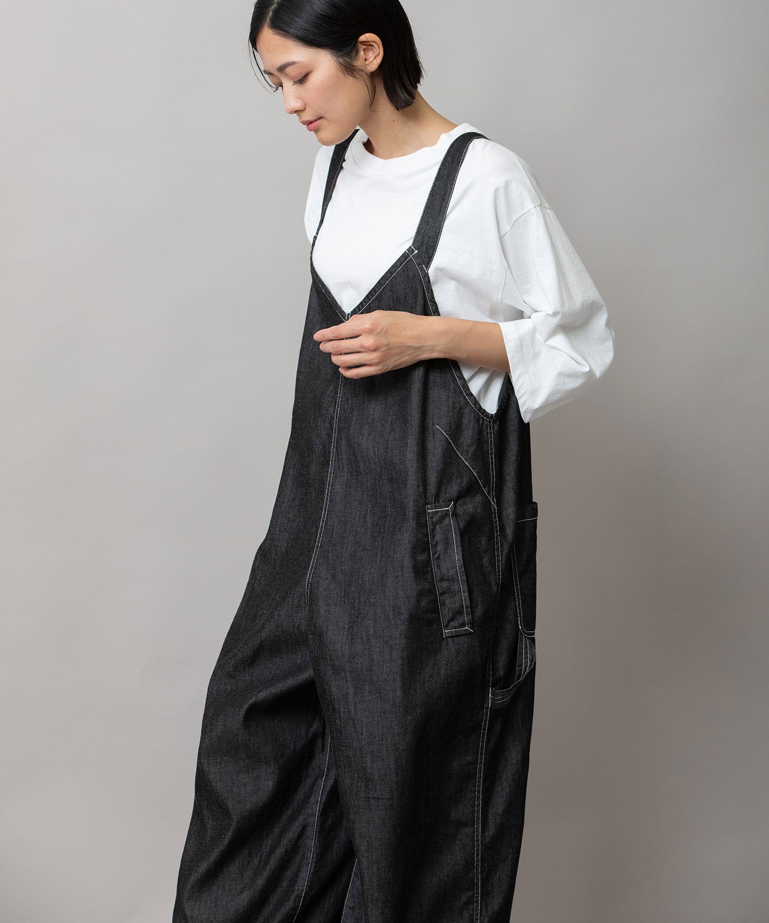 量感のあるボリューミーなオーバーオールですが、リヨセル混のデニム使いなので着用時は程よくドレープが効いて落ち着いたシルエットになります。
