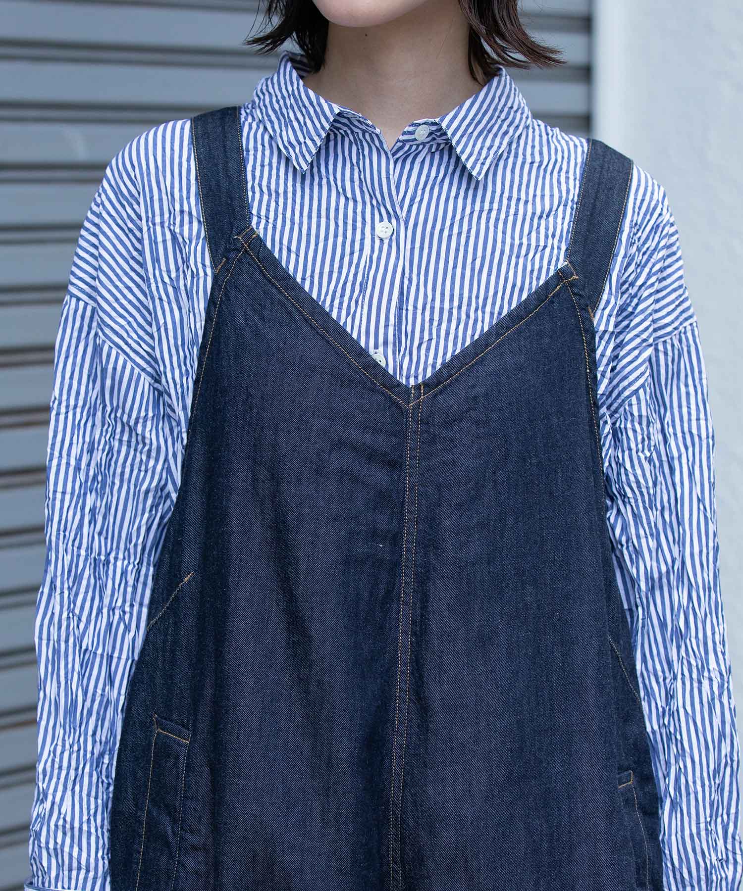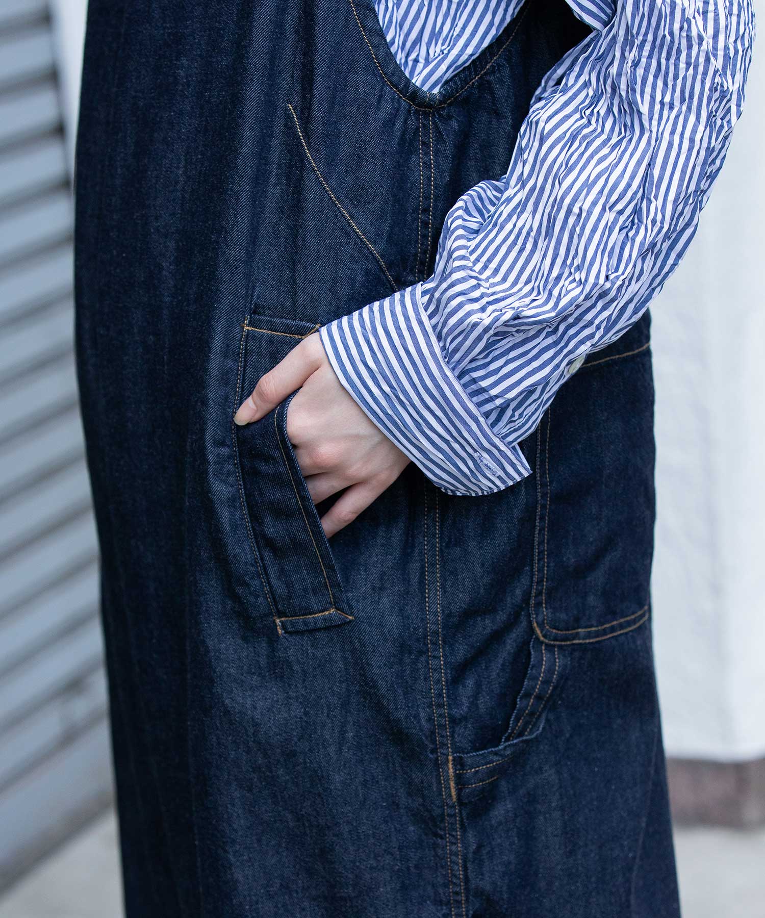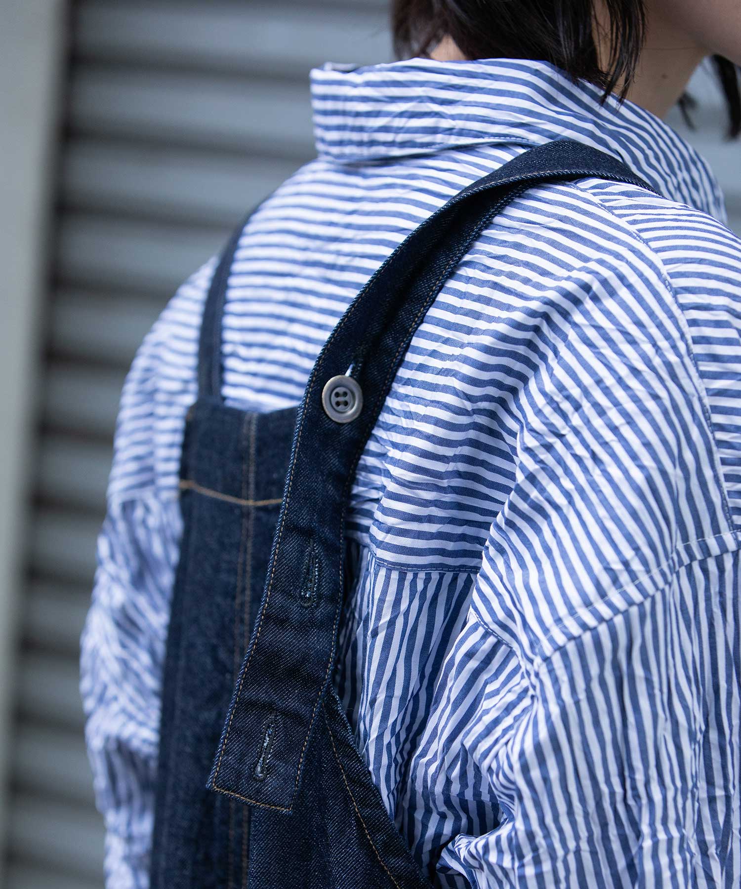 キャミドレス的な胸元のカットとバックポケットのハンマーループやスケールポケットなどワークのディテールを組み合わせてテイストミックスしたデザインで、肩帯後ろ側の釦ホールで着脱、長さの調整が可能です。