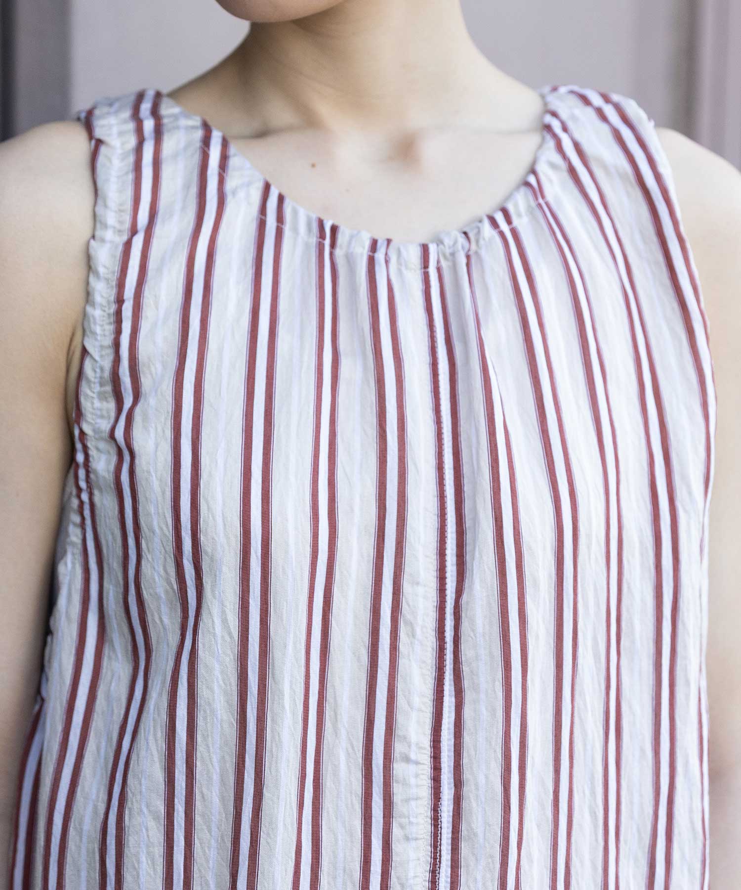 アームホールは固定でゴムギャザーを入れていますが、衿ぐりと裾はゴム&ストッパーが付いているので、ギャザーのボリュームに変化を付けられます。
