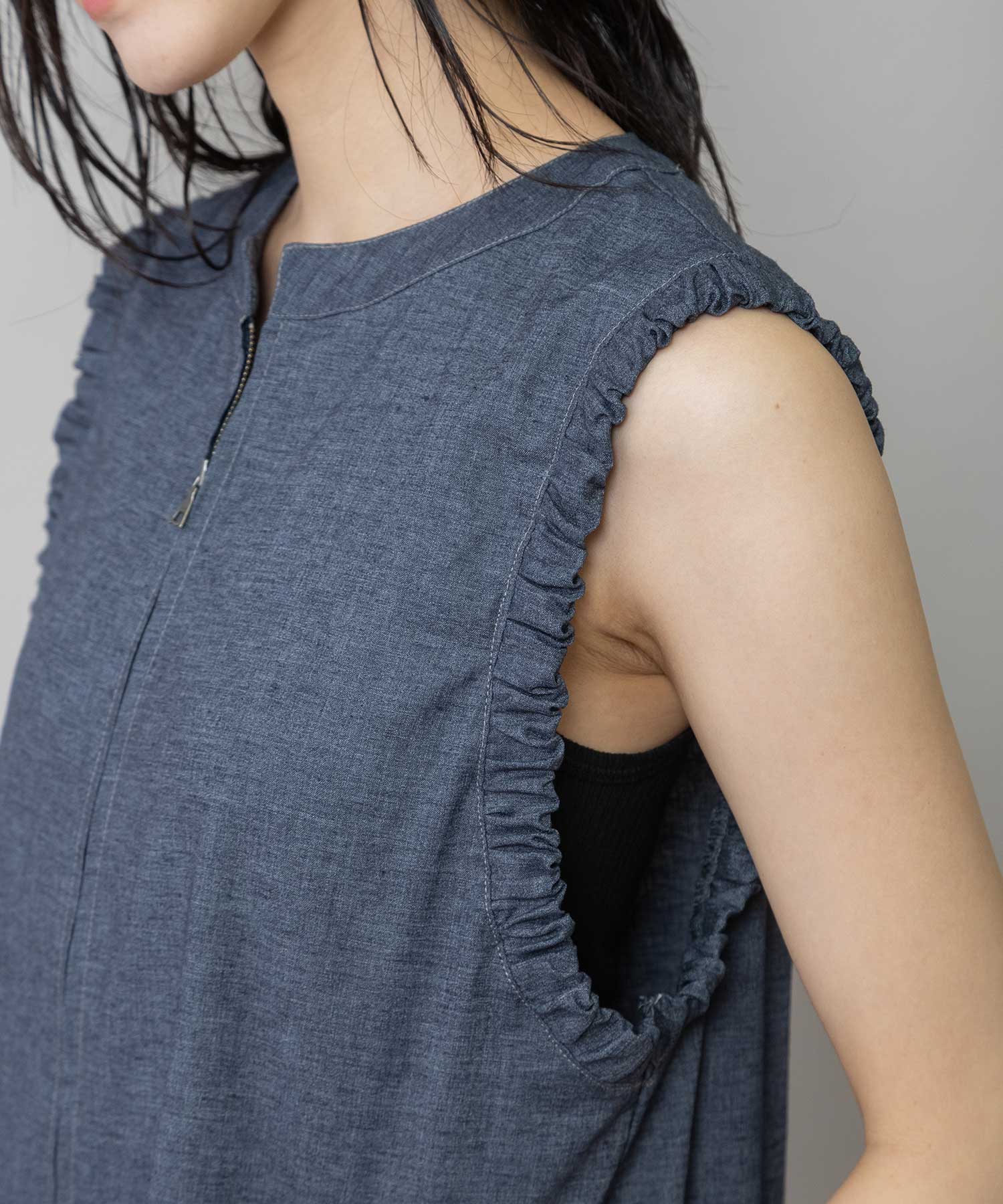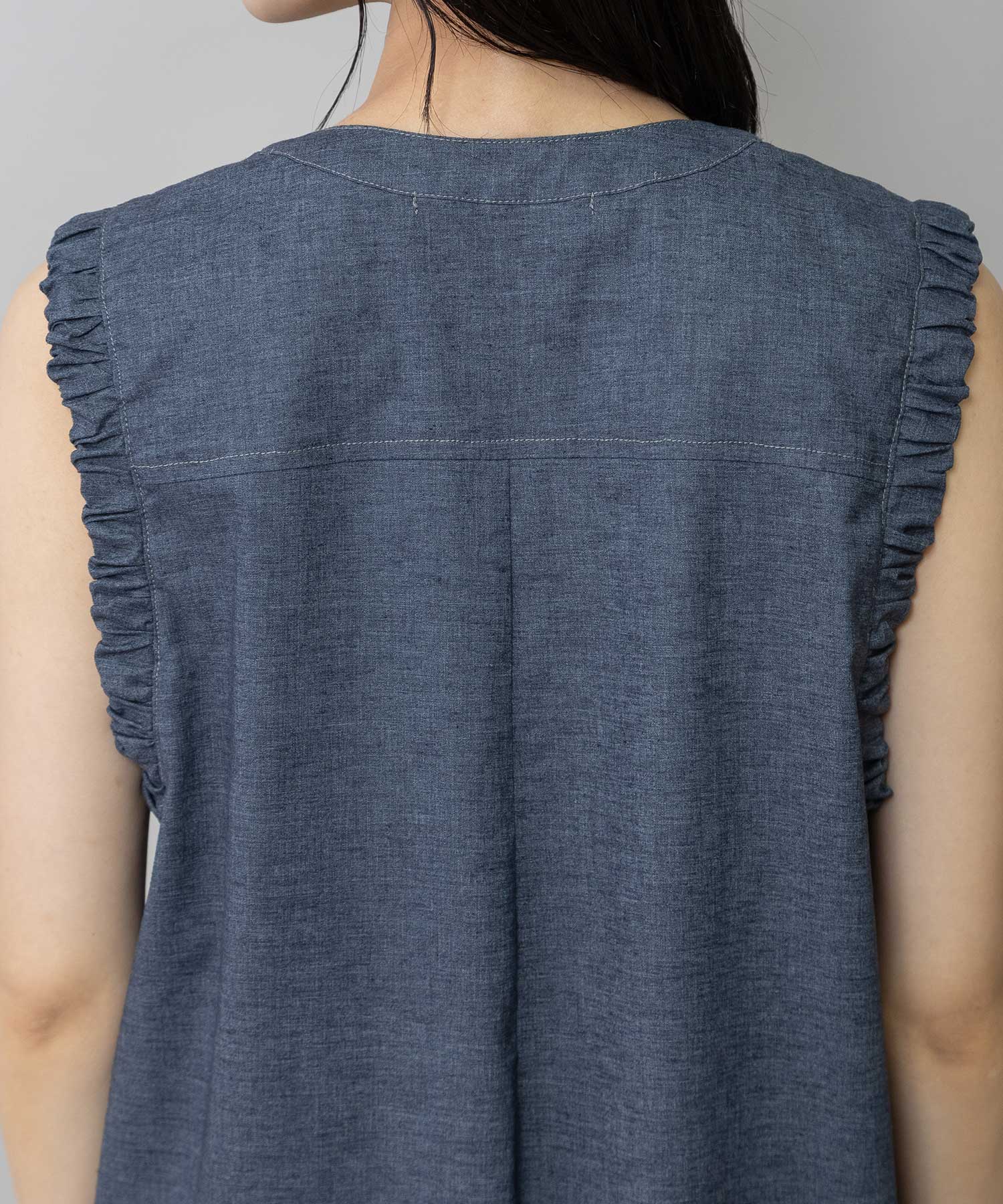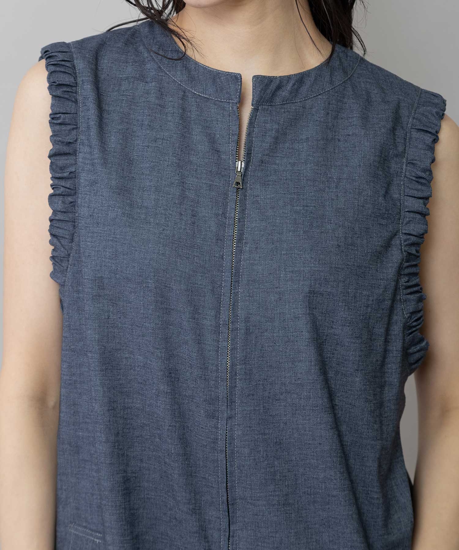 ヘンプシャンブレーが今回ネイビー以外梳毛ライクでフラットな表面感なので、アームホールをゴムギャザーで切替えて女性らしいアクセントをつけています。