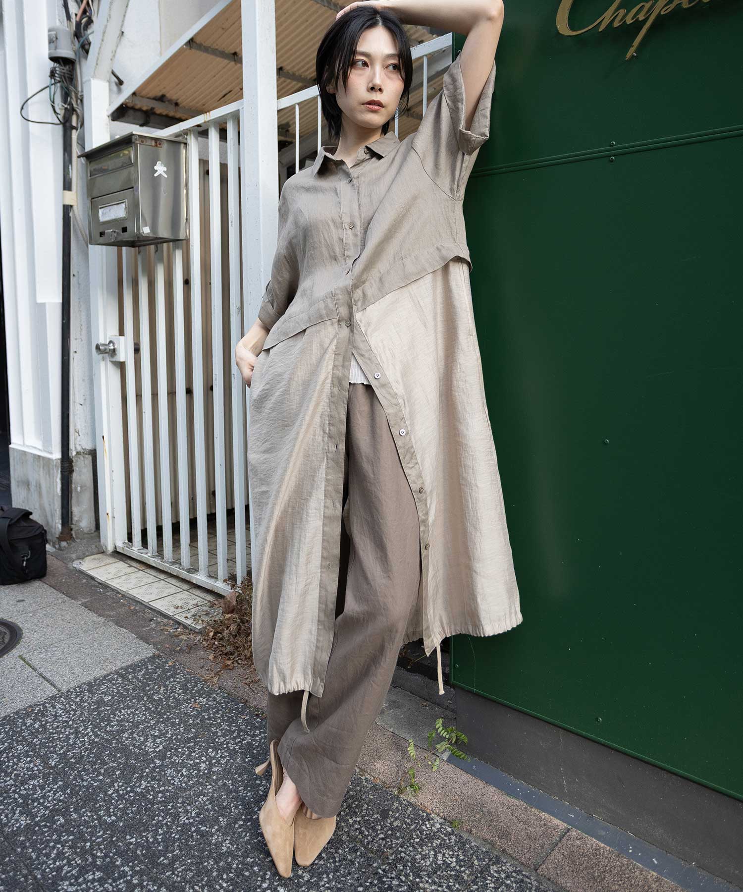 シルエットは全体的にゆったりと着られるサイズに設定し、裾のストレッチコードを絞ってブラウジングすると女性らしいふんわりとした雰囲気にこなせます。長すぎない丈感でワンピースとしてはもちろん、パンツと合わせたスタイリングや羽織としても使えるアイテムです。