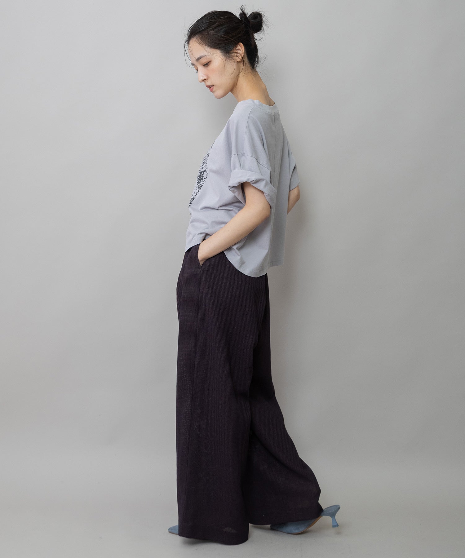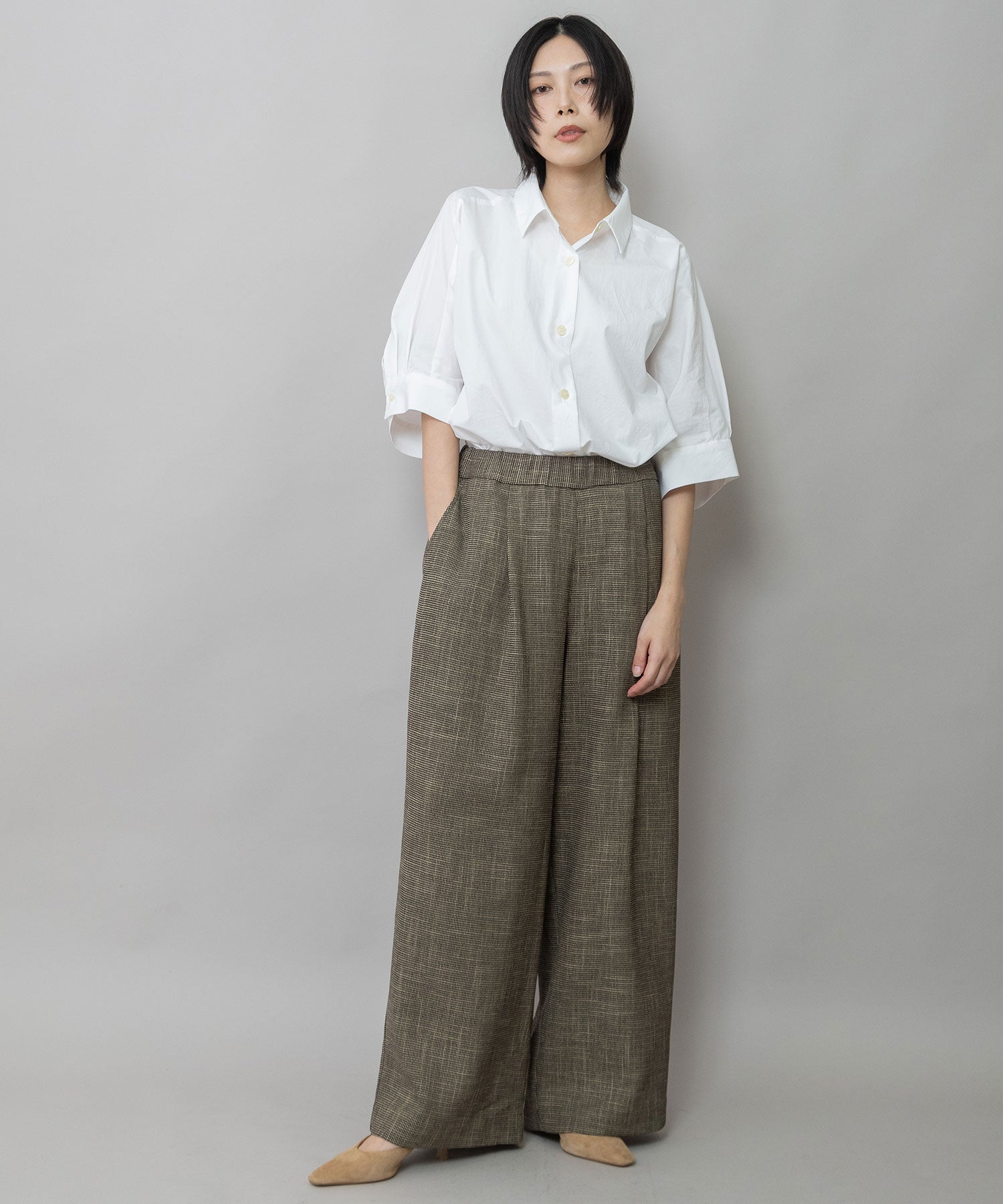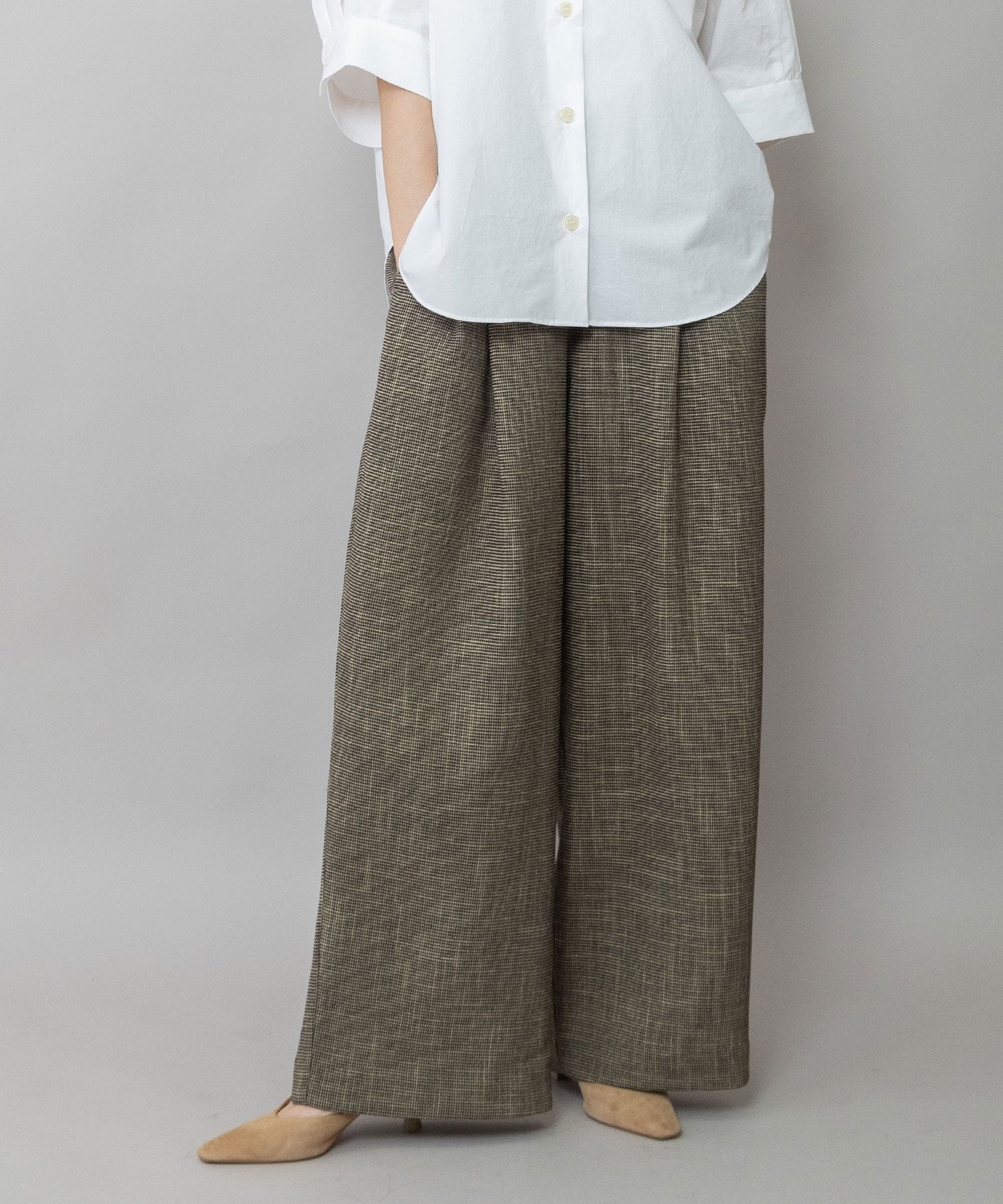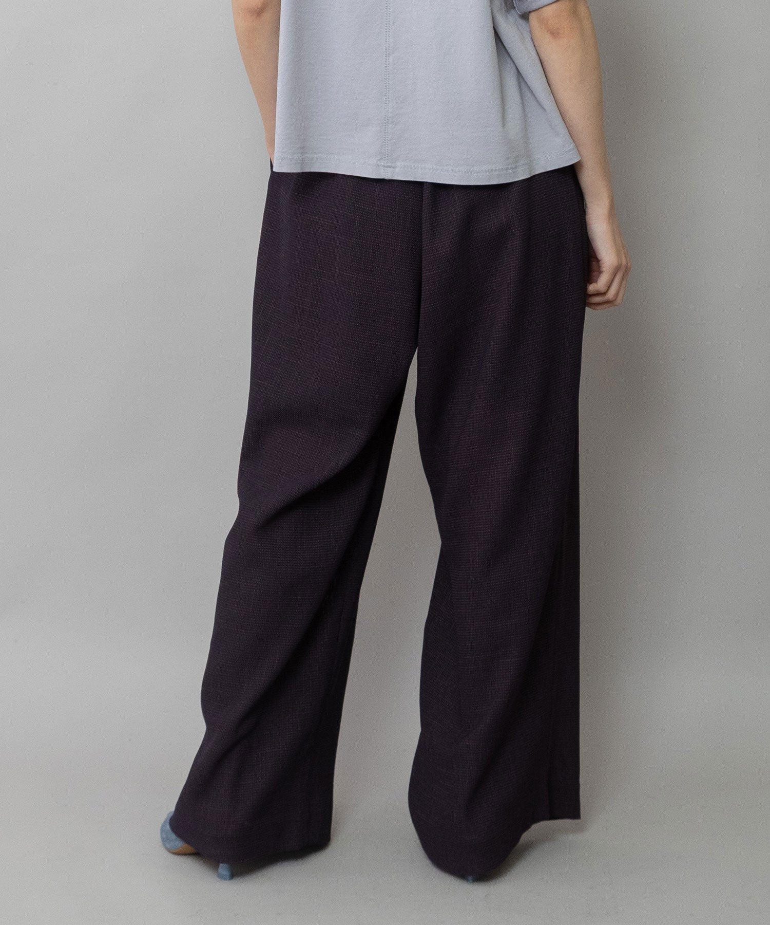 適度にハリとドレープ性を兼ね備えた生地特性によってボリューム感を保ちつつ股下でキレイにドレープが出て、カジュアルながら品のあるワイドシルエットになります。