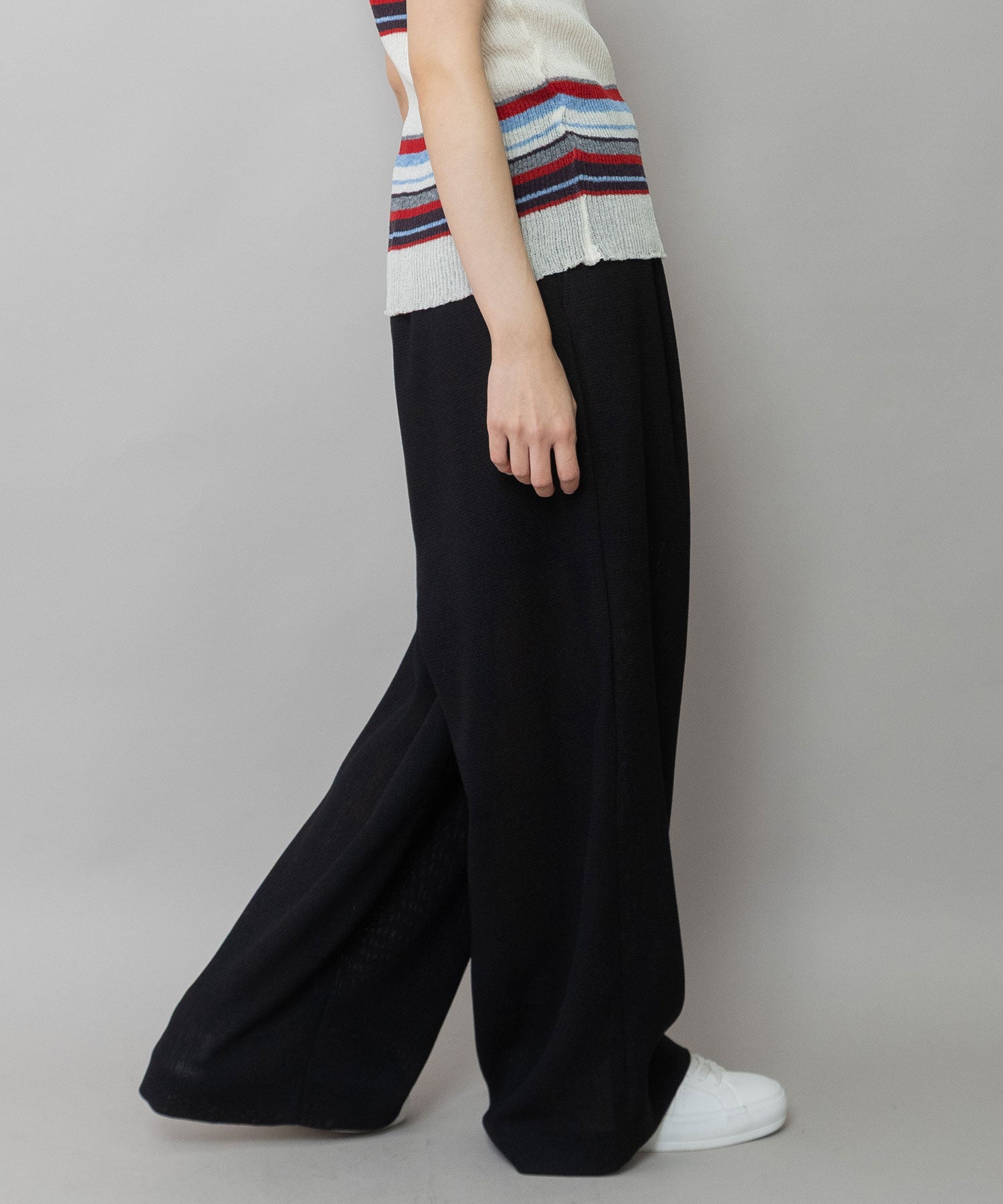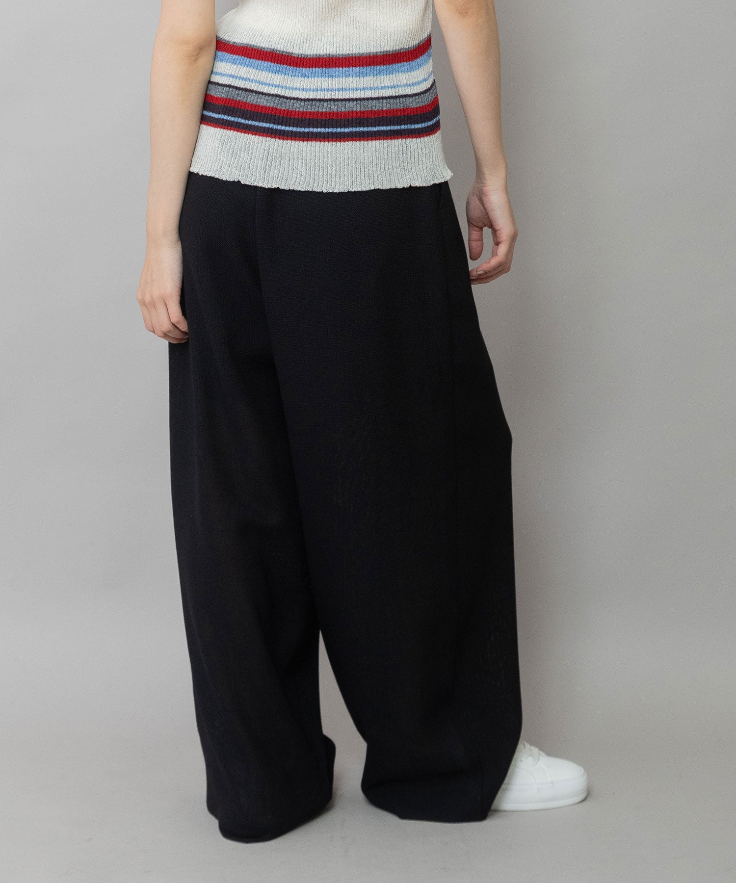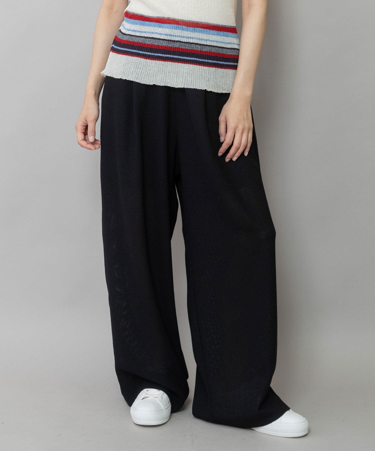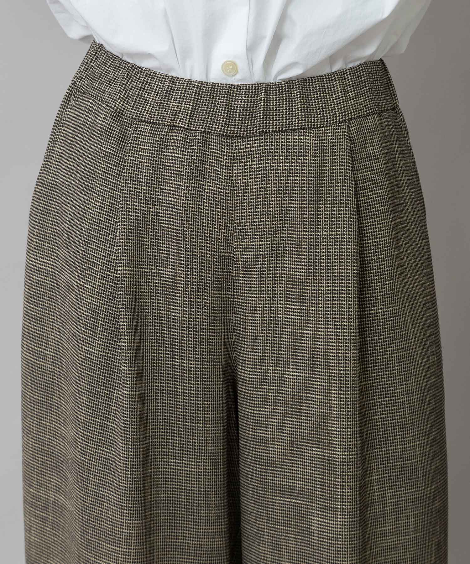 リラックス感強めの1タックワイドシルエットにゴムベルトのウエスト仕様でデイリーに使えるイージーな穿き心地のワイドパンツです。