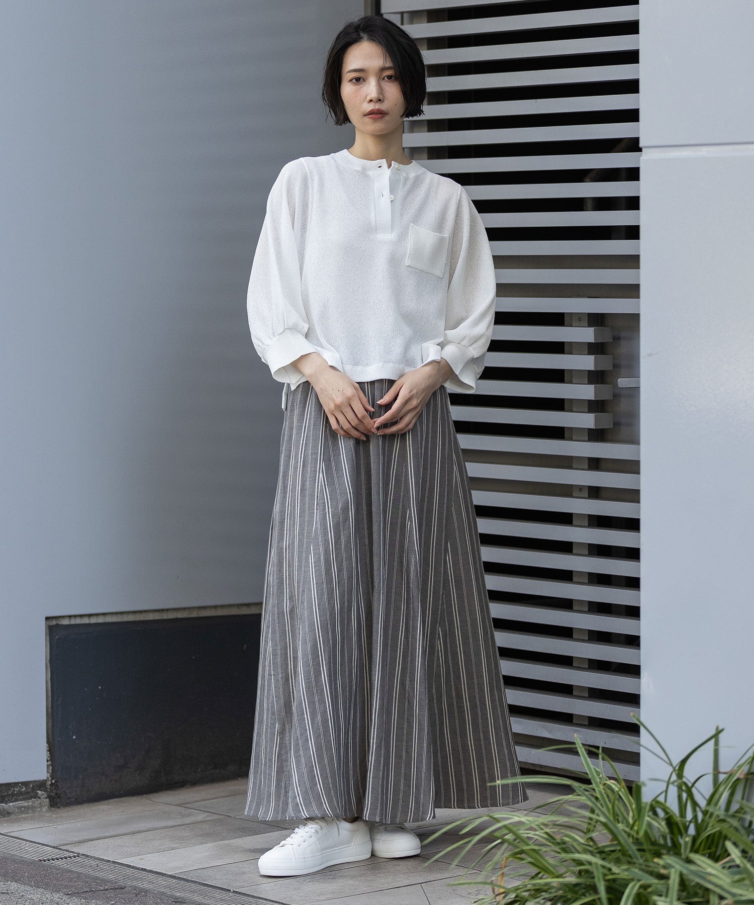 ◆マルチストライプが交差する8枚接ぎのボリューム控えめフレアスカート◆