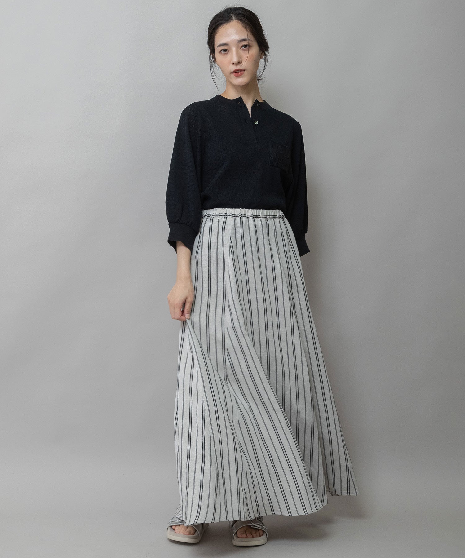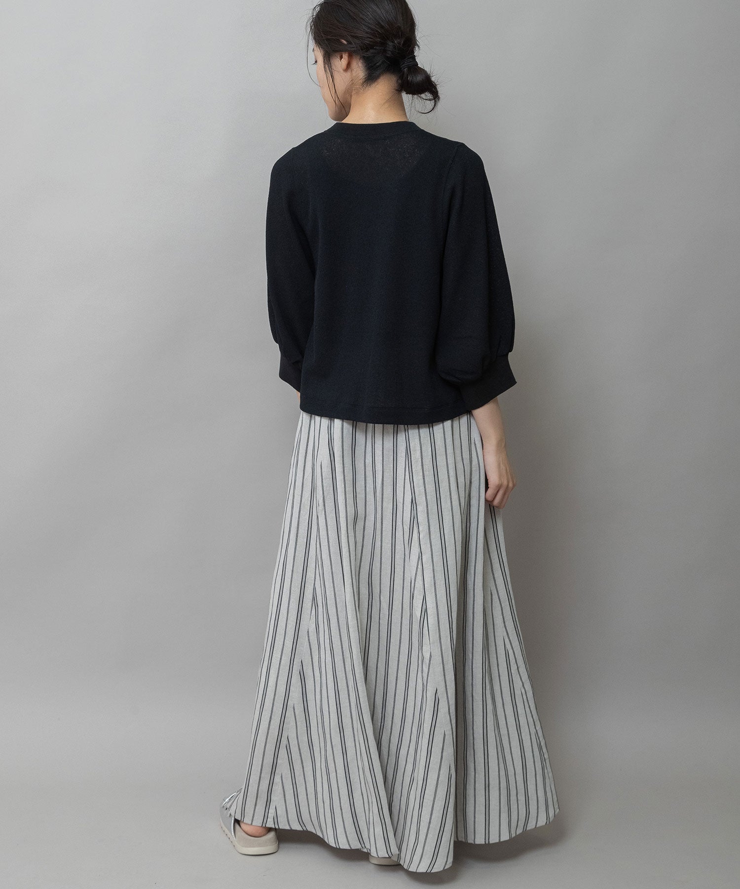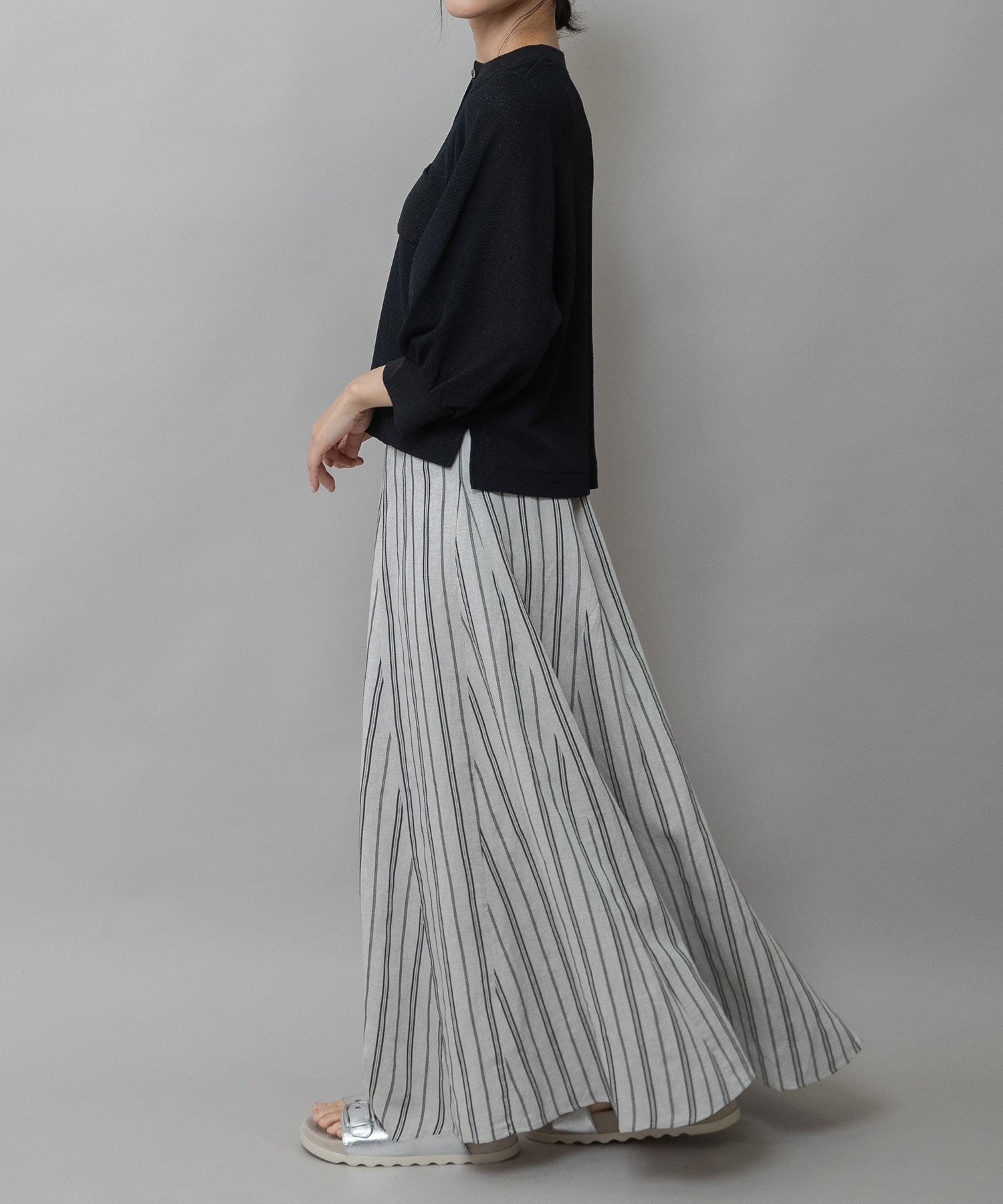 軽くて柔らかいビスコースリネンの素材感との組み合わせですっきり美しいドレープシルエットが魅力のフレアスカートです。