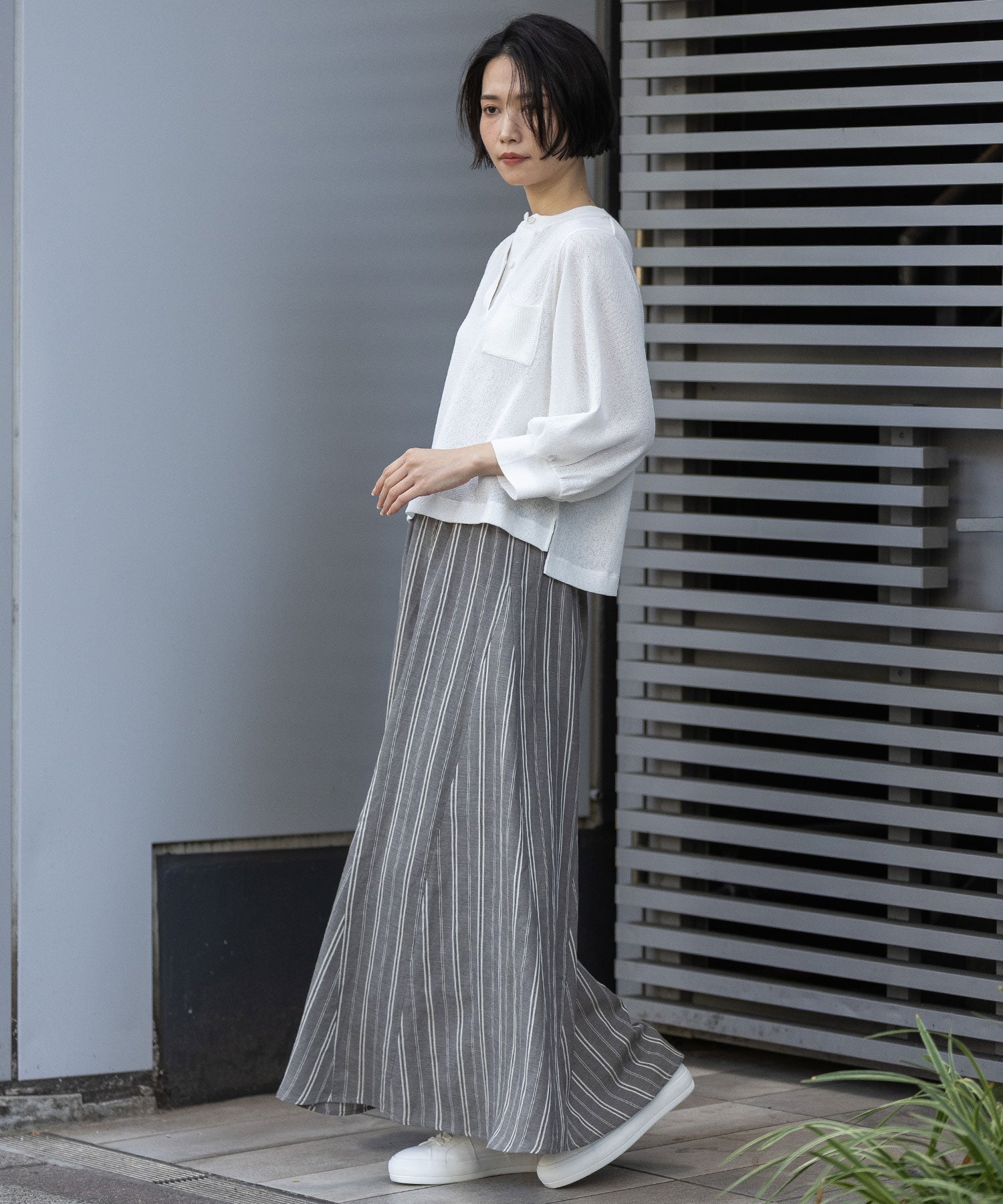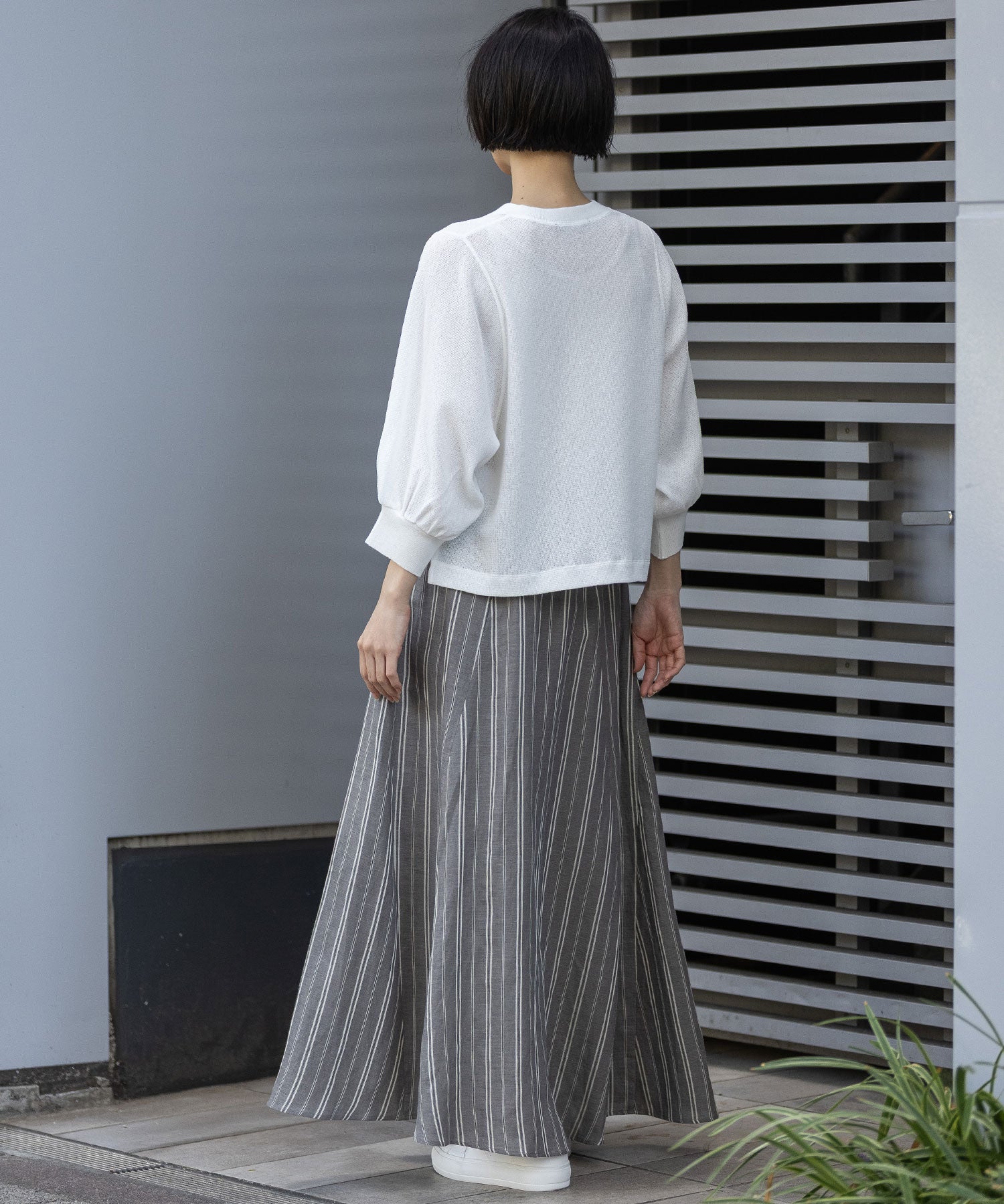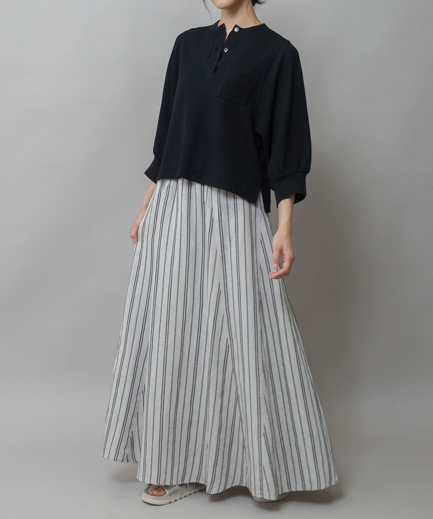 軽くて柔らかいビスコースリネンの素材感との組み合わせですっきり美しいドレープシルエットが魅力のフレアスカートです。