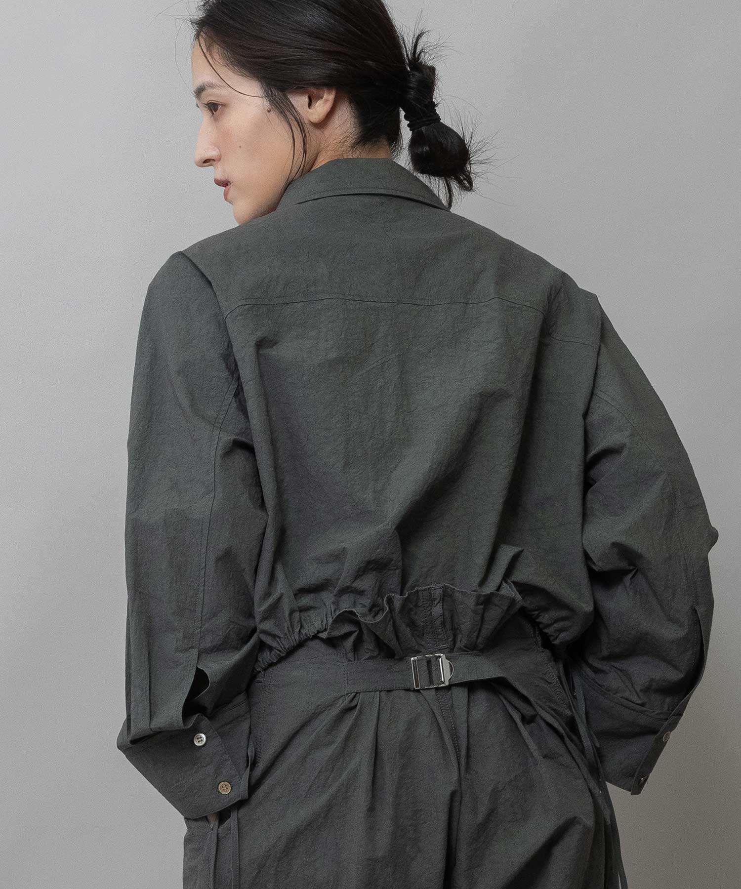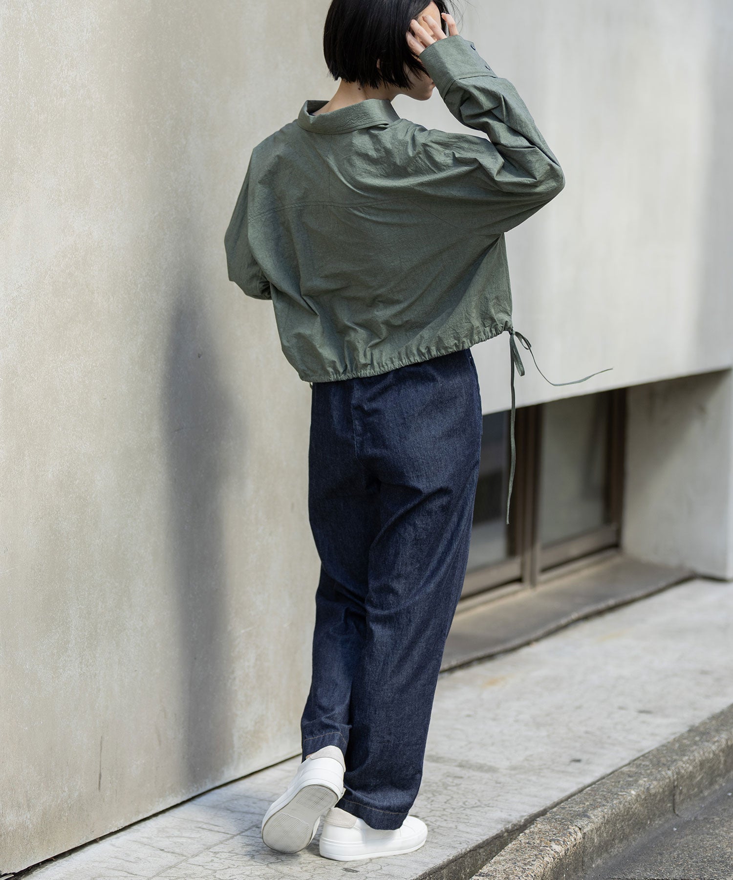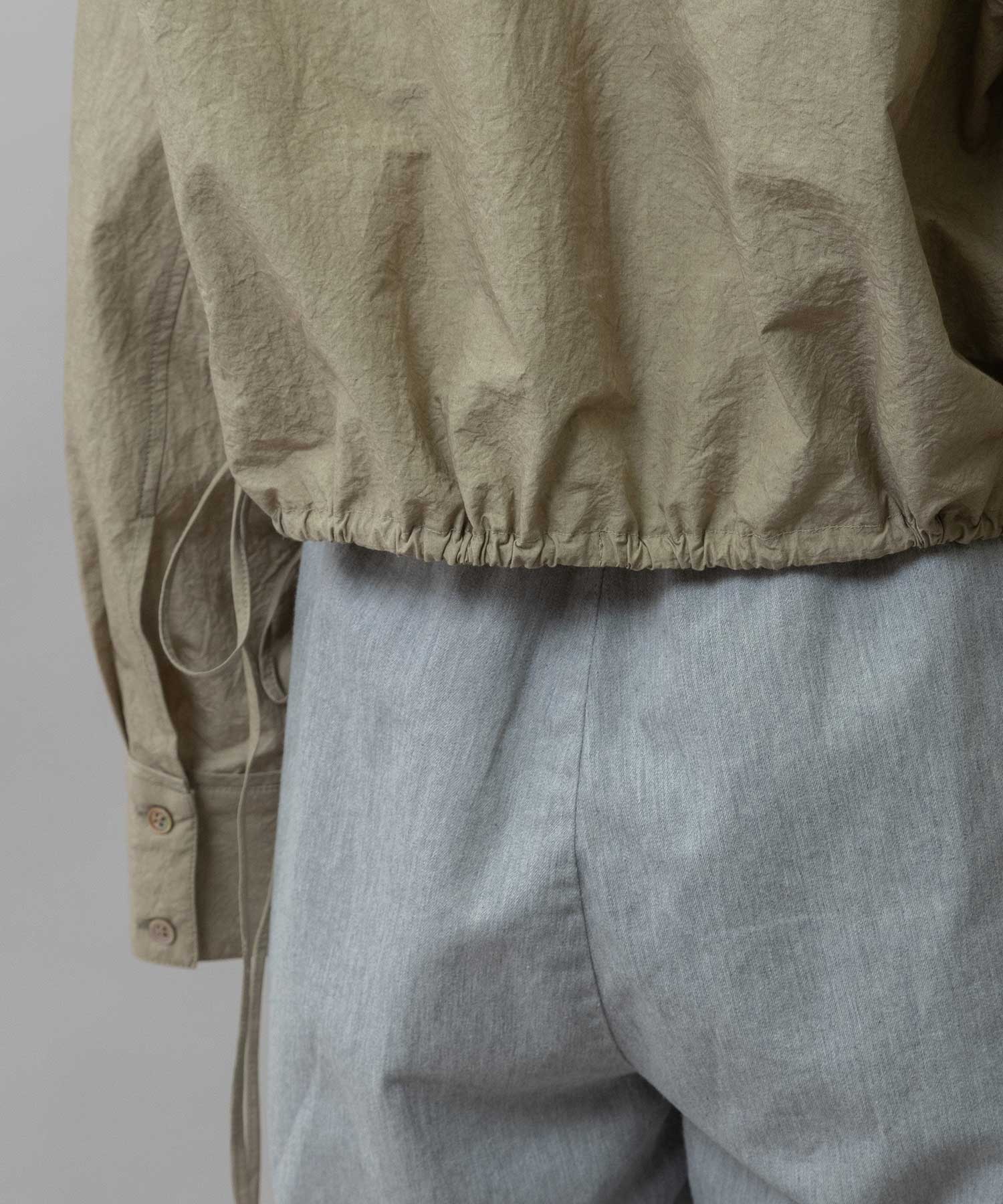 裾に付けた長めのドローコードは、ラフにリボン結びして紐を垂らしてアクセントに。袖口はボタンが2か所で留められる仕様なので、太いままズドンと着たり、キュッと細めにして袖口のボリューム感を楽しんだりと、コーディネートやシチュエーションに合わせてシルエットの変化を楽しめます。