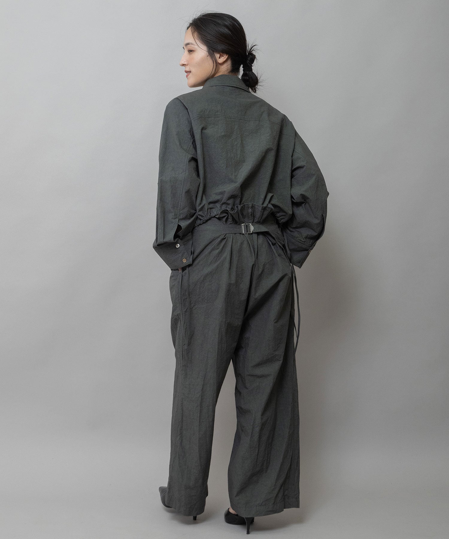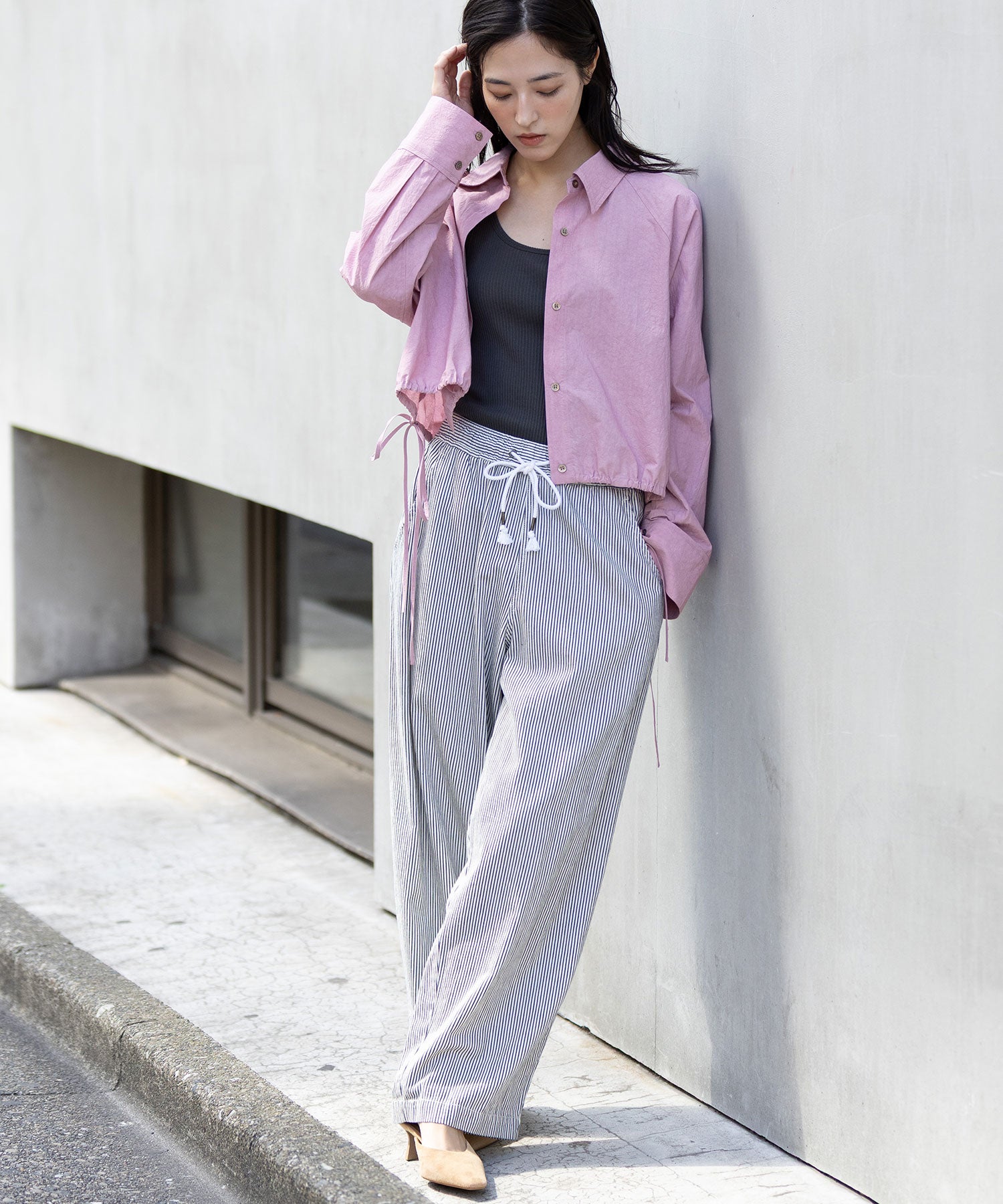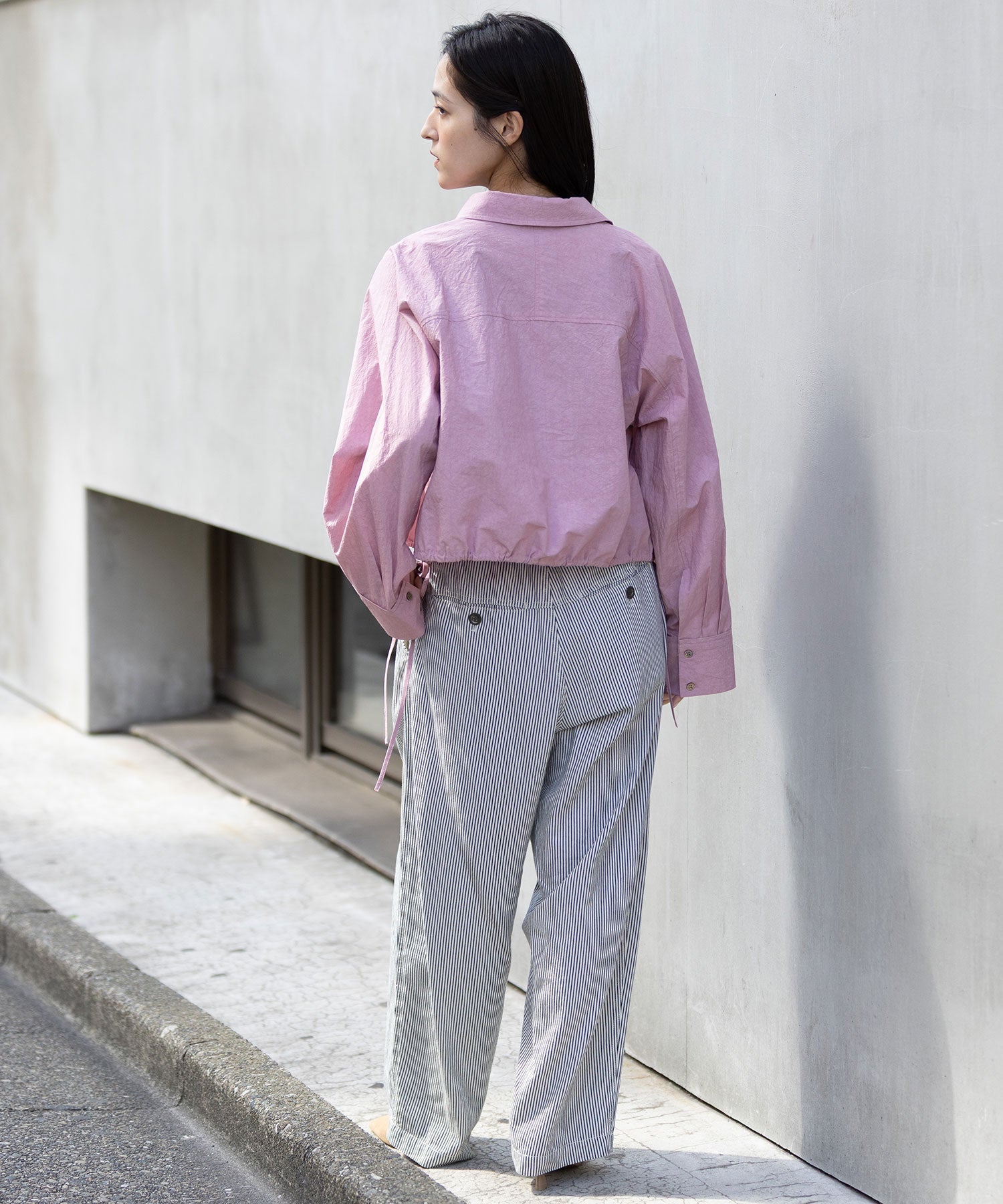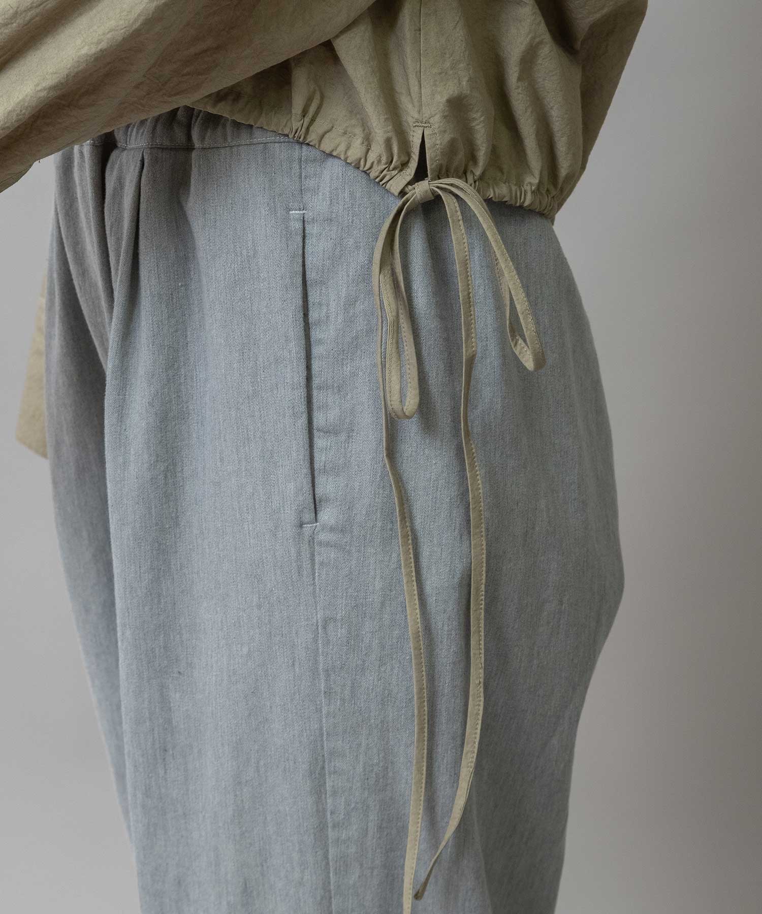 裾に付けた長めのドローコードは、ラフにリボン結びして紐を垂らしてアクセントに。袖口はボタンが2か所で留められる仕様なので、太いままズドンと着たり、キュッと細めにして袖口のボリューム感を楽しんだりと、コーディネートやシチュエーションに合わせてシルエットの変化を楽しめます。