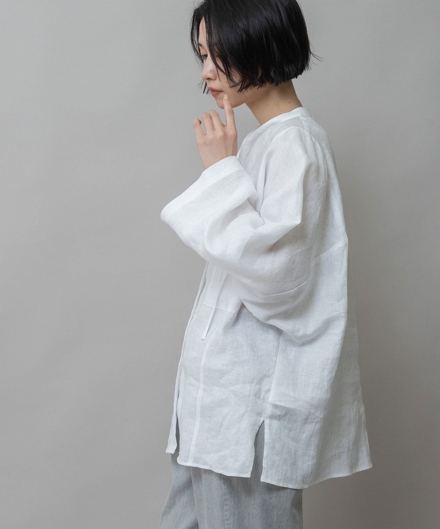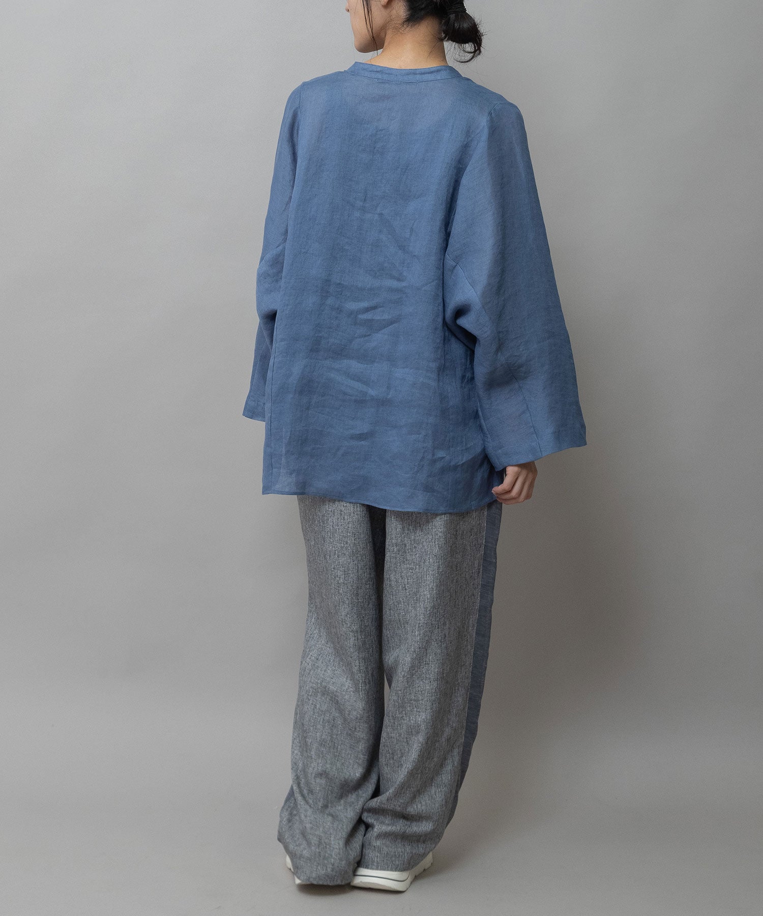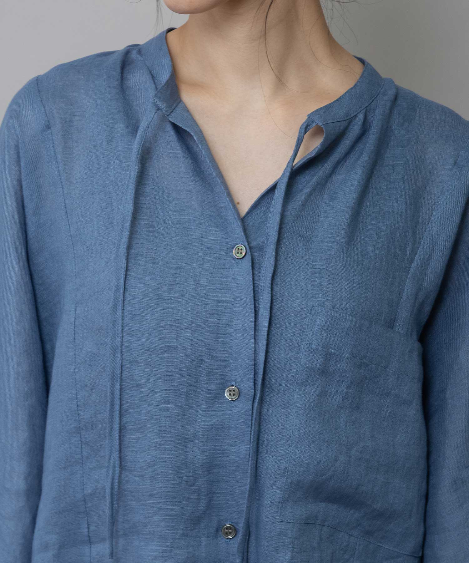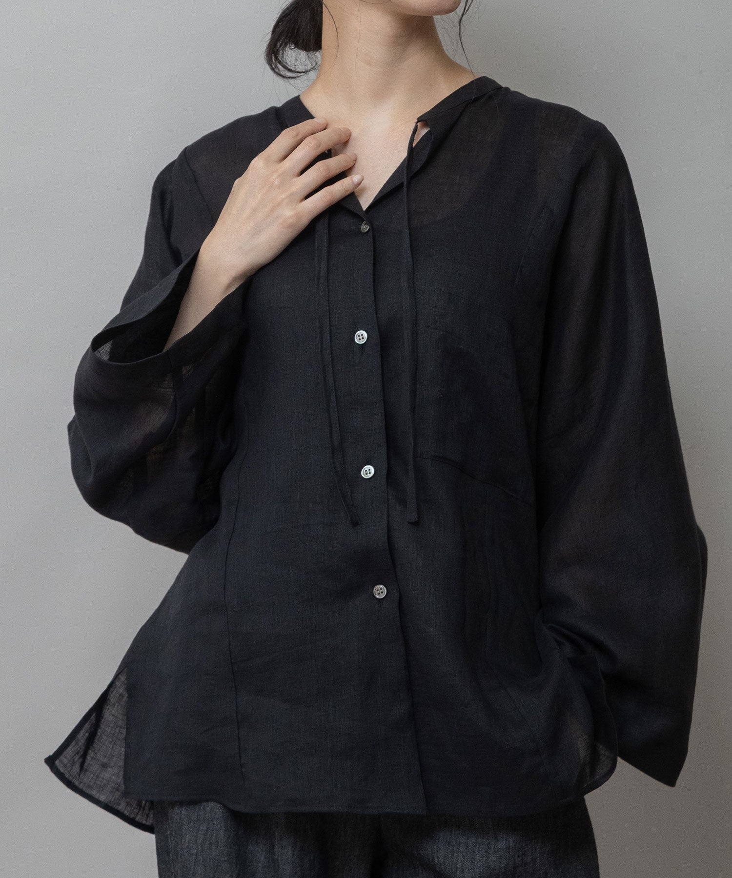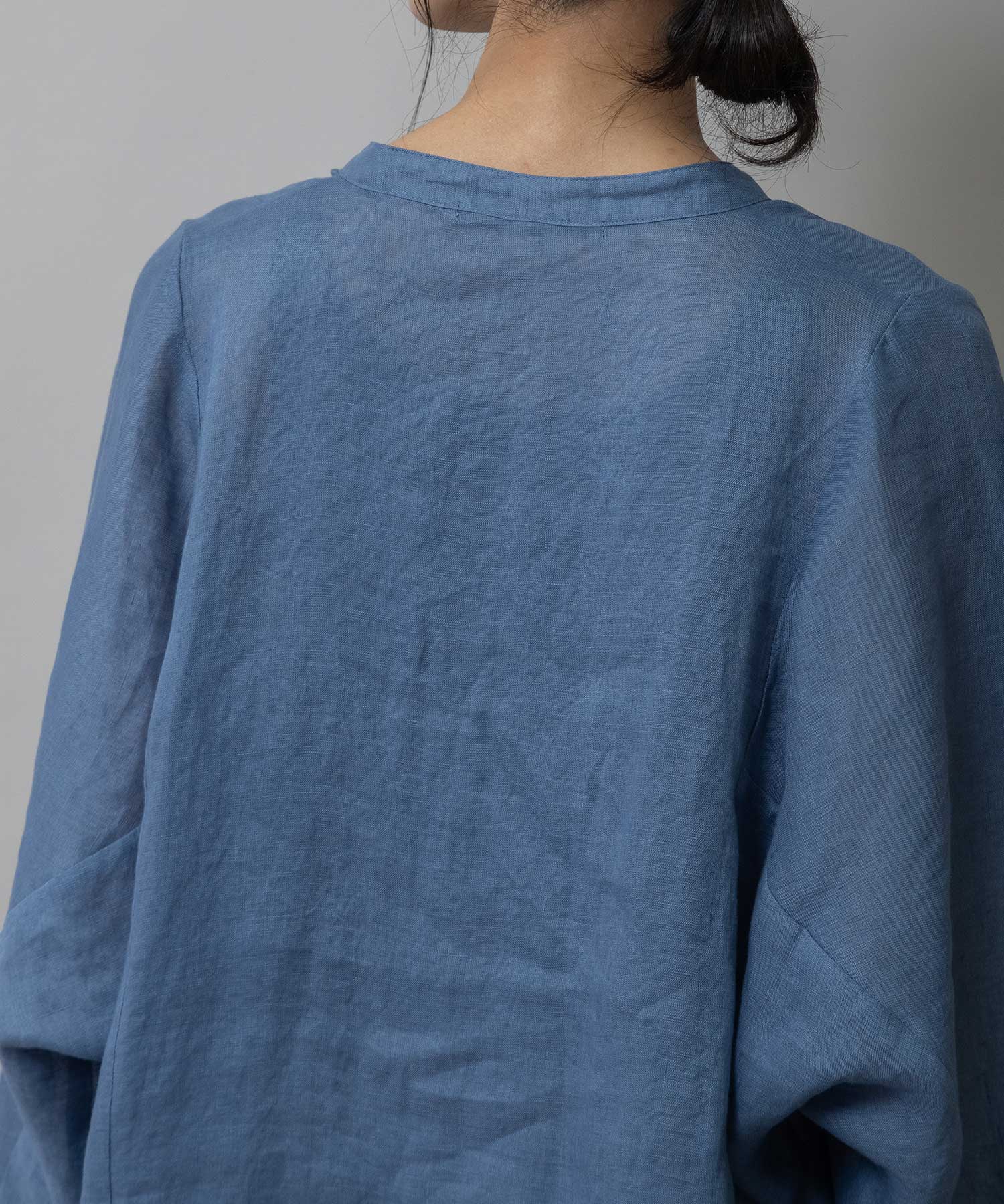 ゆったりしたドルマンスリーブのシャツで衿はバンドカラーのような低めの衿に共地コードを挟み込んでいます。