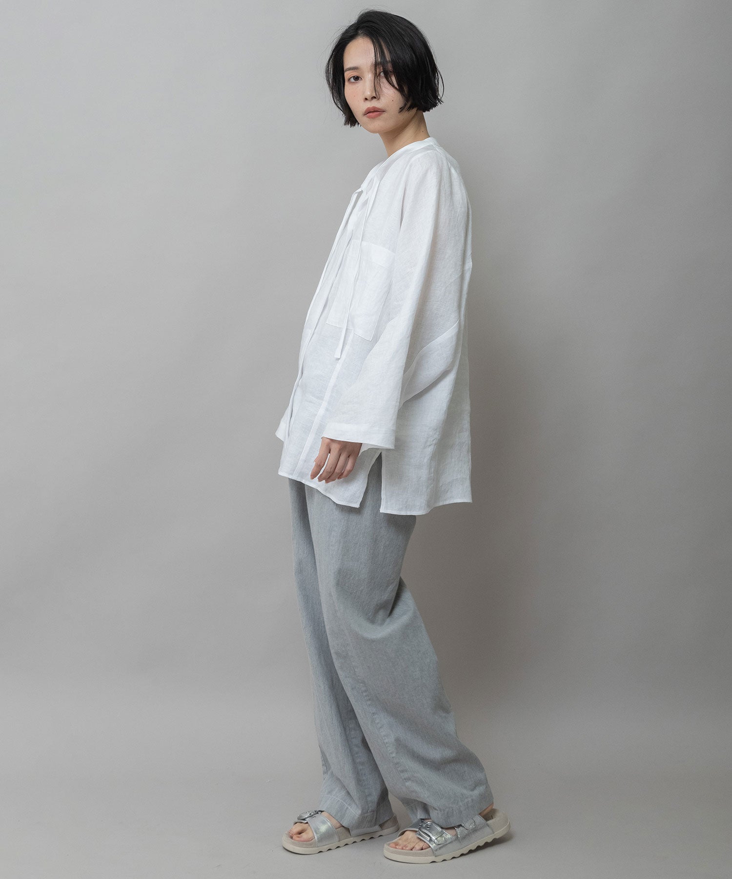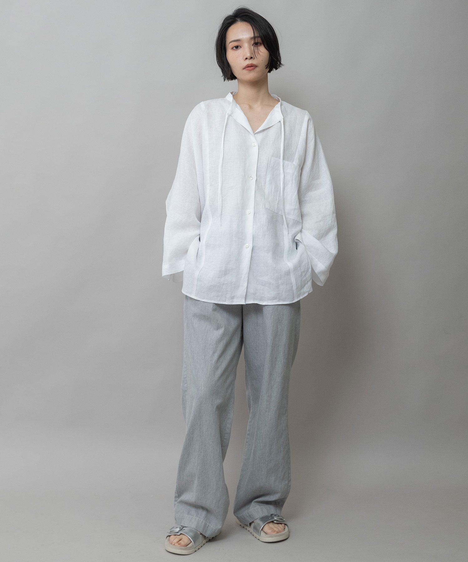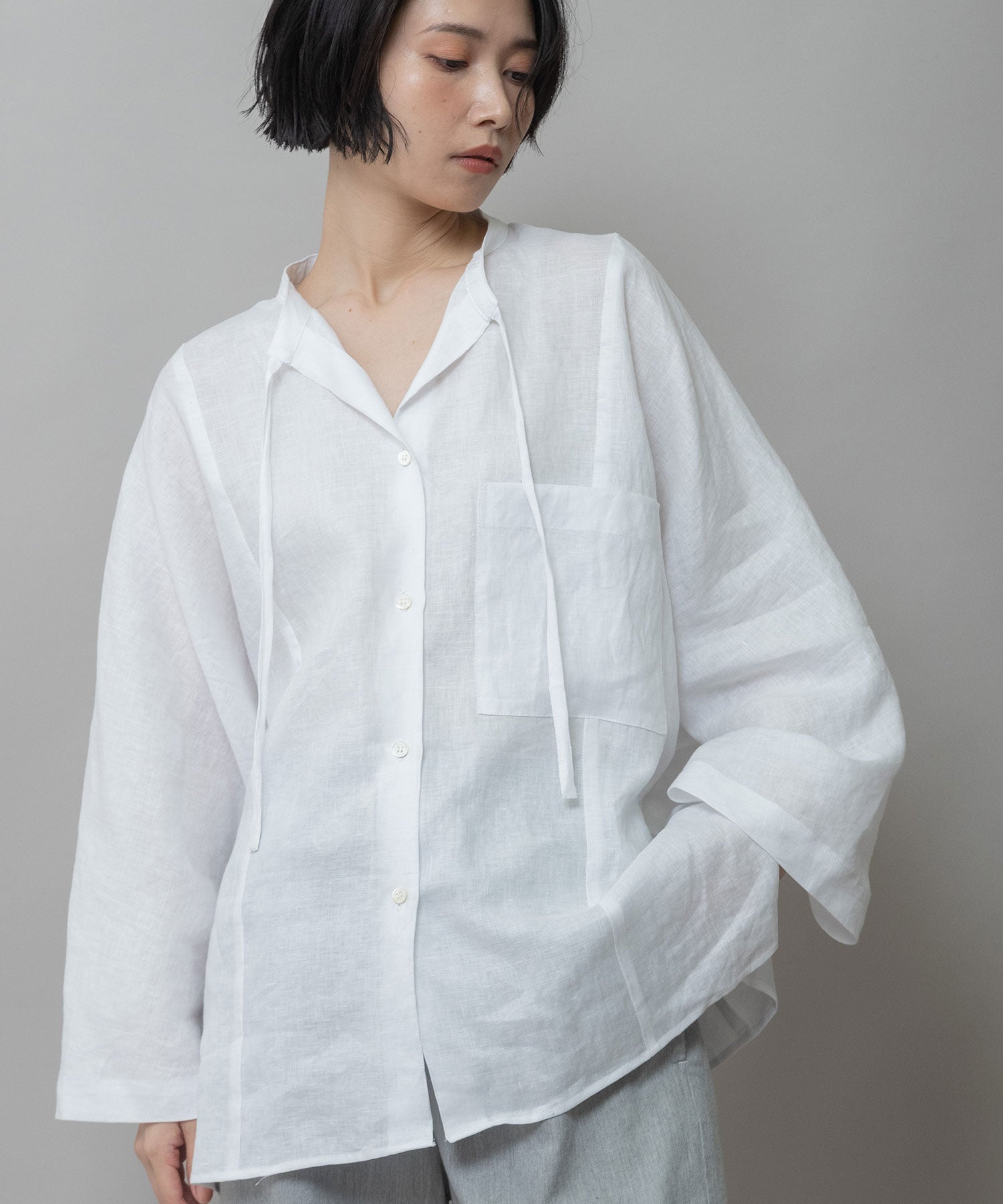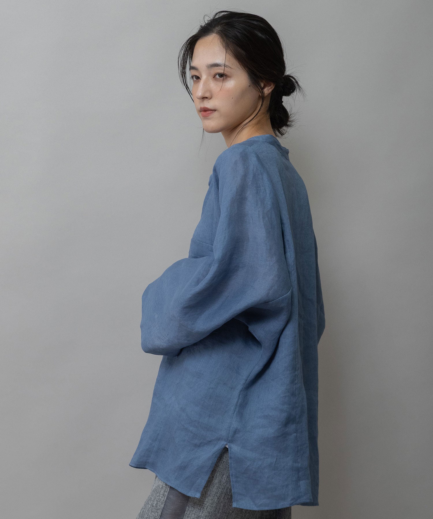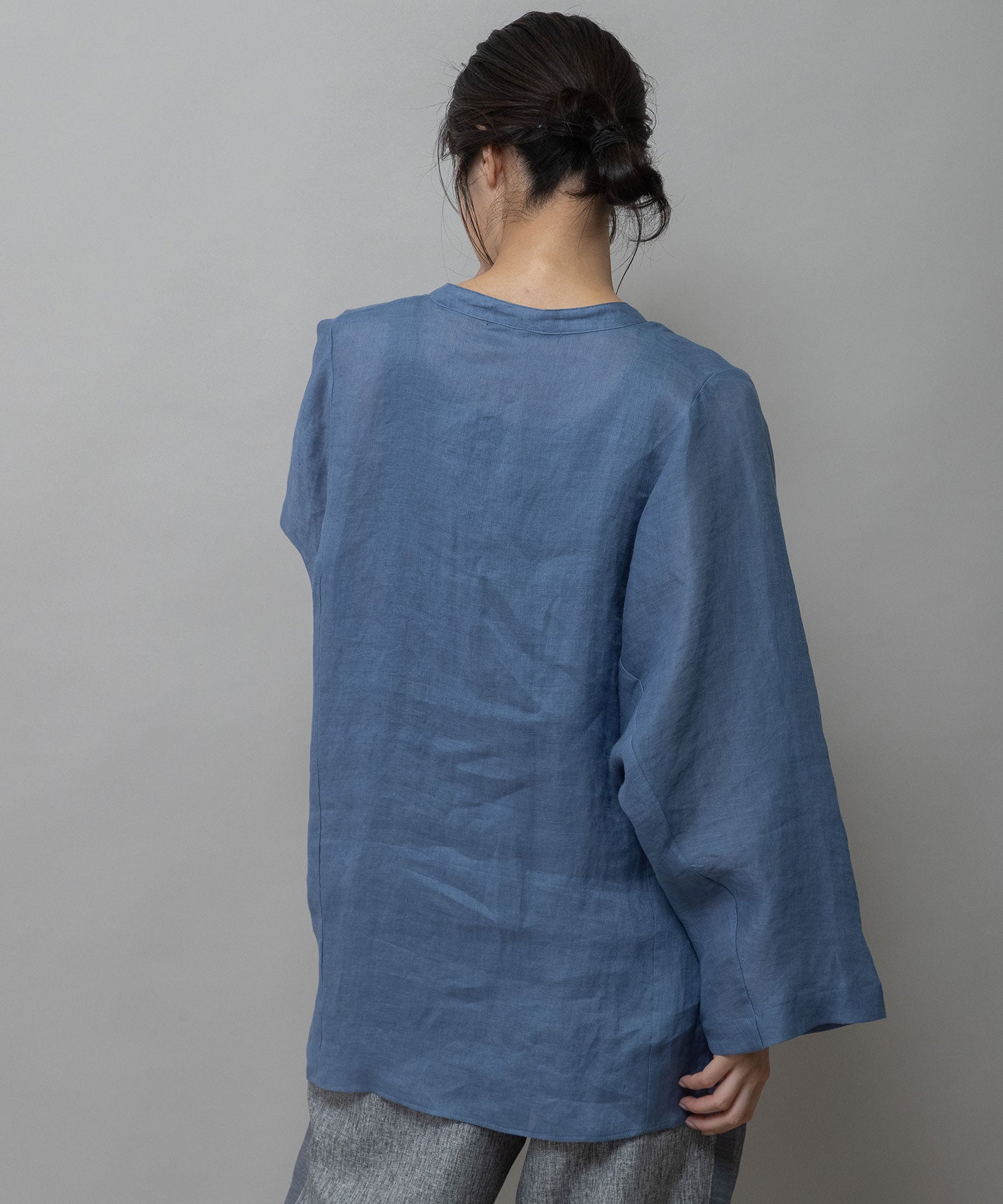 ゆったりしたドルマンスリーブのシャツで衿はバンドカラーのような低めの衿に共地コードを挟み込んでいます。
