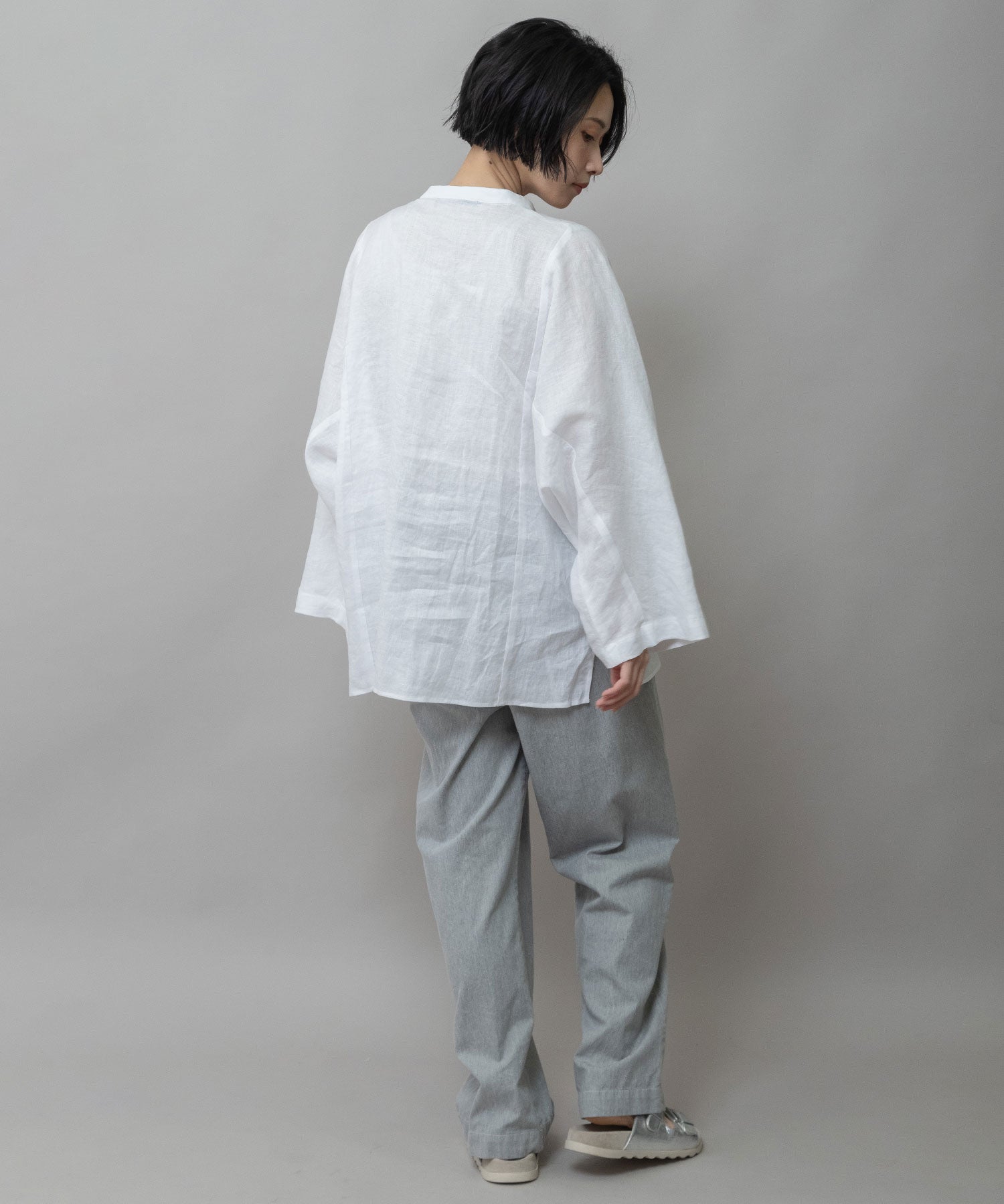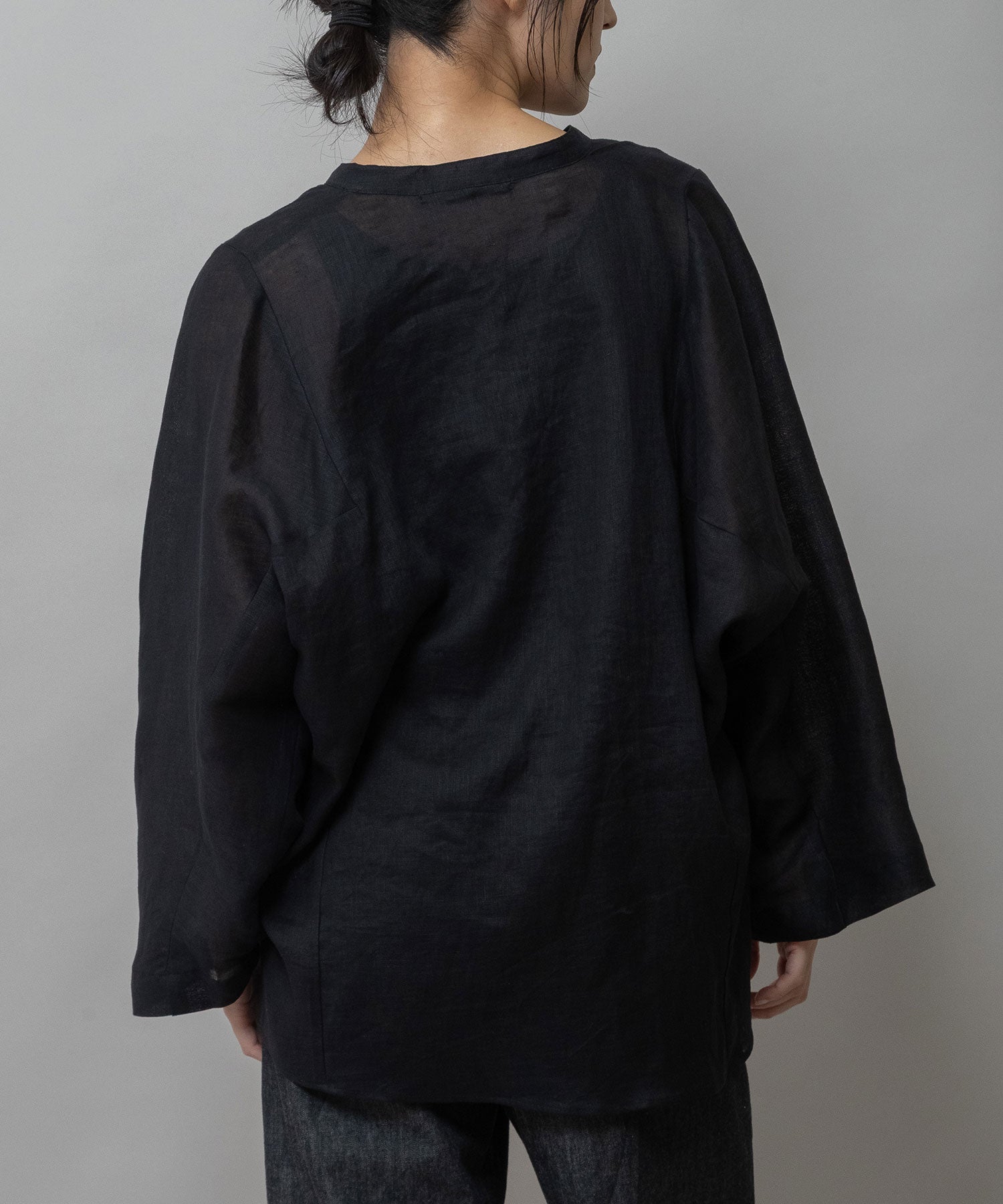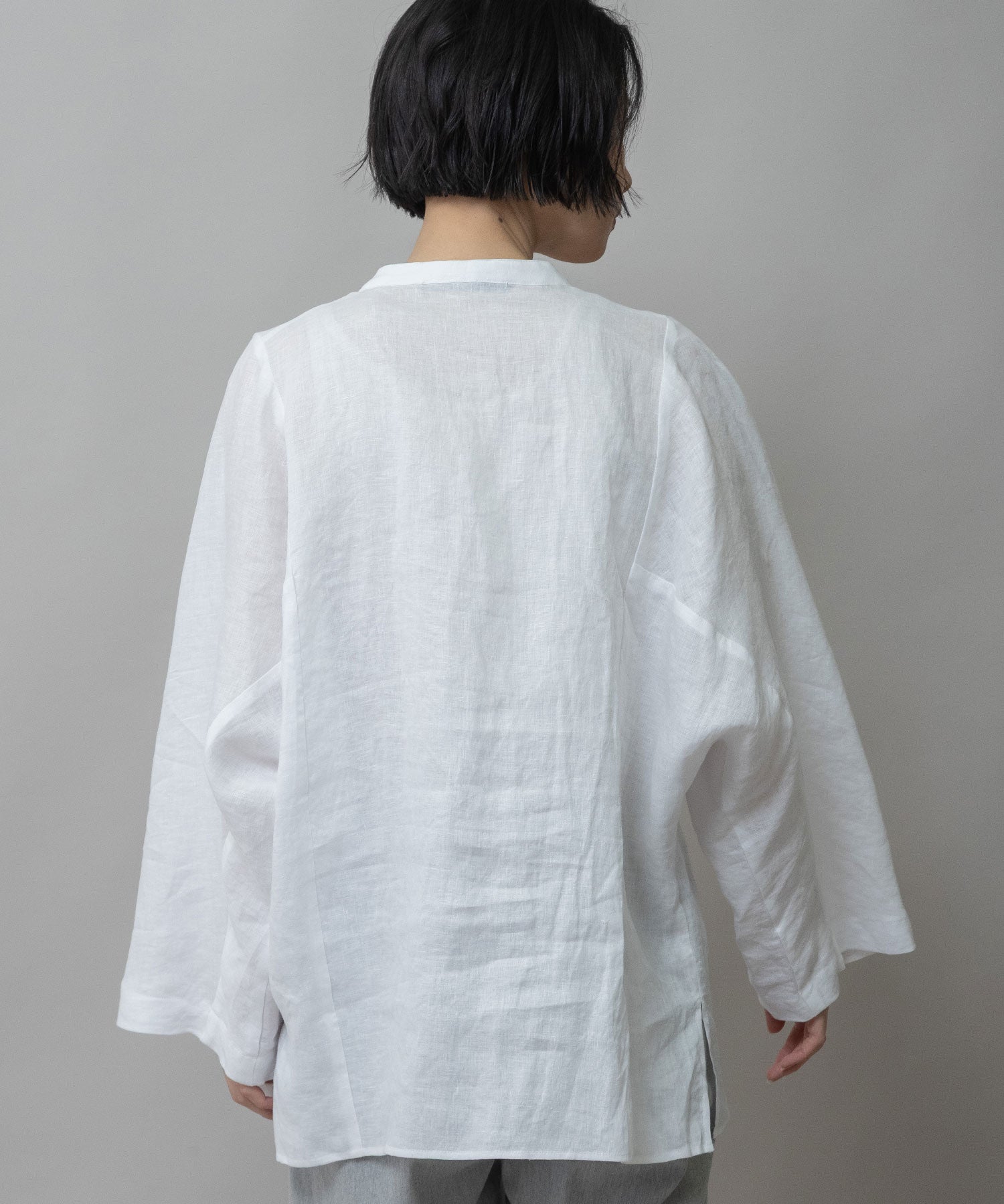 身頃の切り替えがちょうど浅めの肩幅くらいのところにくるのでゆったりしていながら少し華奢な雰囲気の出せる切替えになっていて、カフスの無い太めの筒袖はタックをとってロールアップすることで前腕(肘下)のところで止まるように捲れます。