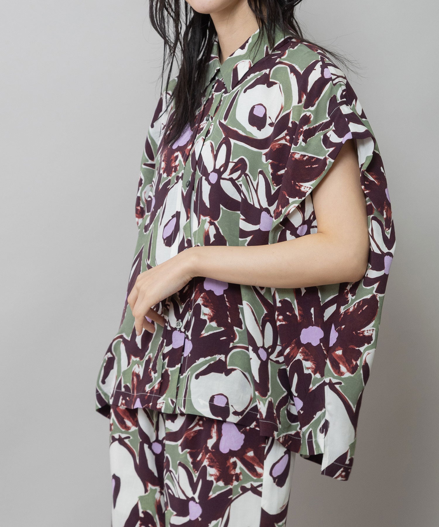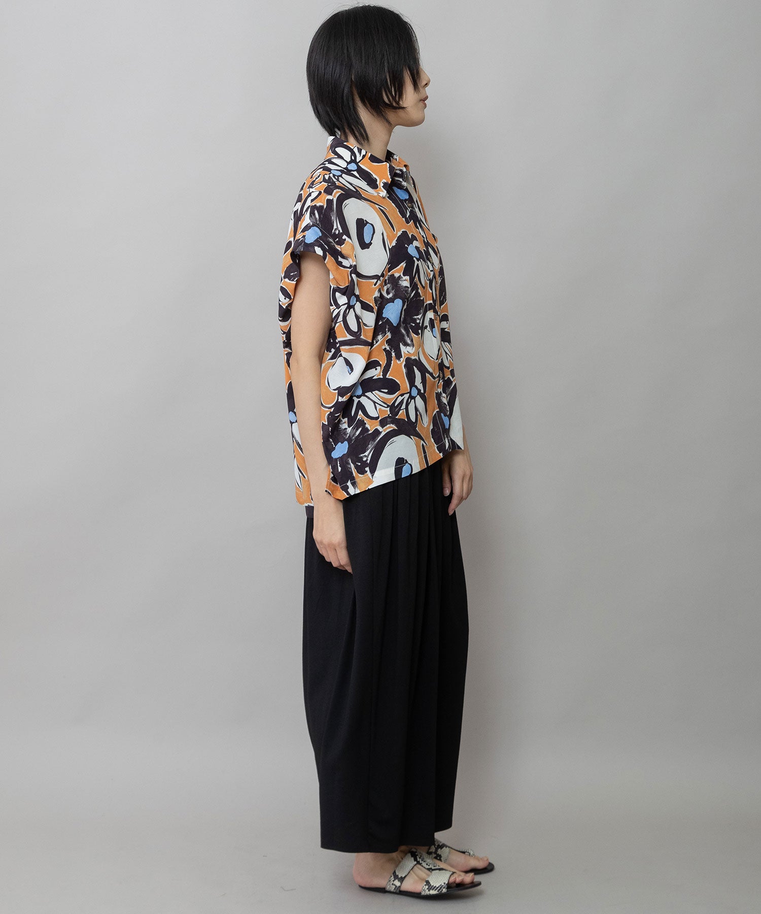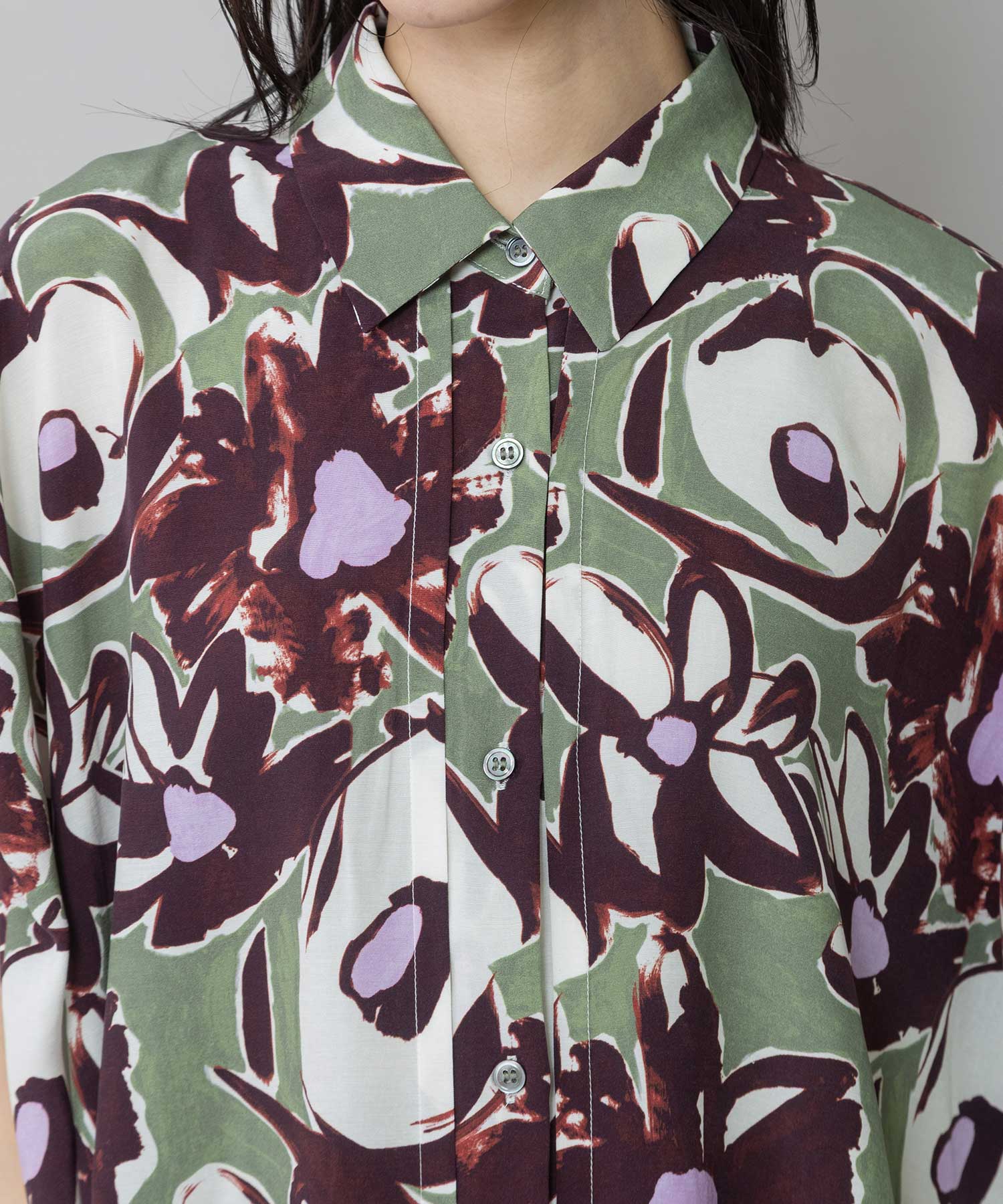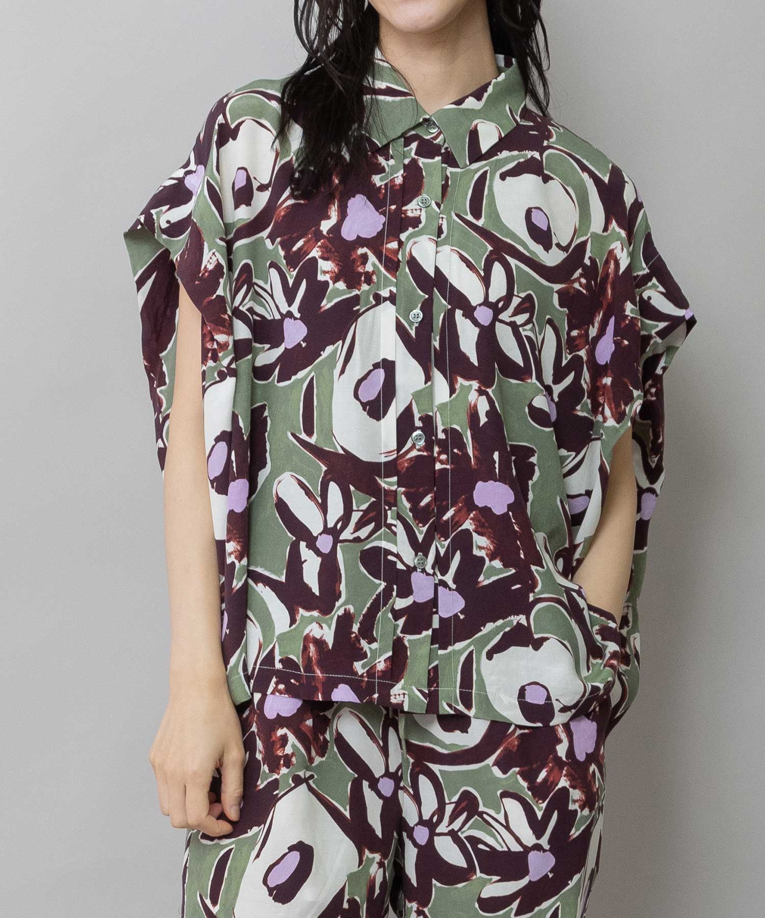 ◆ボリュームがきれいにドレープする大胆なフラワープリントのタックスリーブシャツ◆