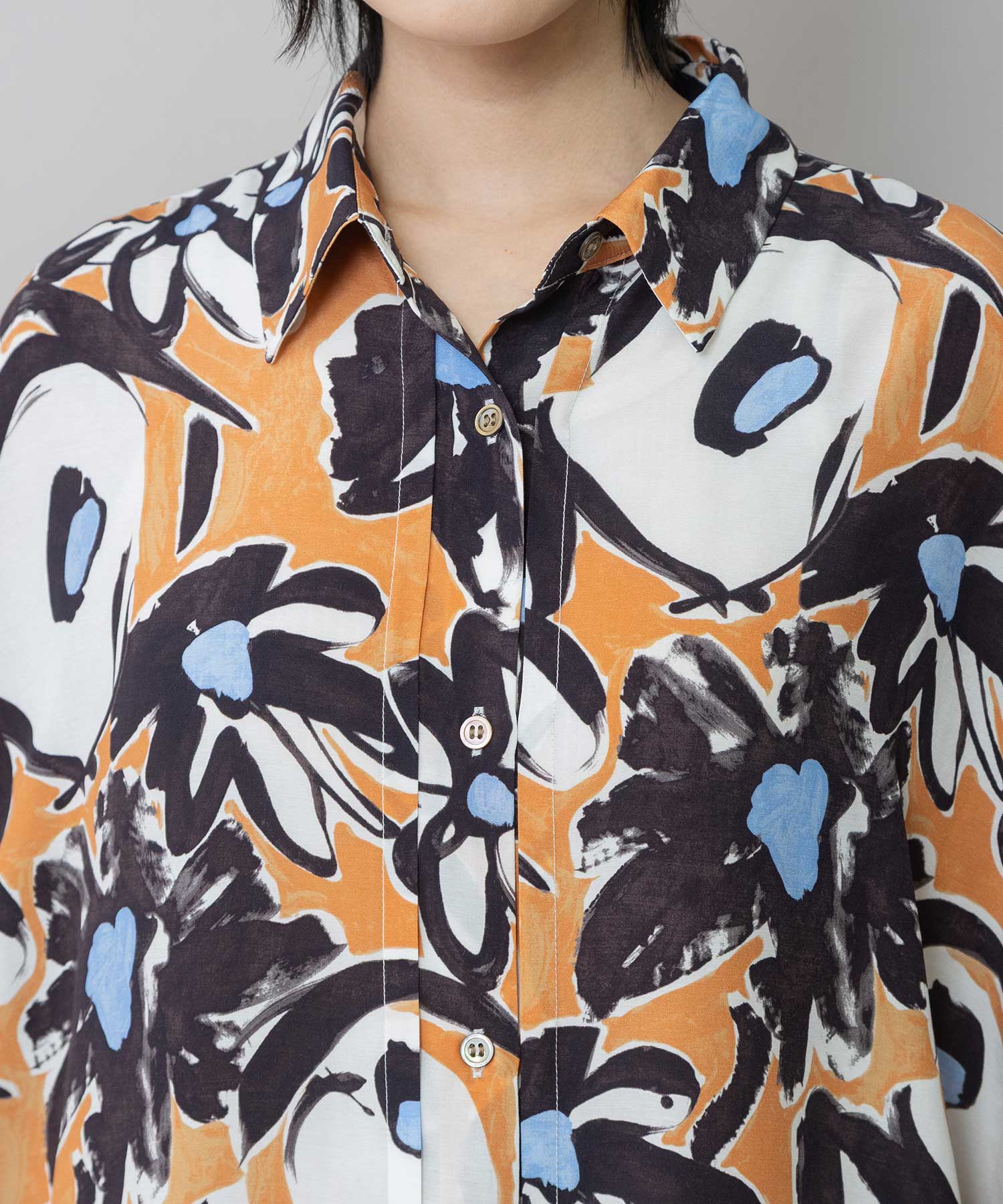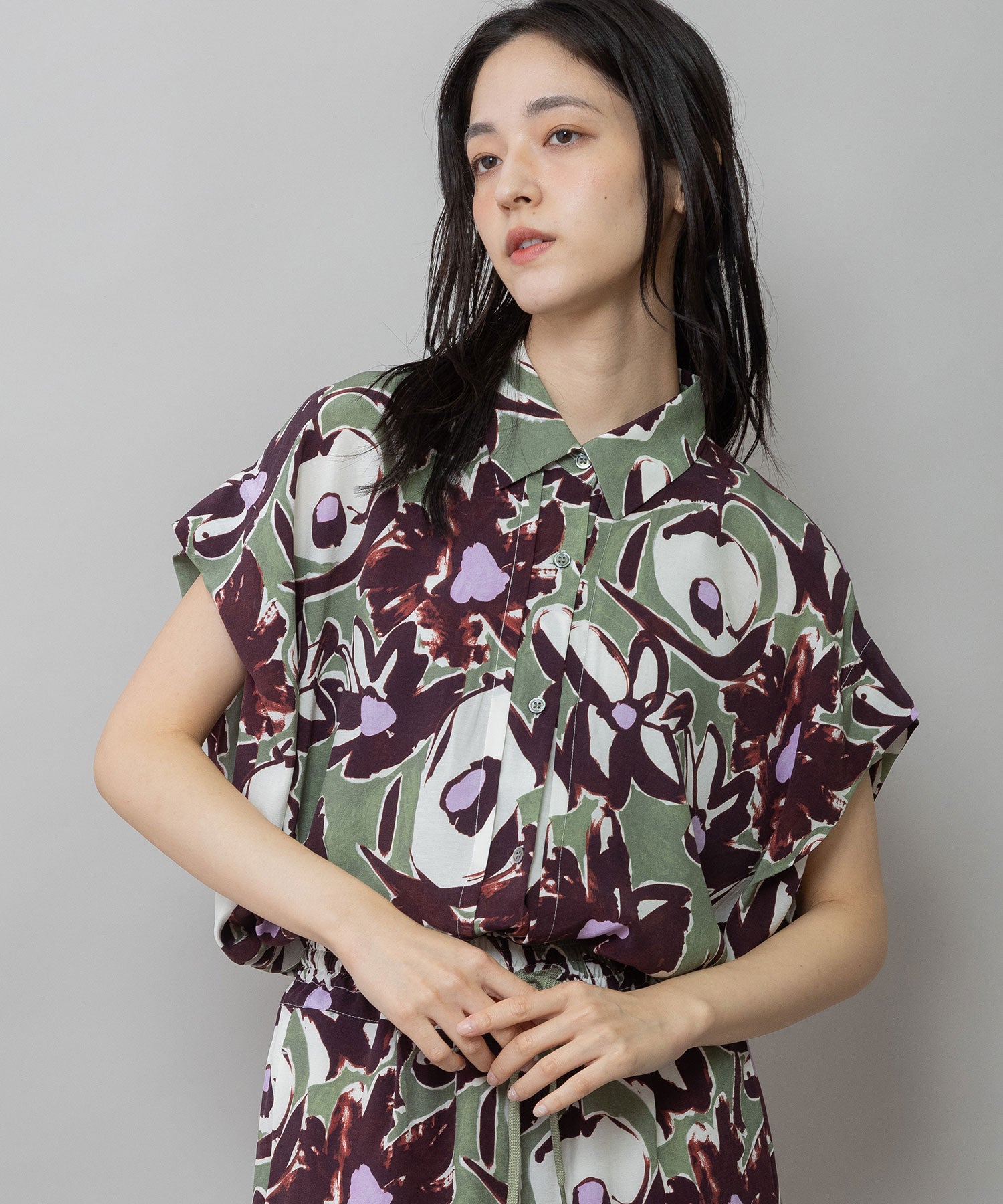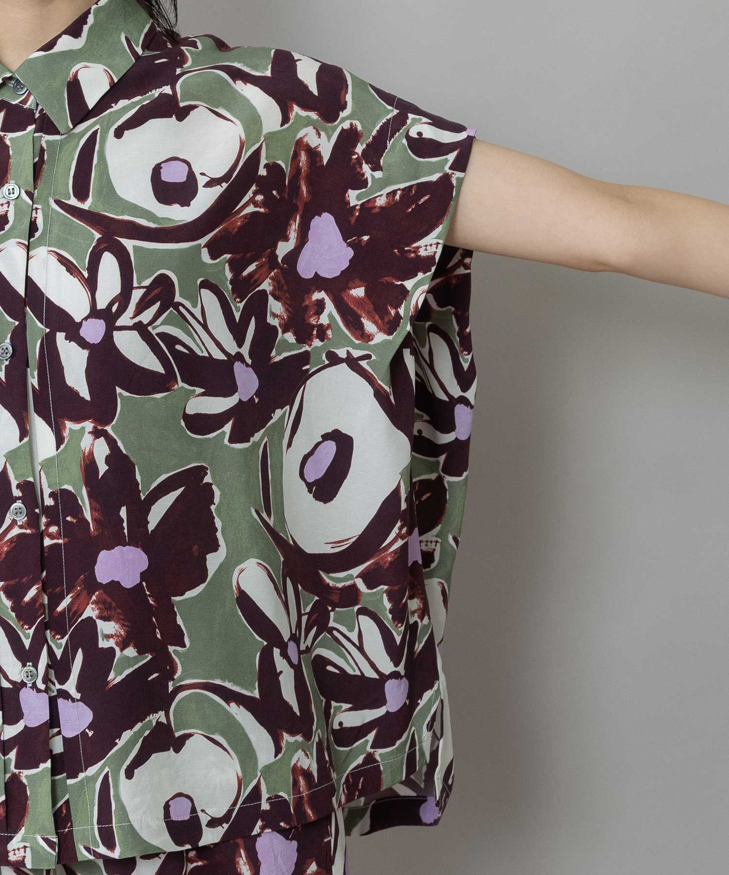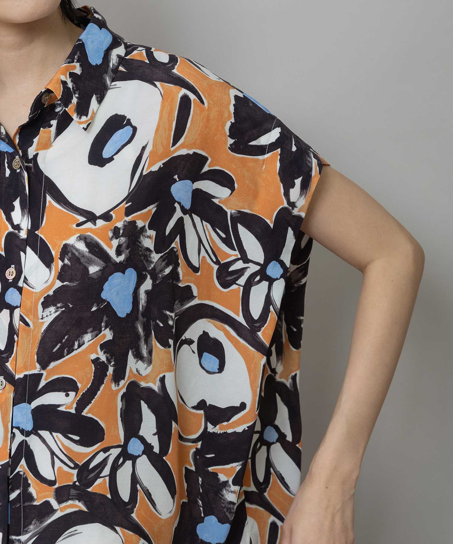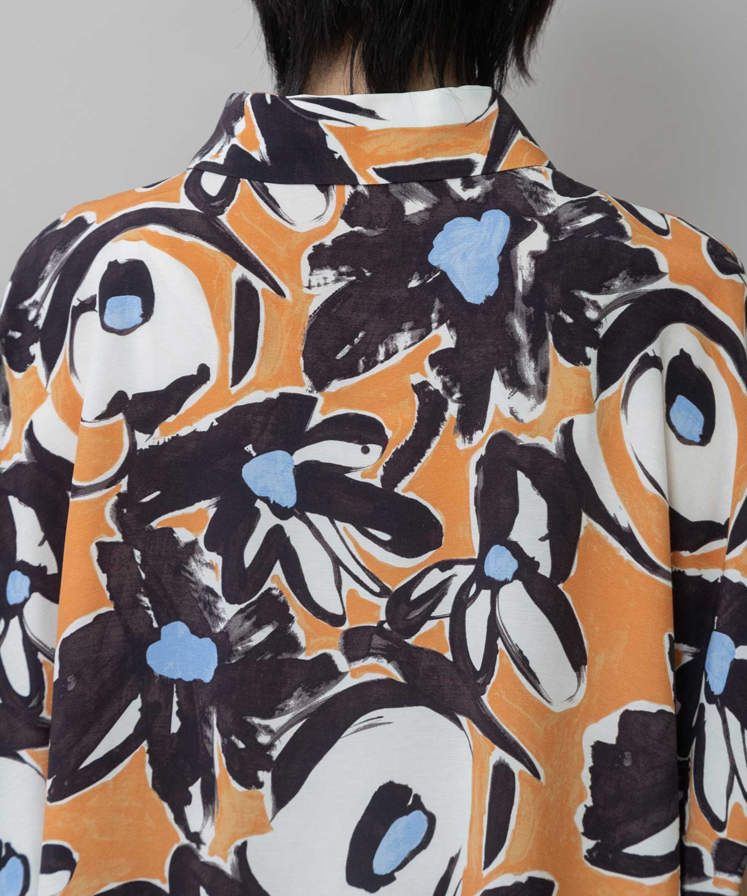 ◆ボリュームがきれいにドレープする大胆なフラワープリントのタックスリーブシャツ◆