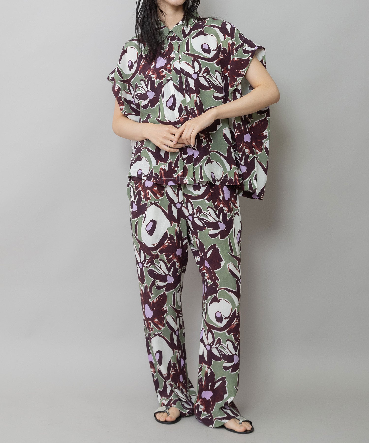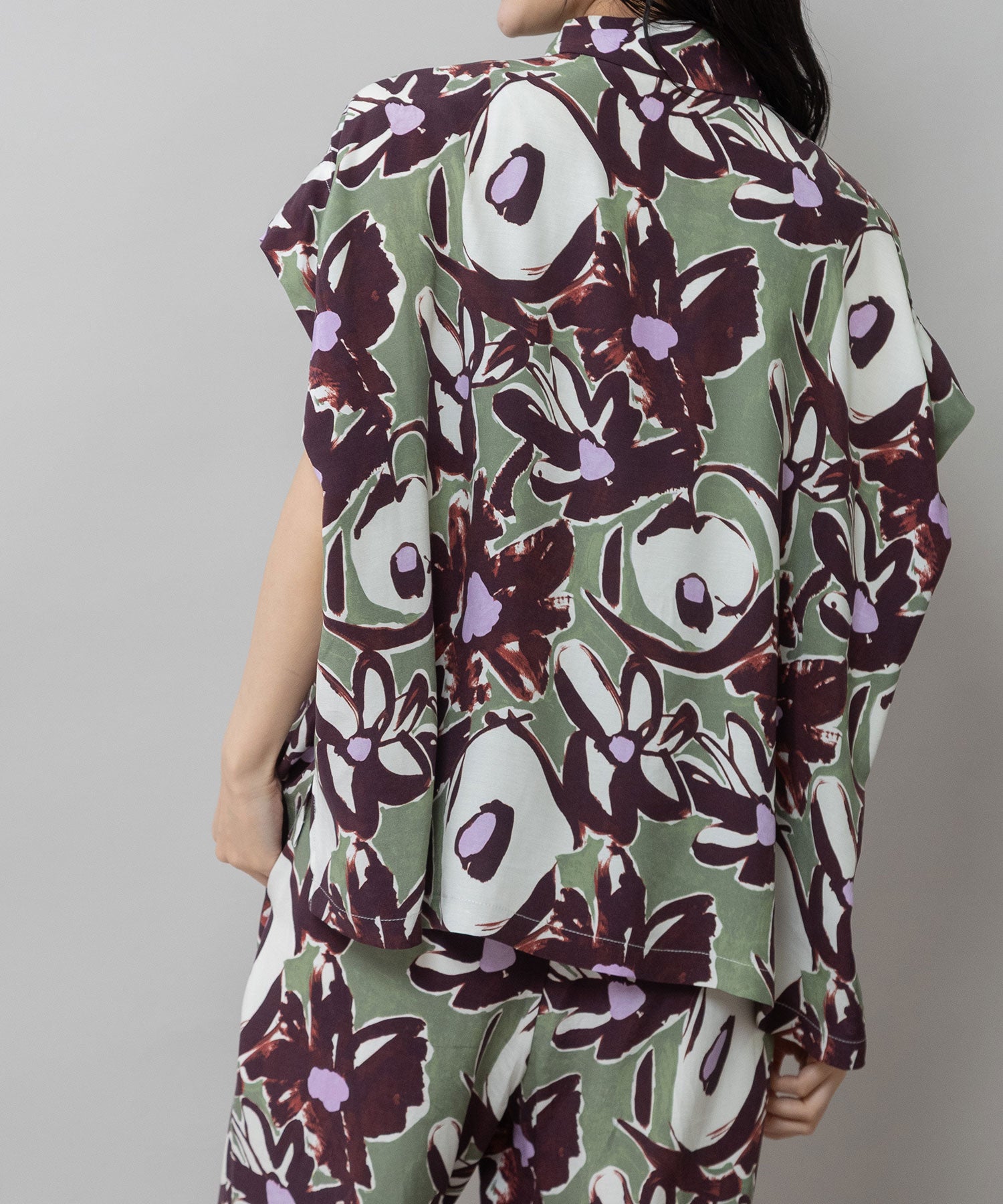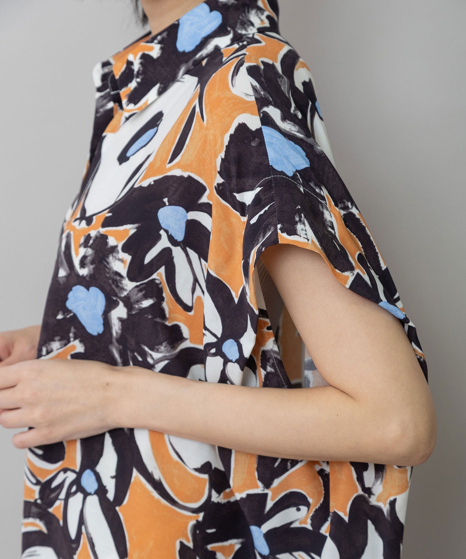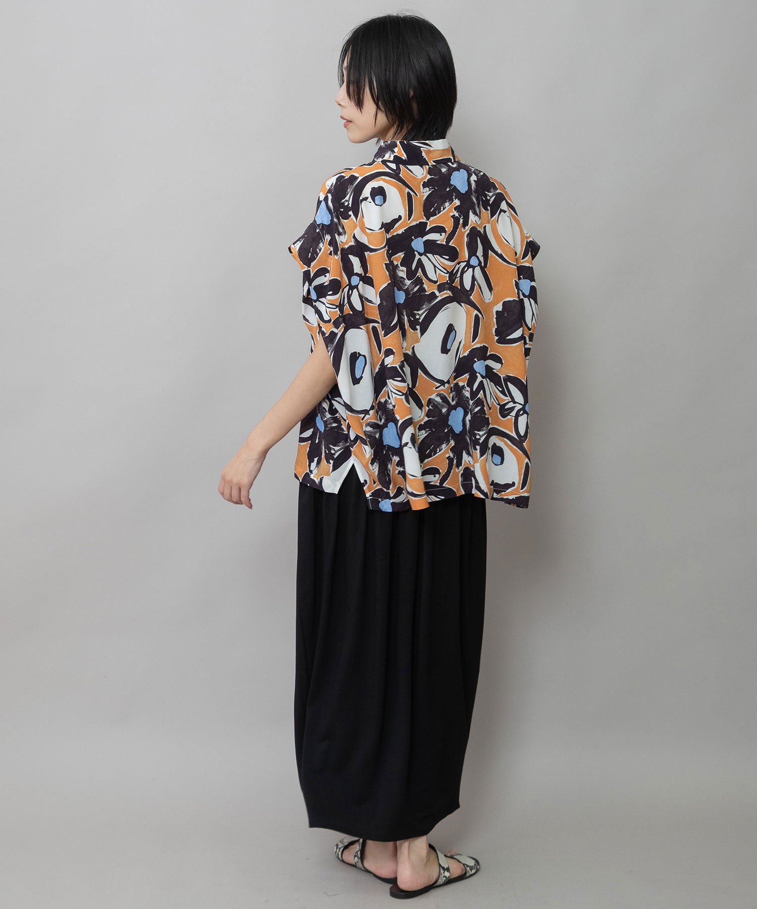 ◆ボリュームがきれいにドレープする大胆なフラワープリントのタックスリーブシャツ◆