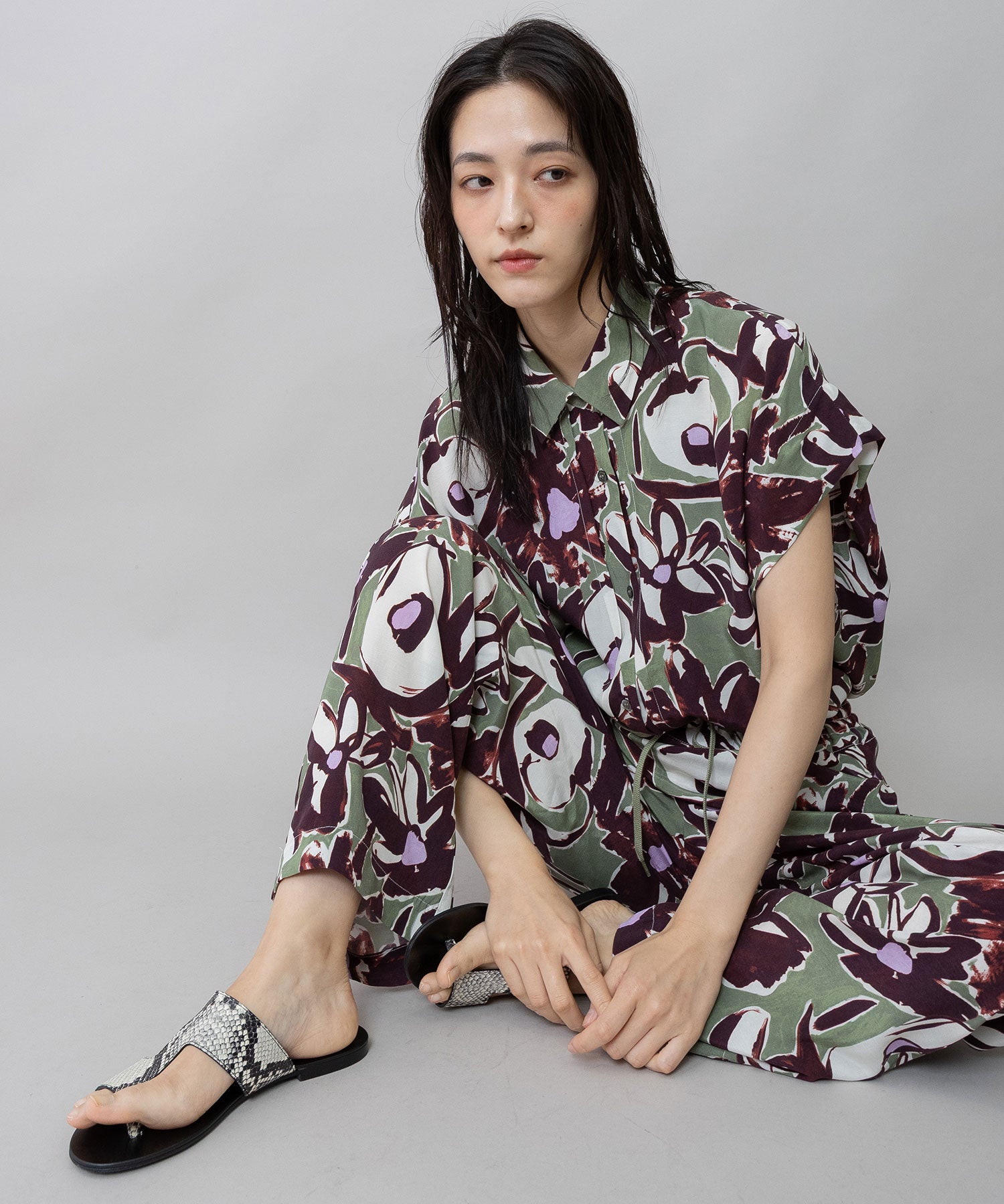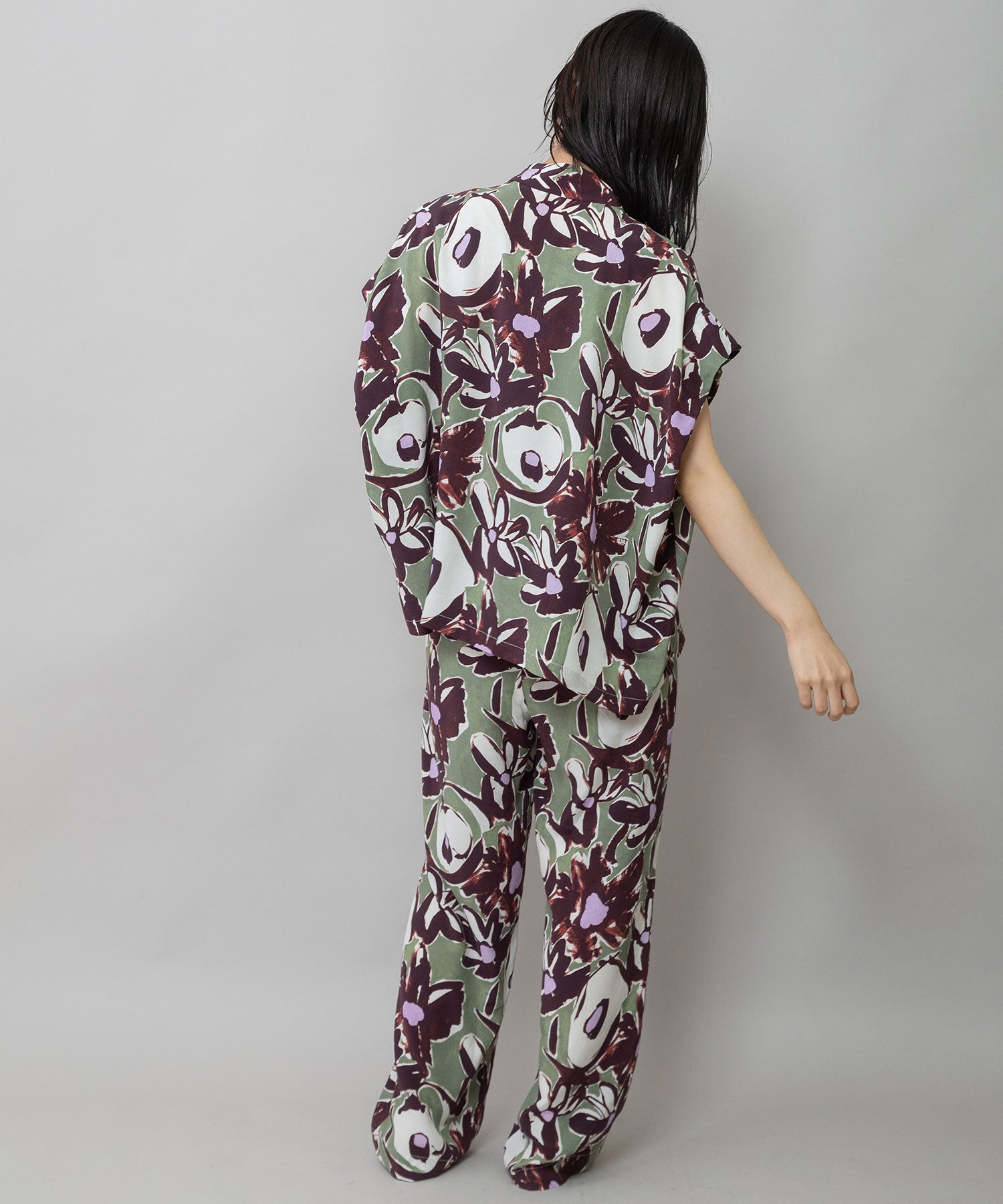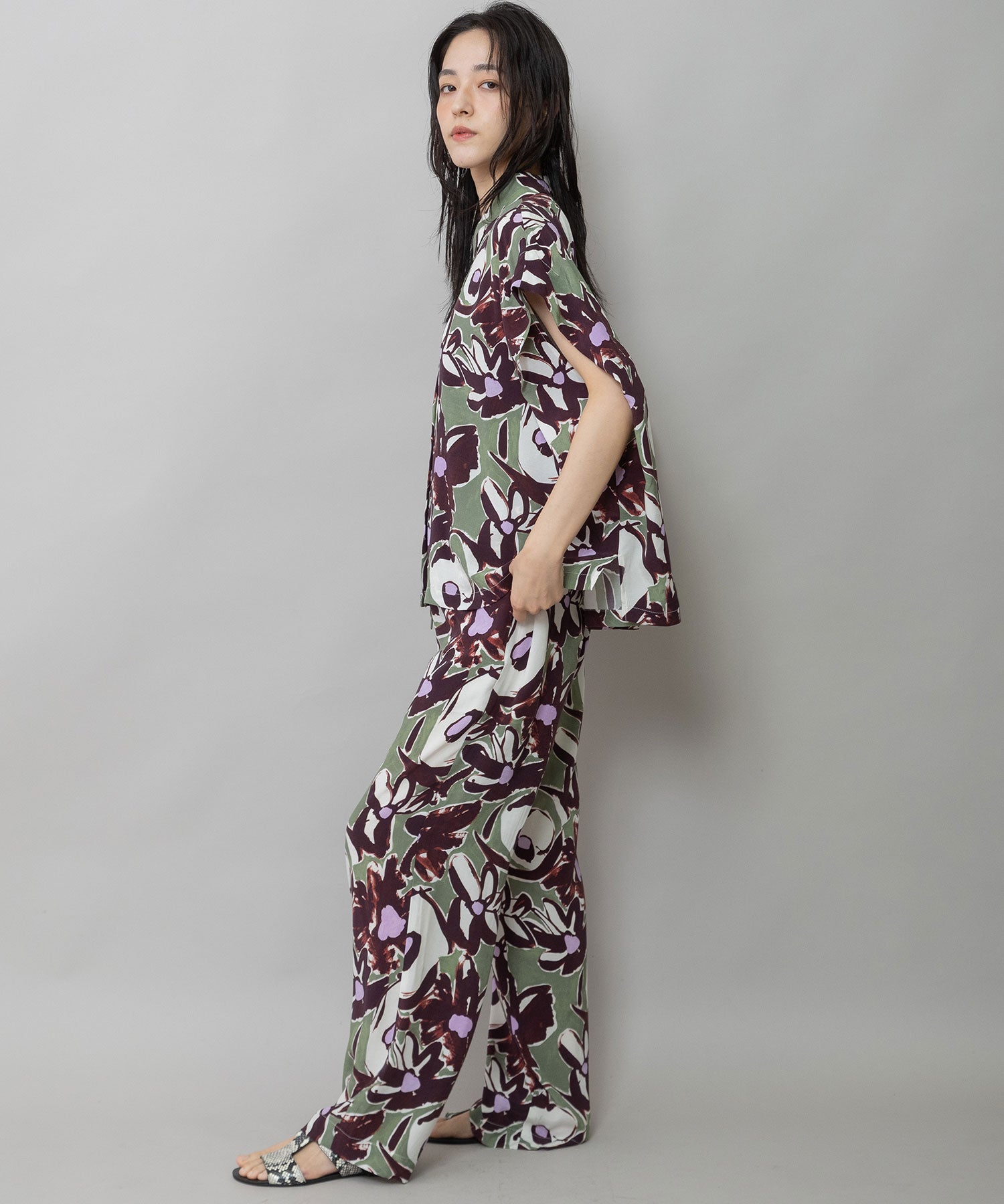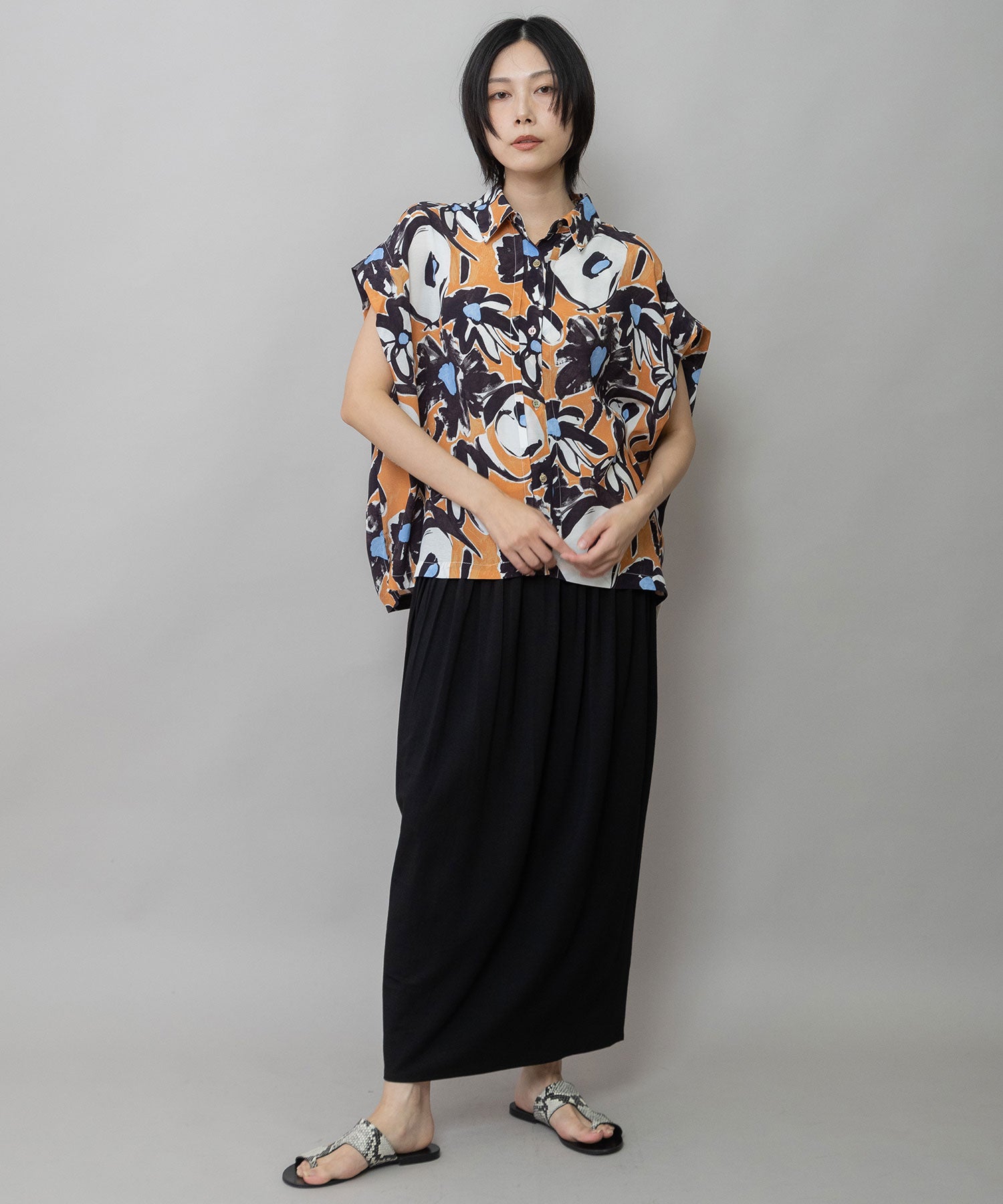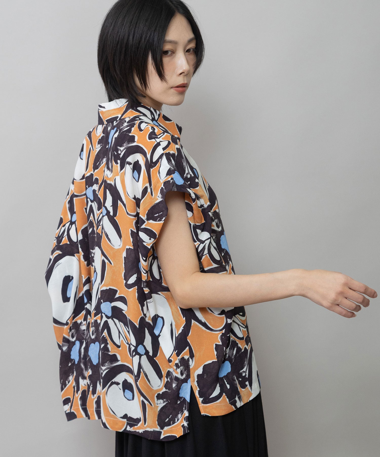 ◆ボリュームがきれいにドレープする大胆なフラワープリントのタックスリーブシャツ◆