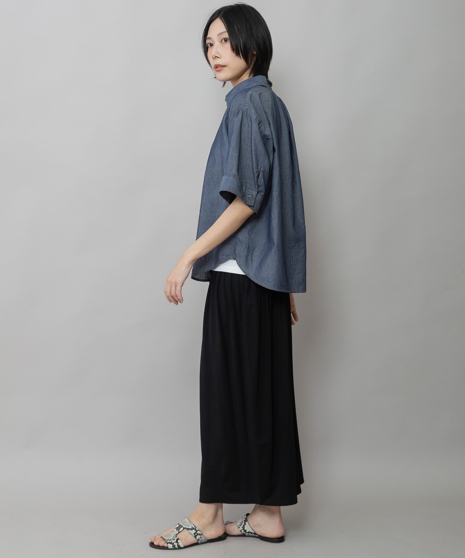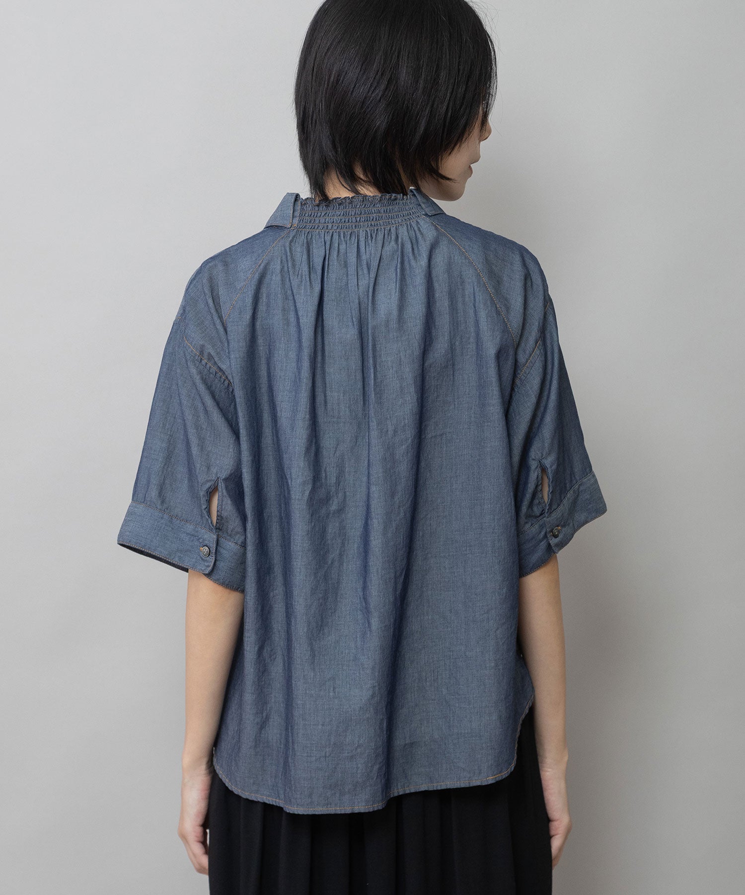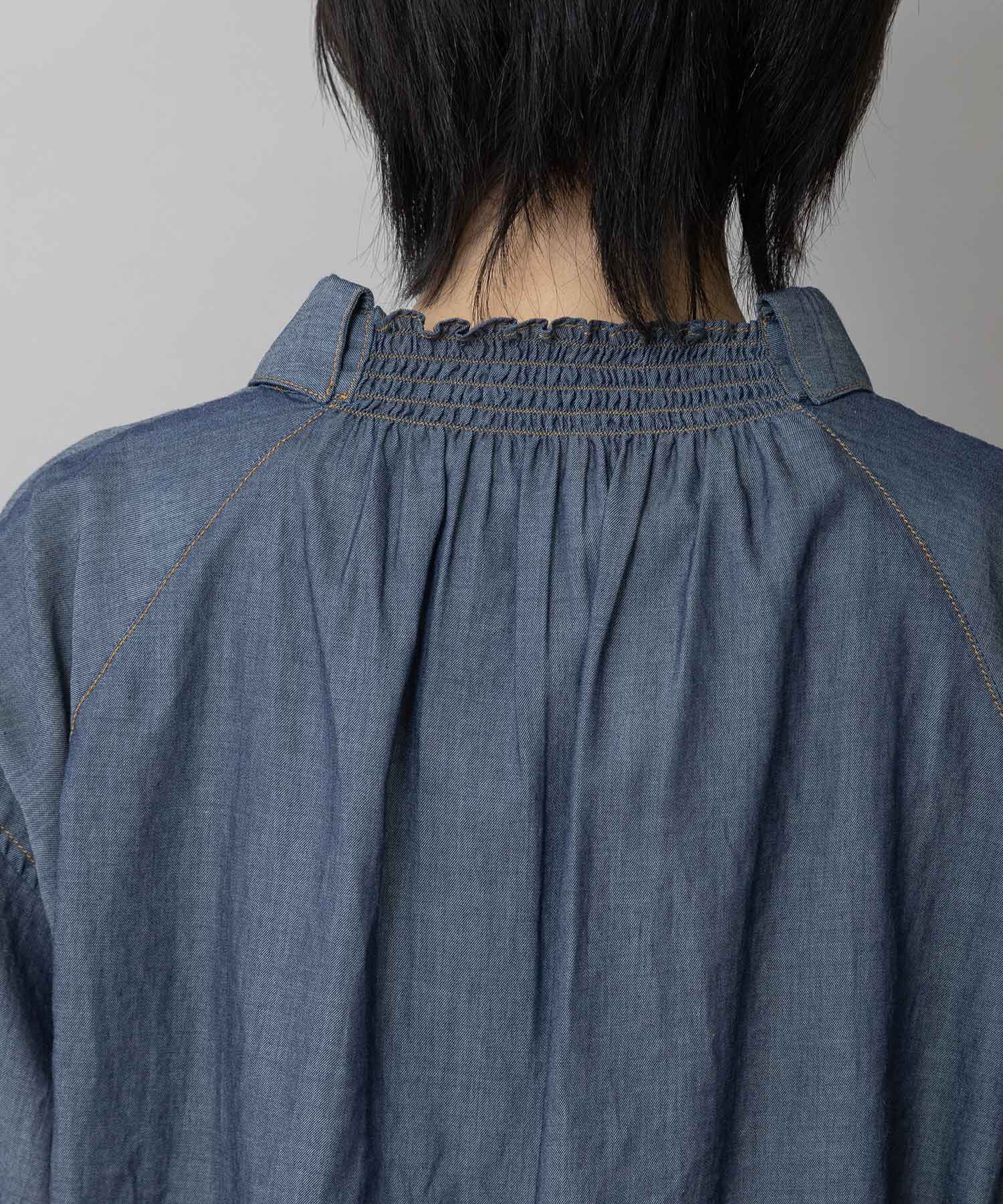 シャツカラーの後ろ衿にゴムシャーリングを施した抜けのある衿まわりがカジュアルなデニムシャツを女性らしい印象に魅せてくれます。