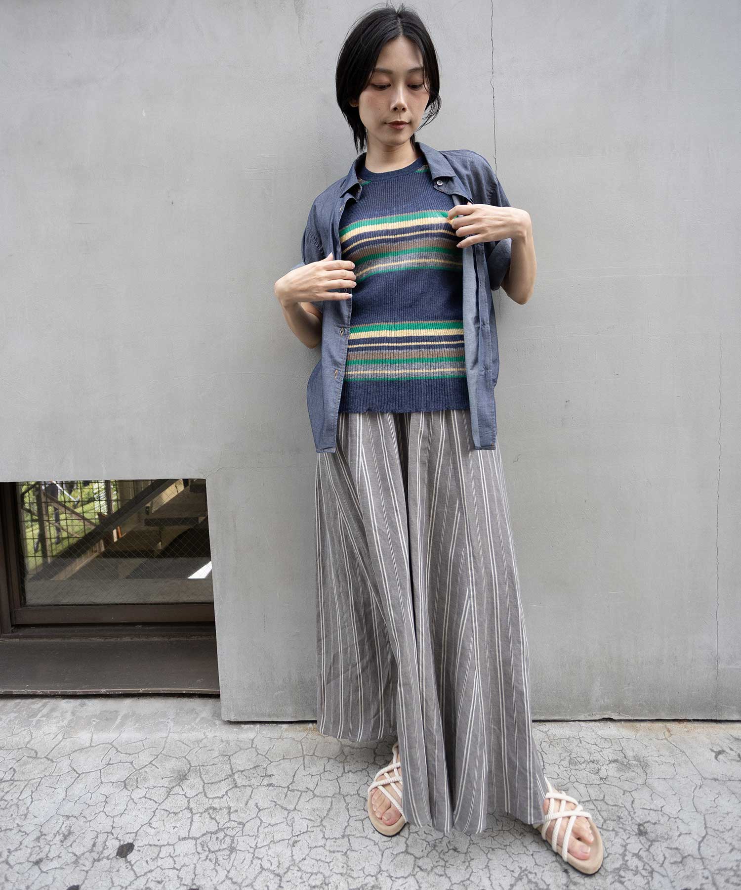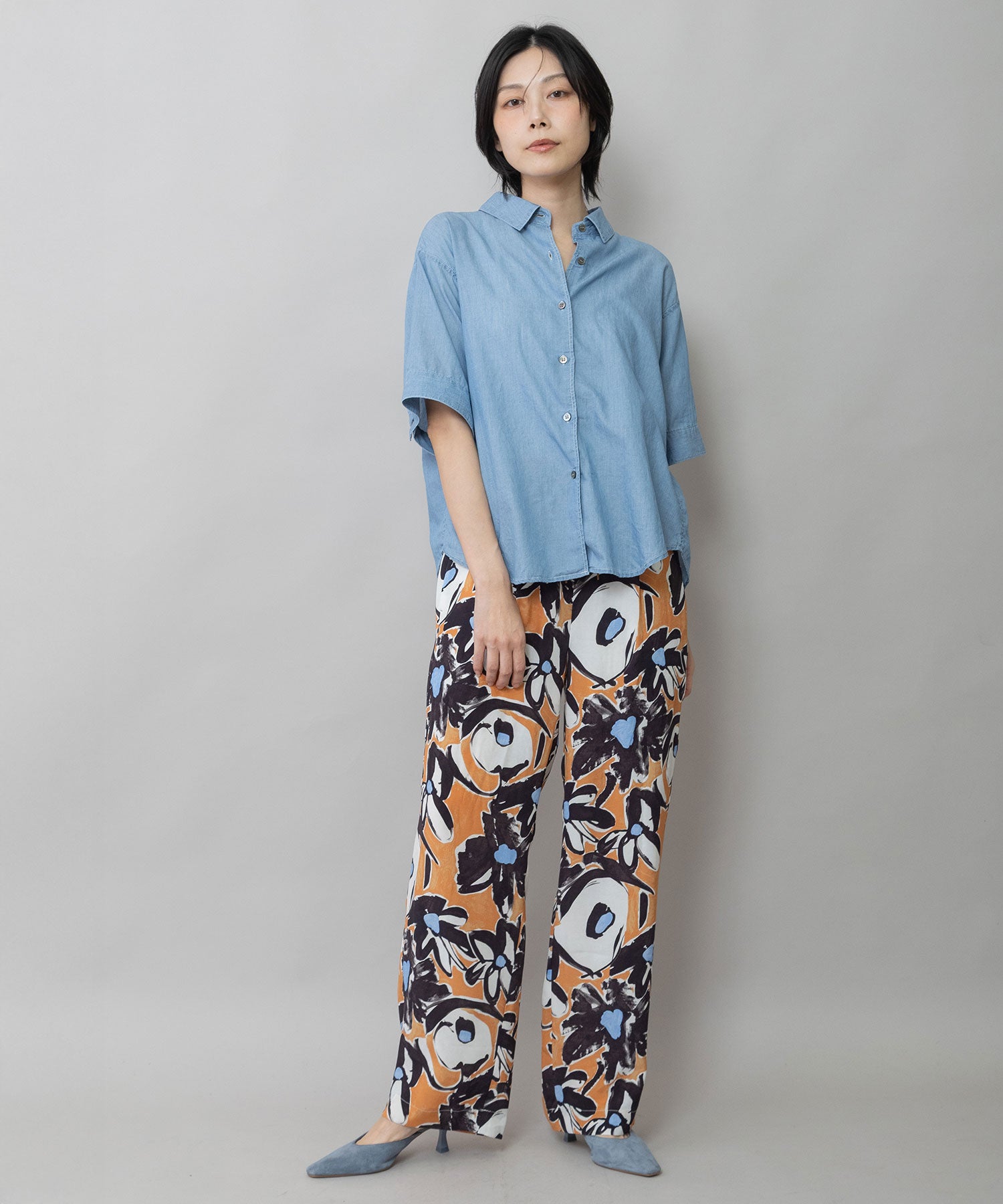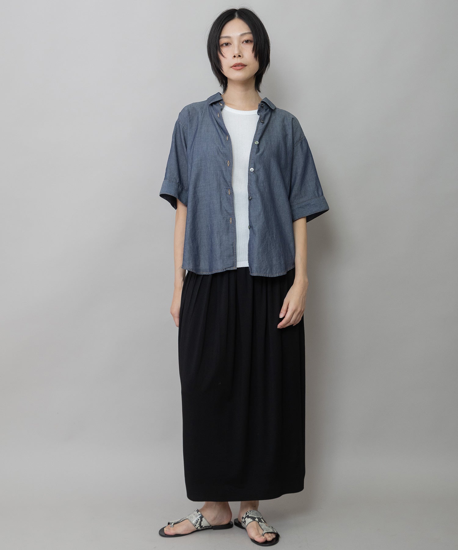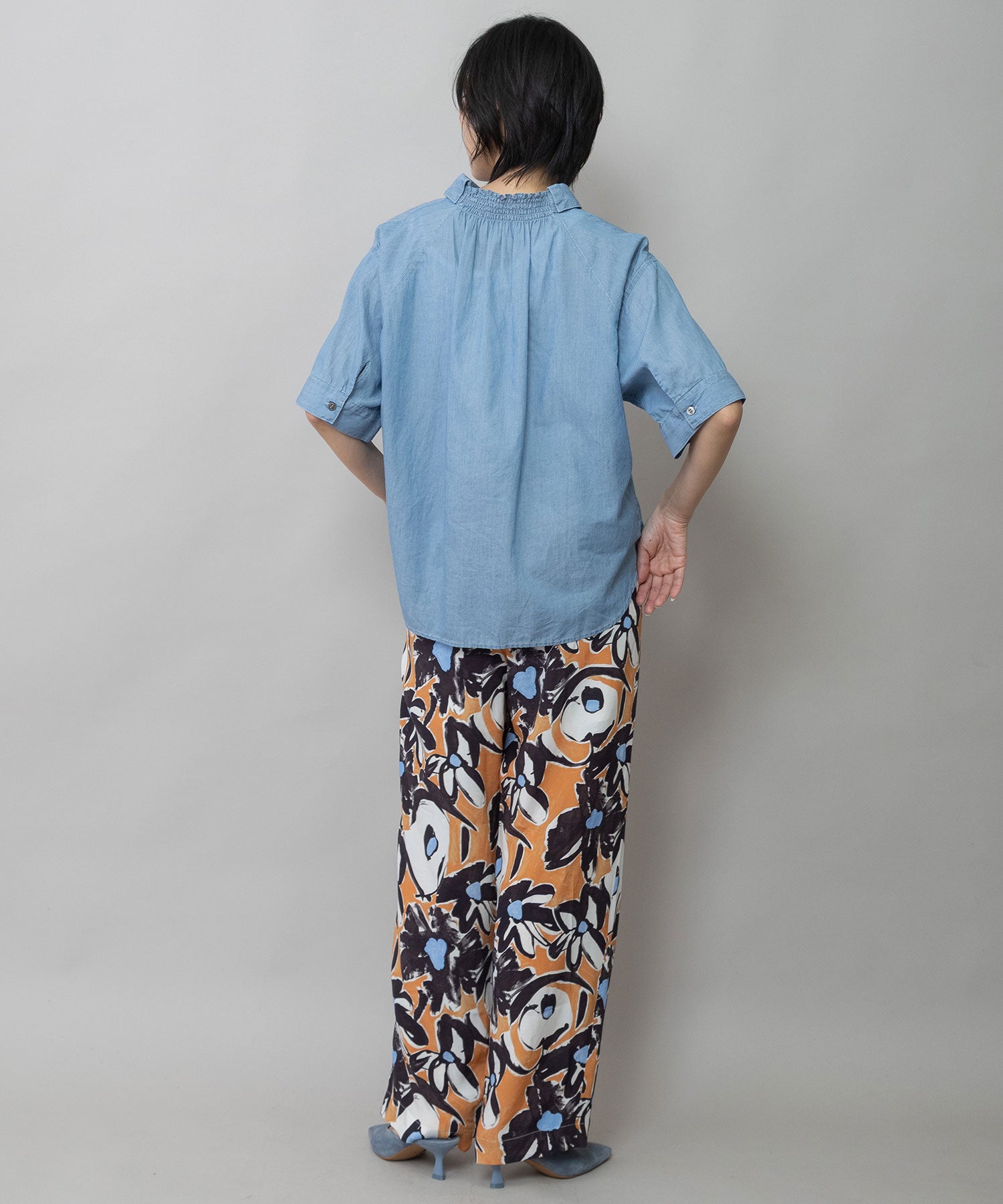 シャツカラーの後ろ衿にゴムシャーリングを施した抜けのある衿まわりがカジュアルなデニムシャツを女性らしい印象に魅せてくれます。