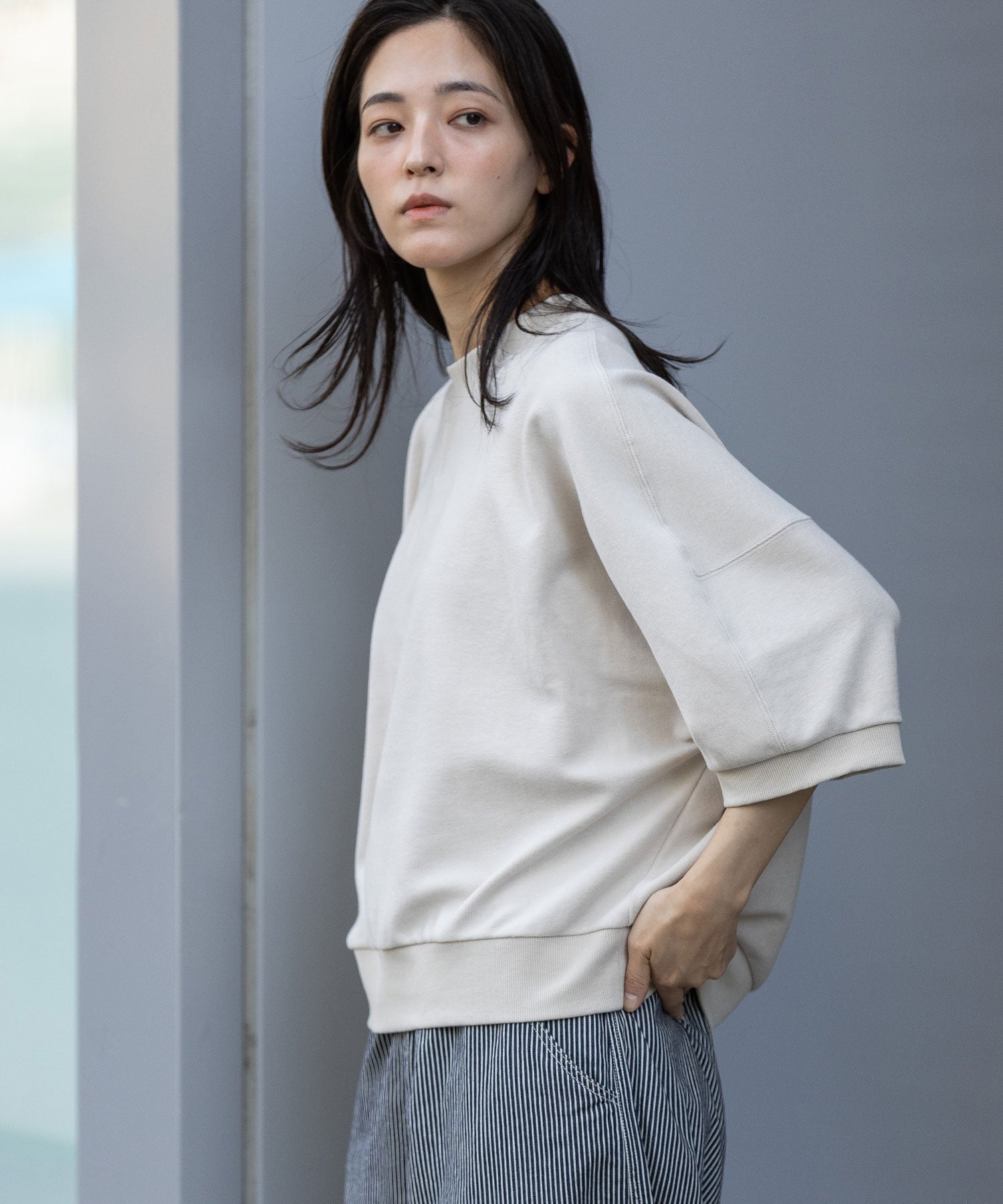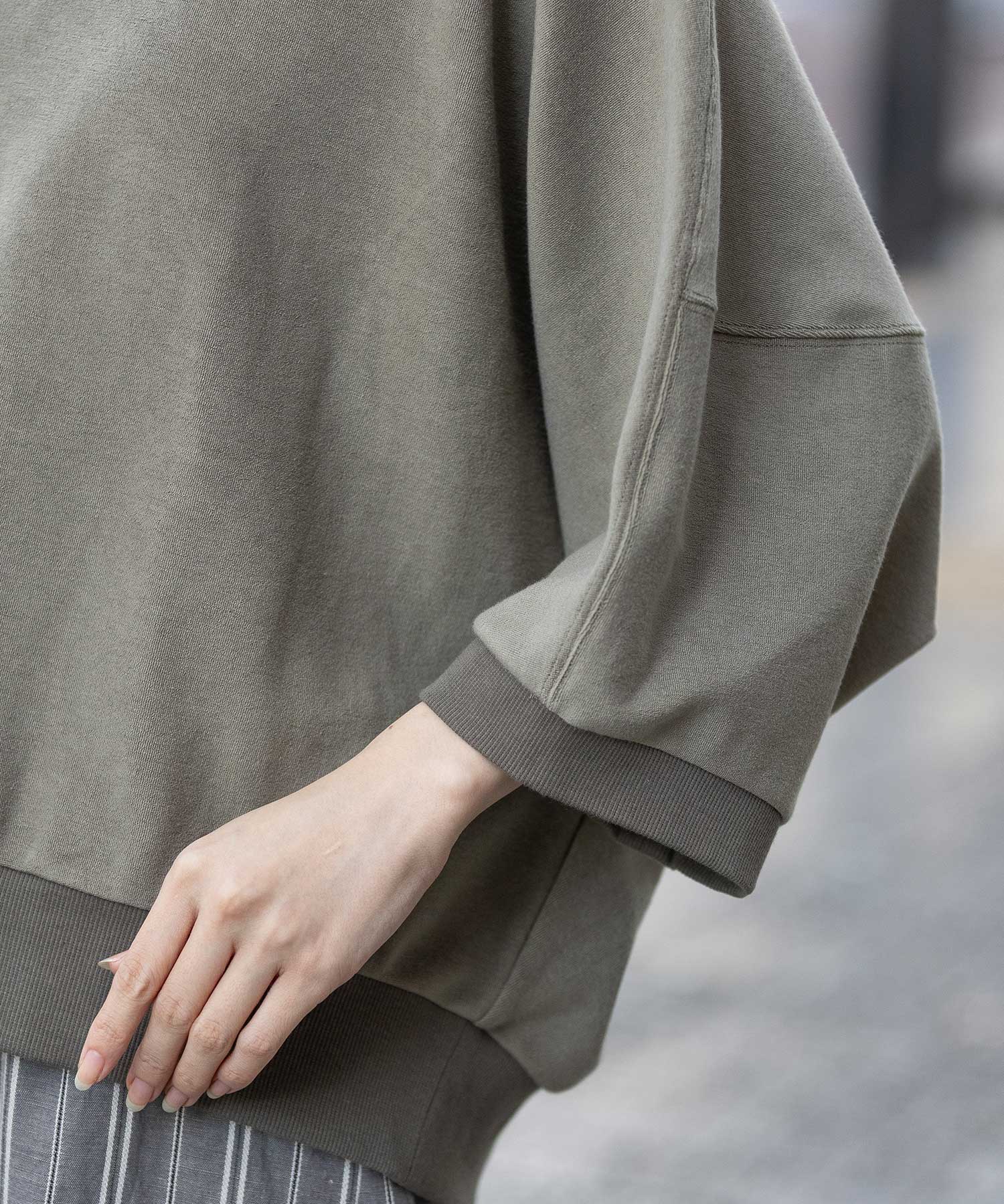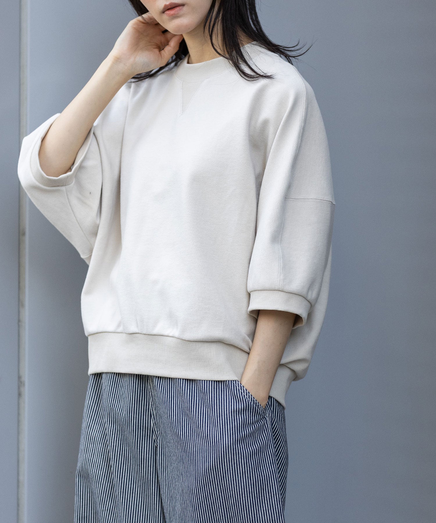 カマ底をたっぷりと深めにとったドルマンスリーブで、ゆったりとしたサイズでリラックス感のあるムードに。