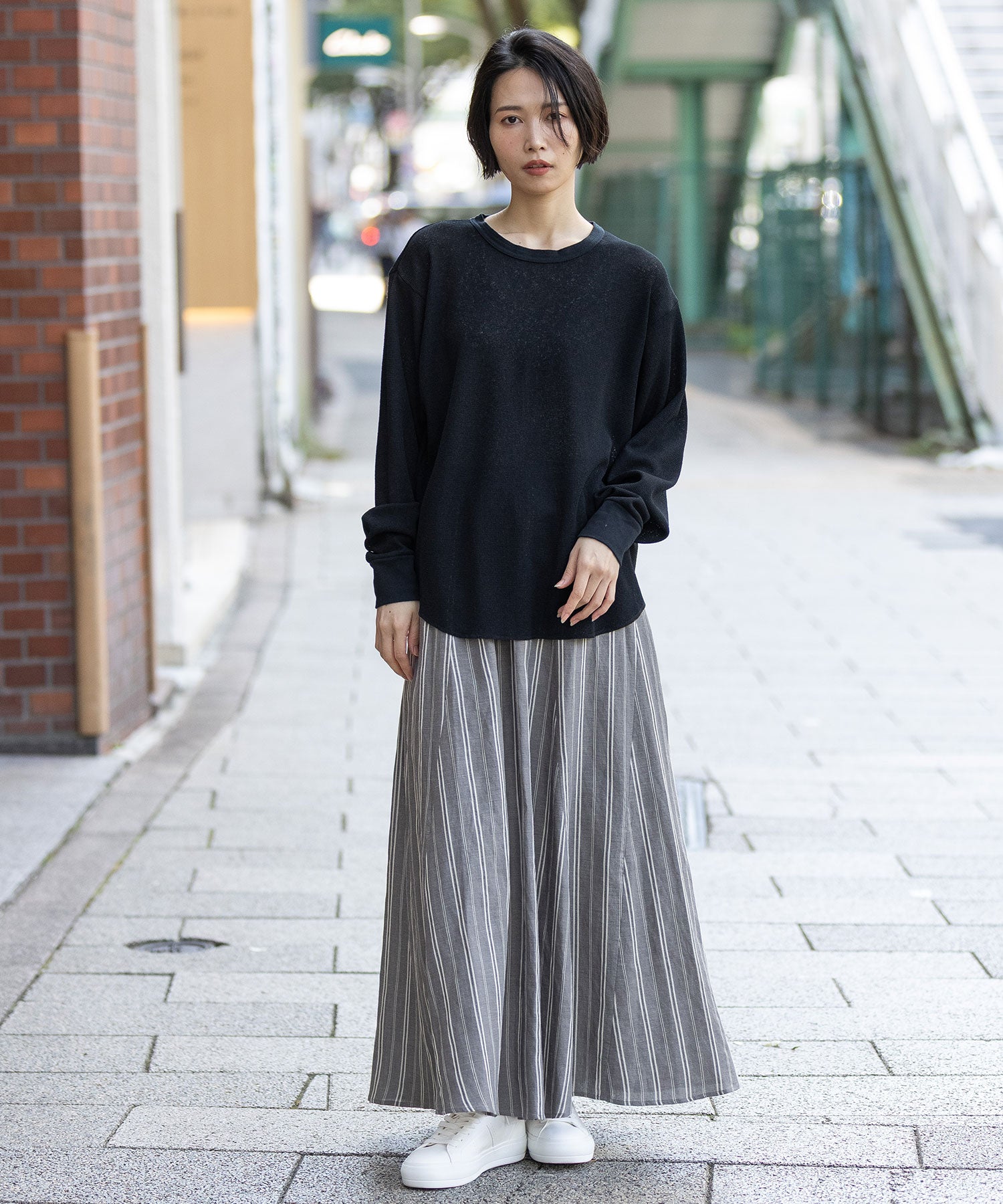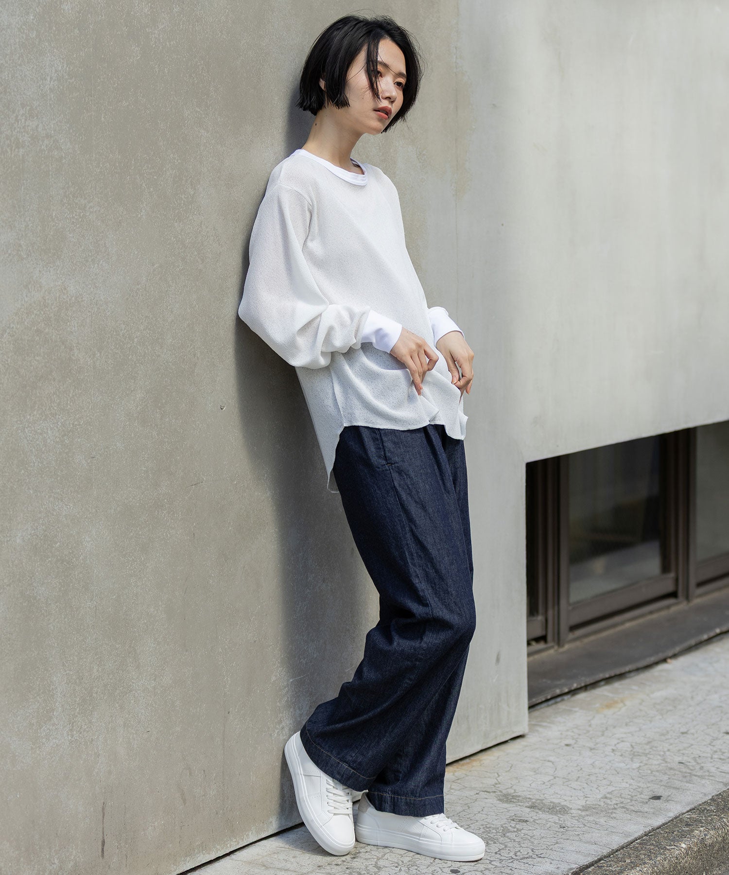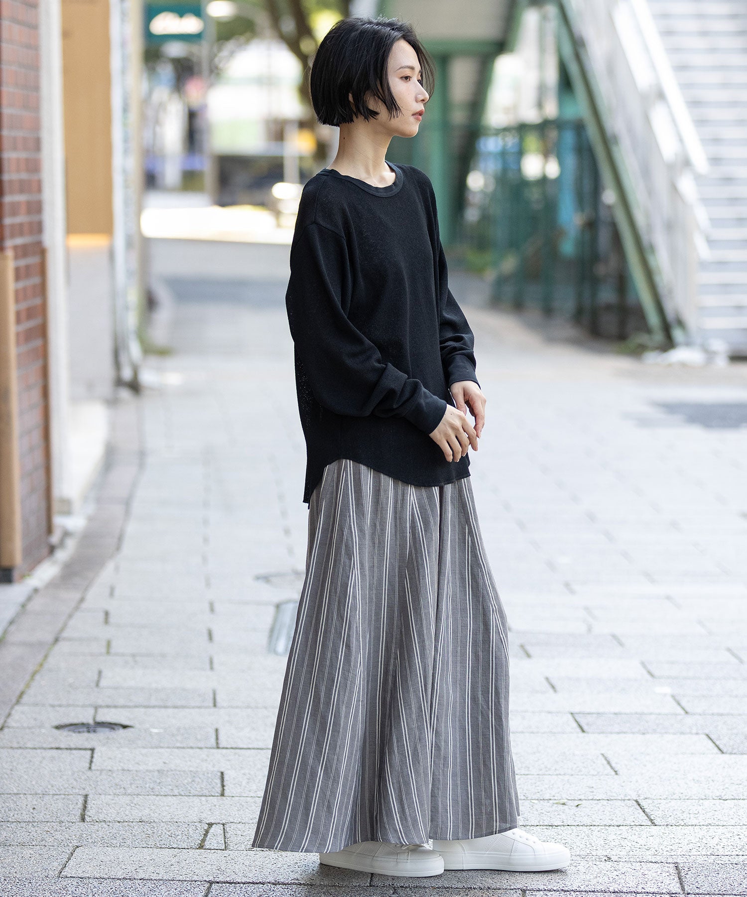 フロントはシンプルに、バックスタイルにボタン開きのデザインを持ってくる事で、抜け感ある大人カジュアルな雰囲気に。