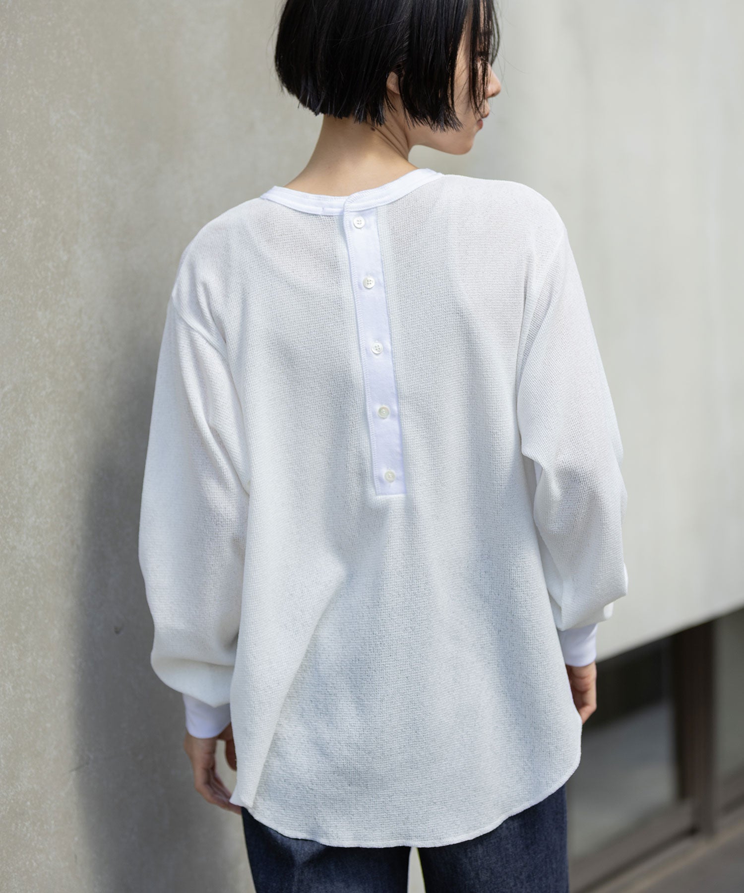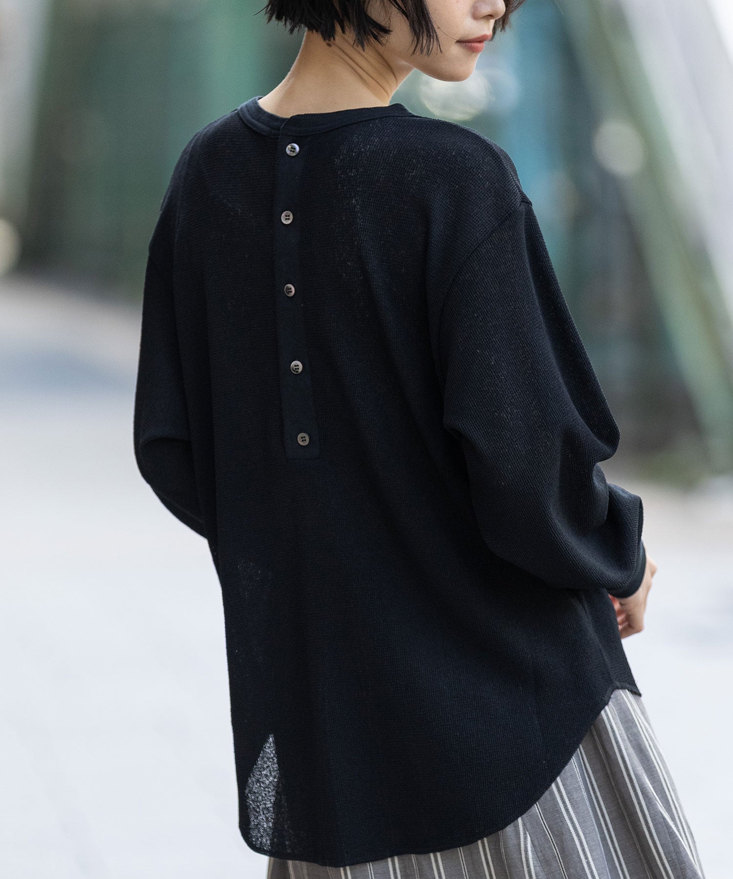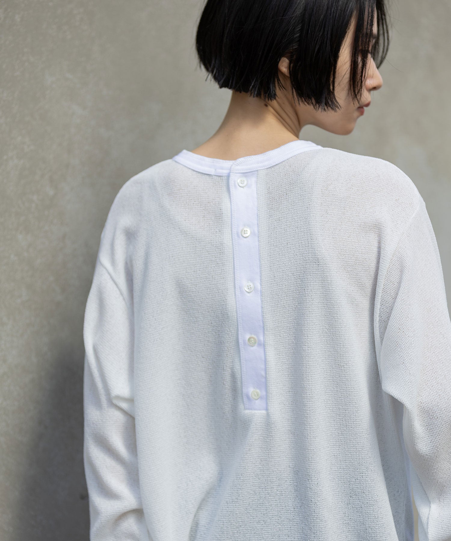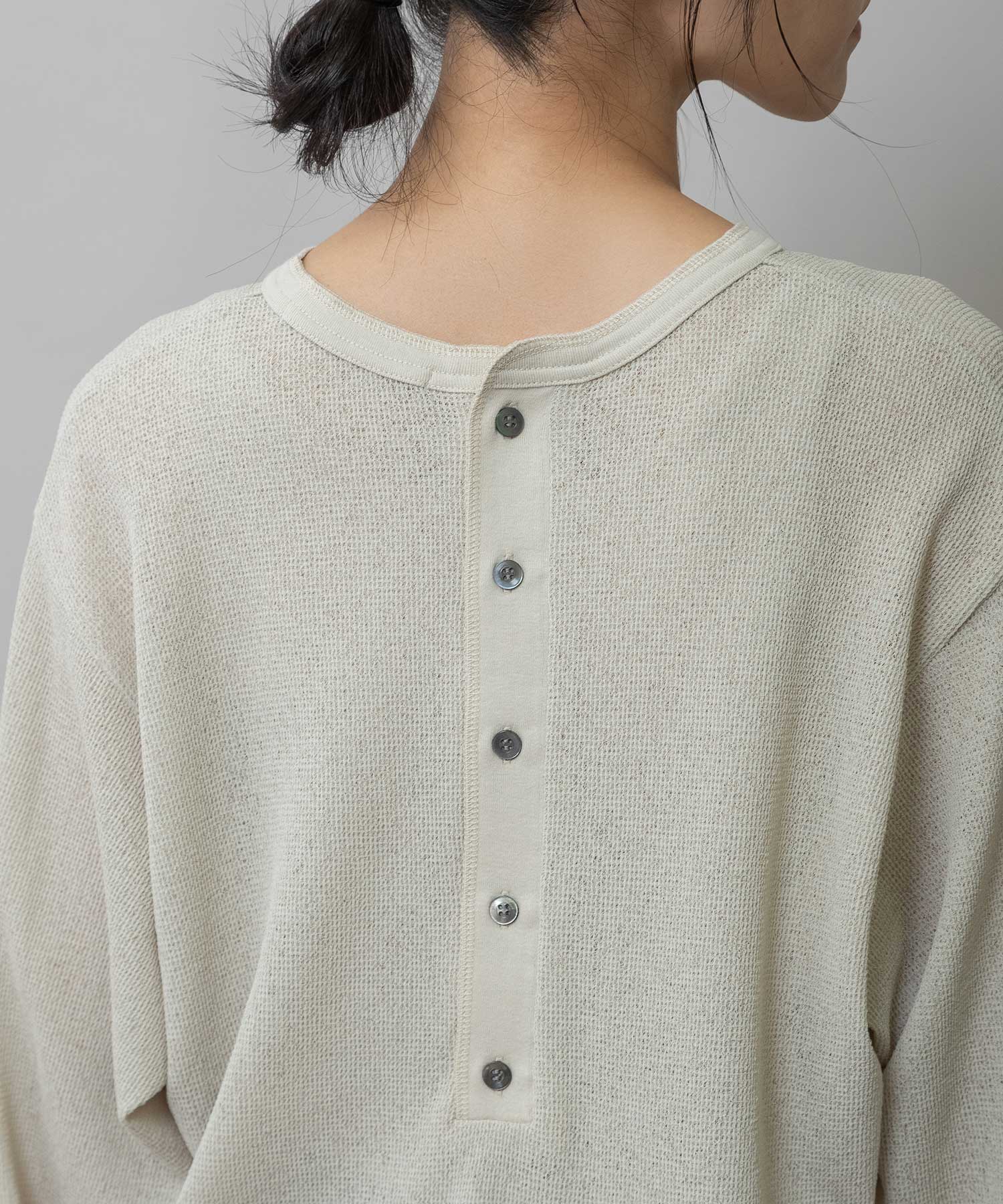 ◆シアーな質感とワッフルの表面感が新しいバックヘンリーネックトップス◆