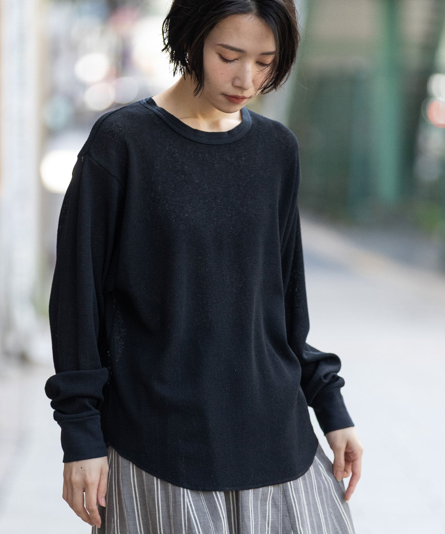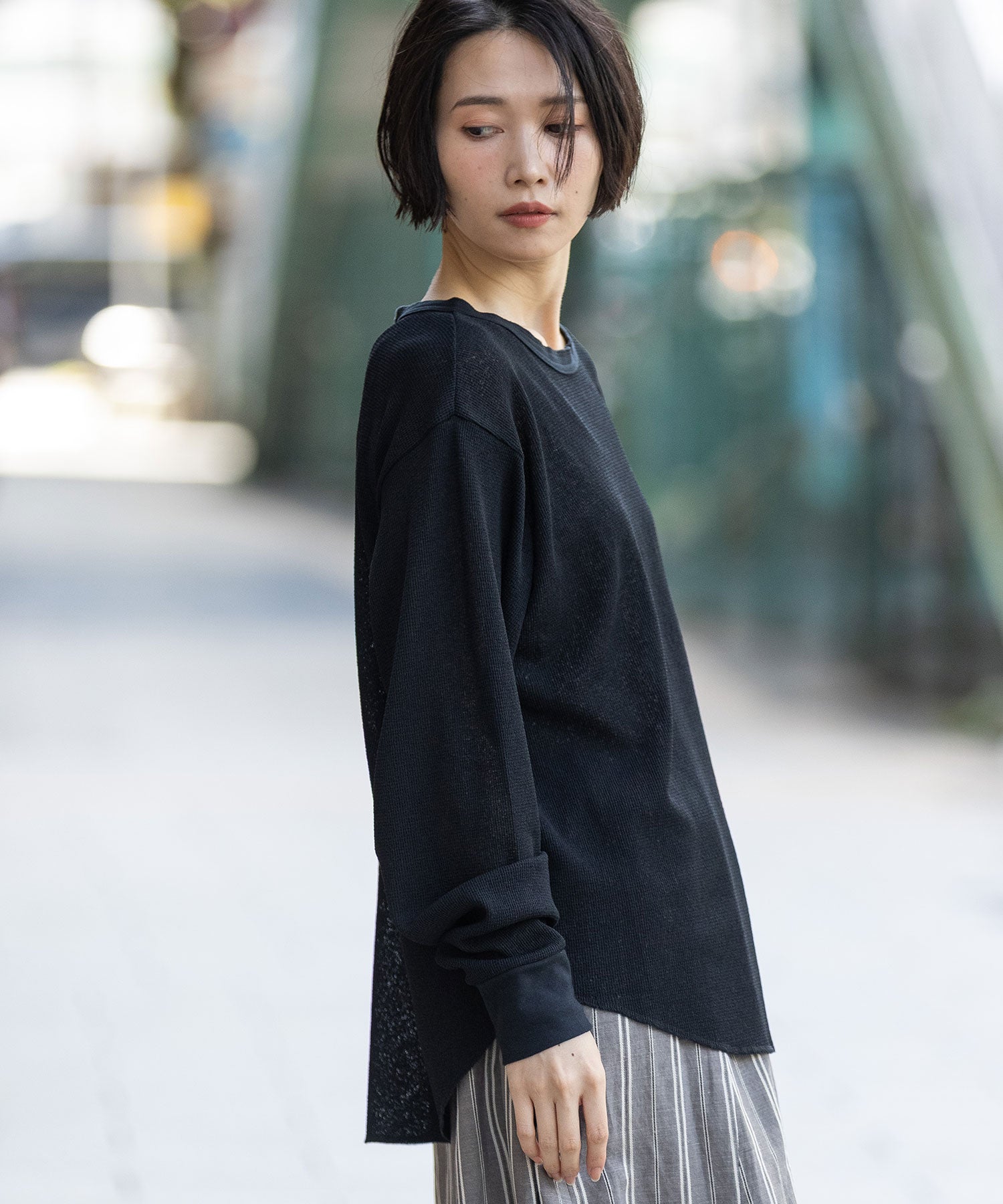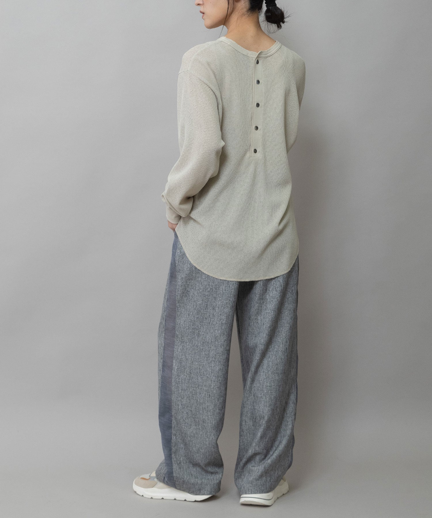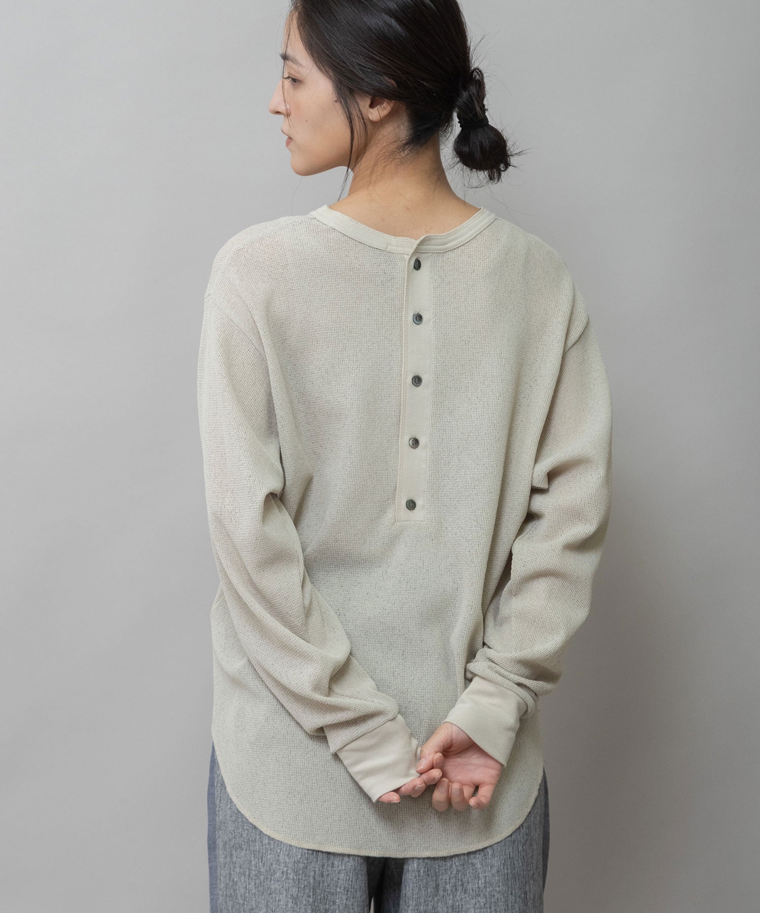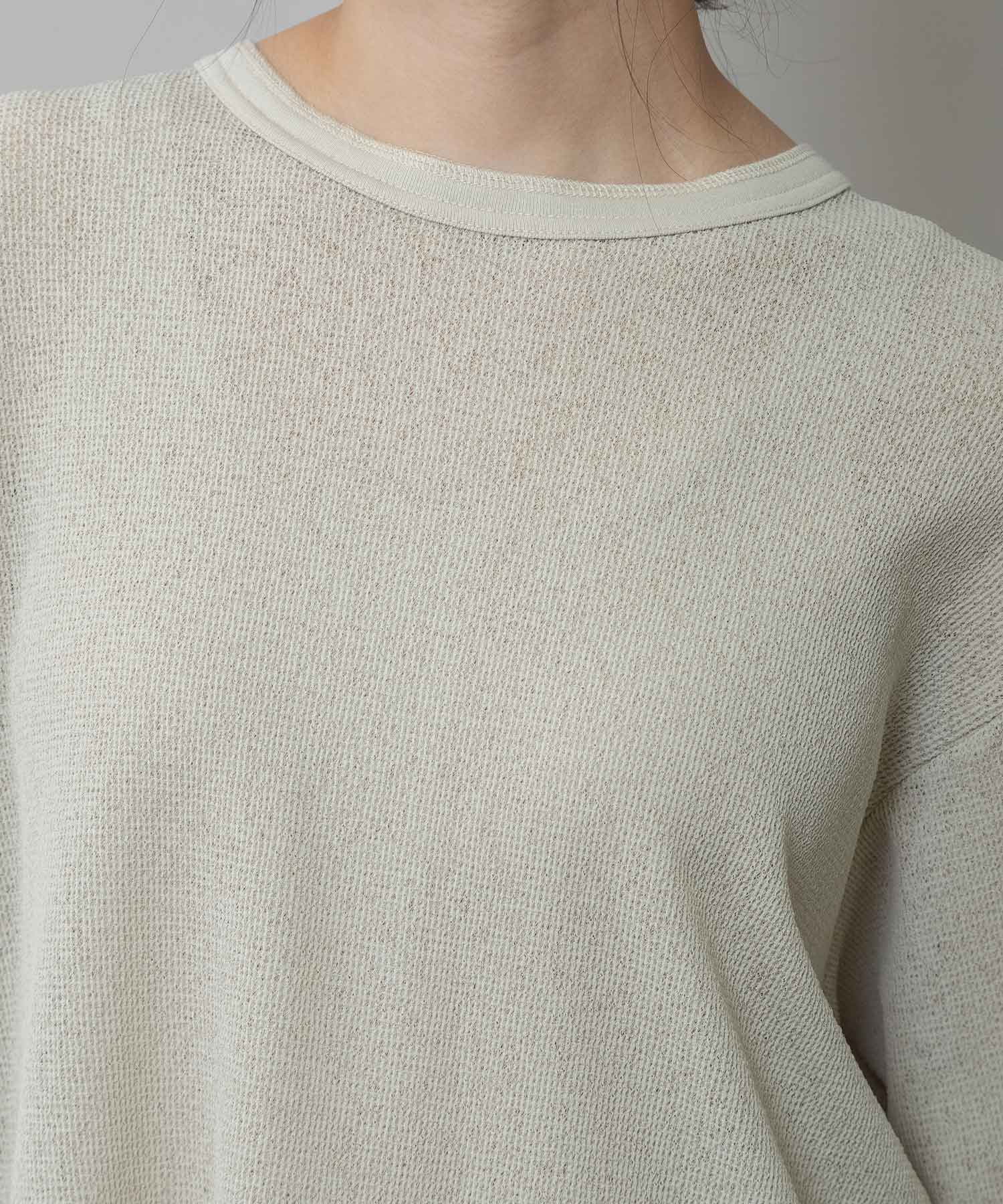 ◆シアーな質感とワッフルの表面感が新しいバックヘンリーネックトップス◆
