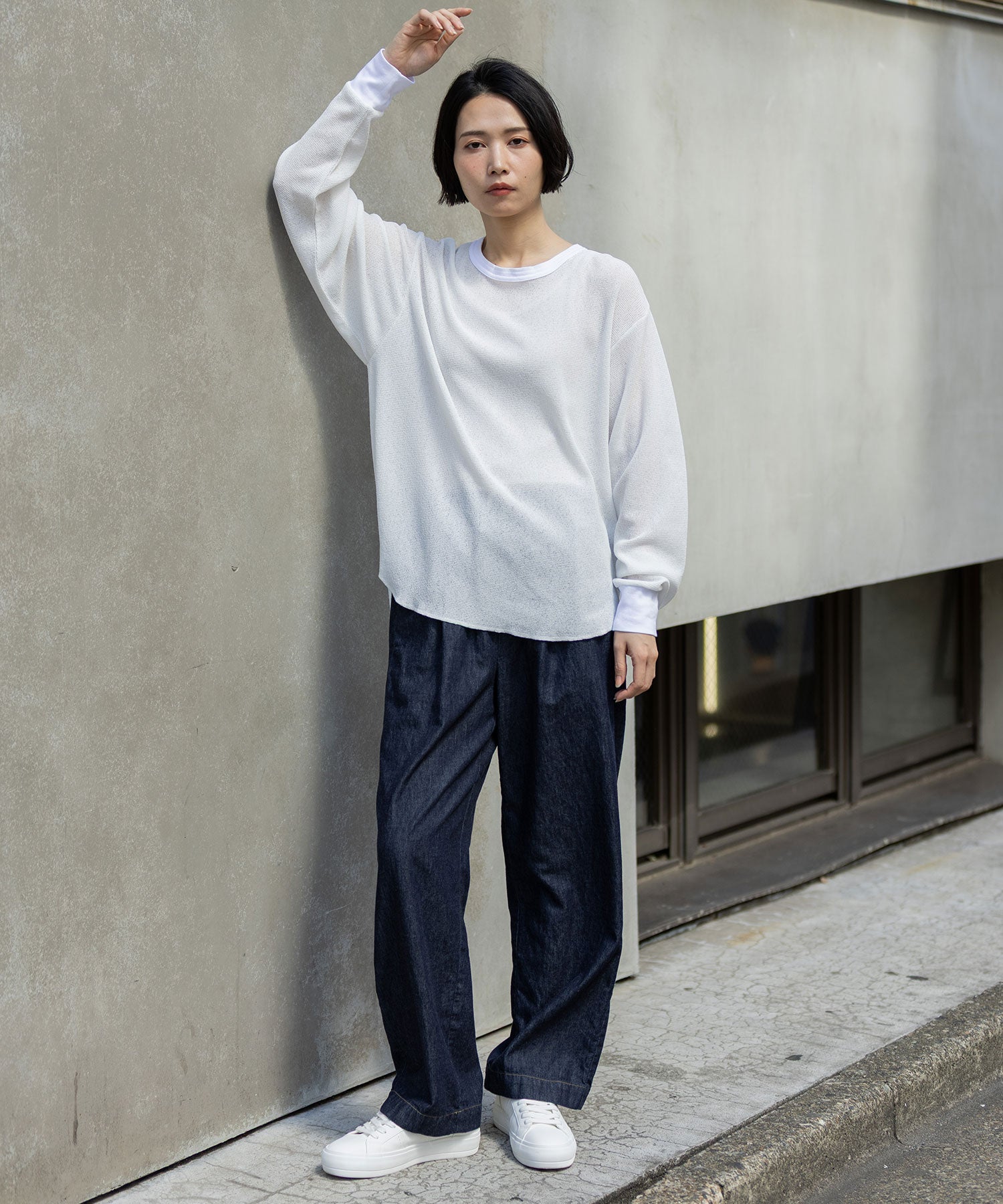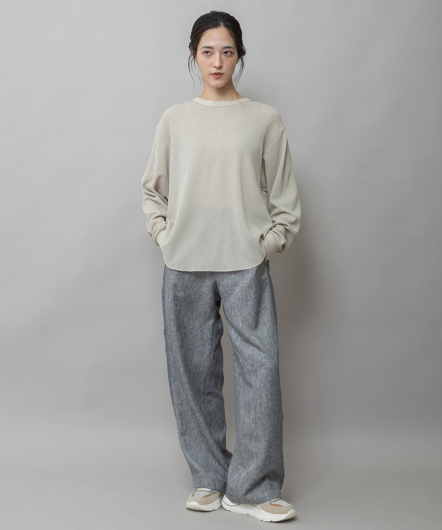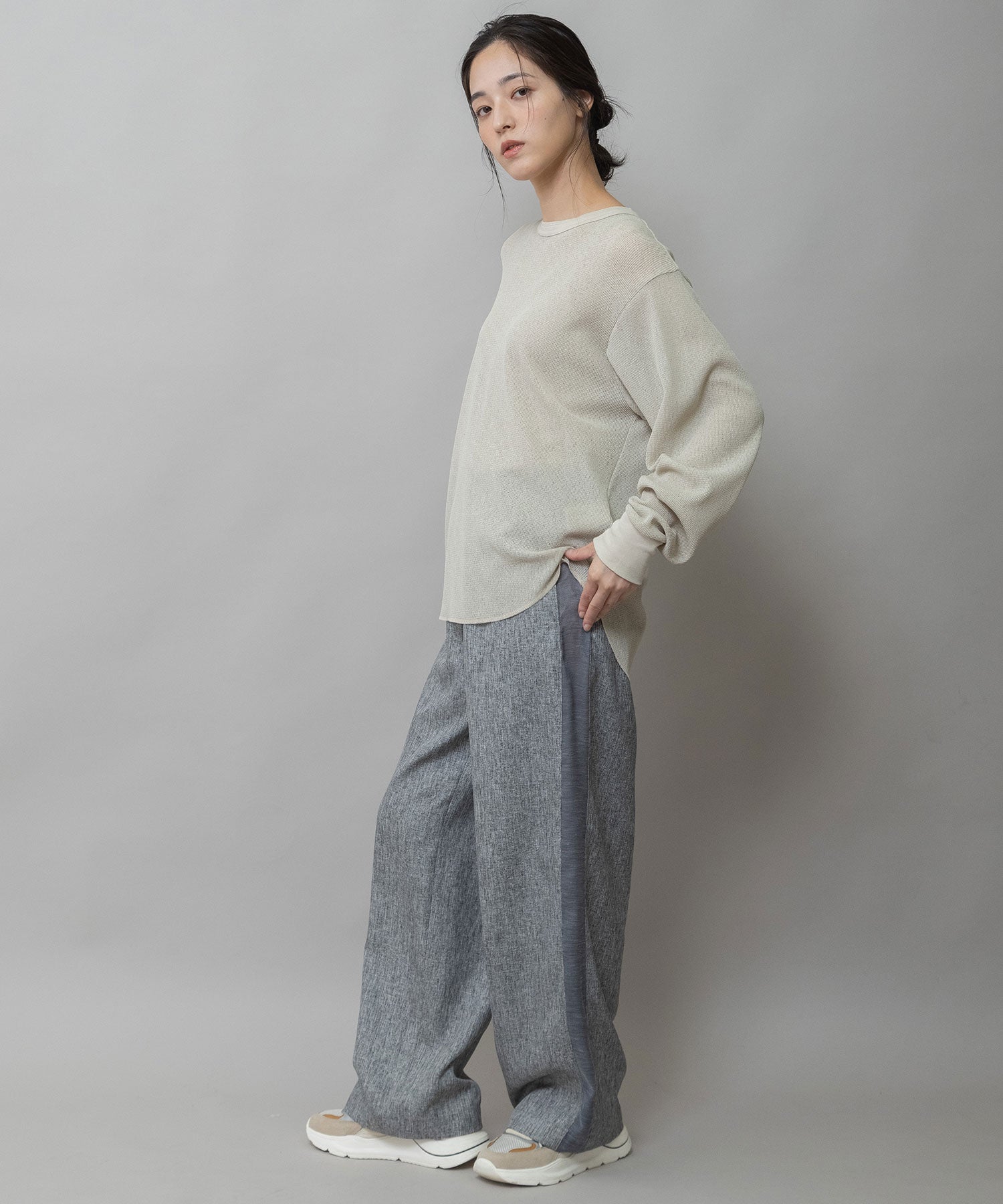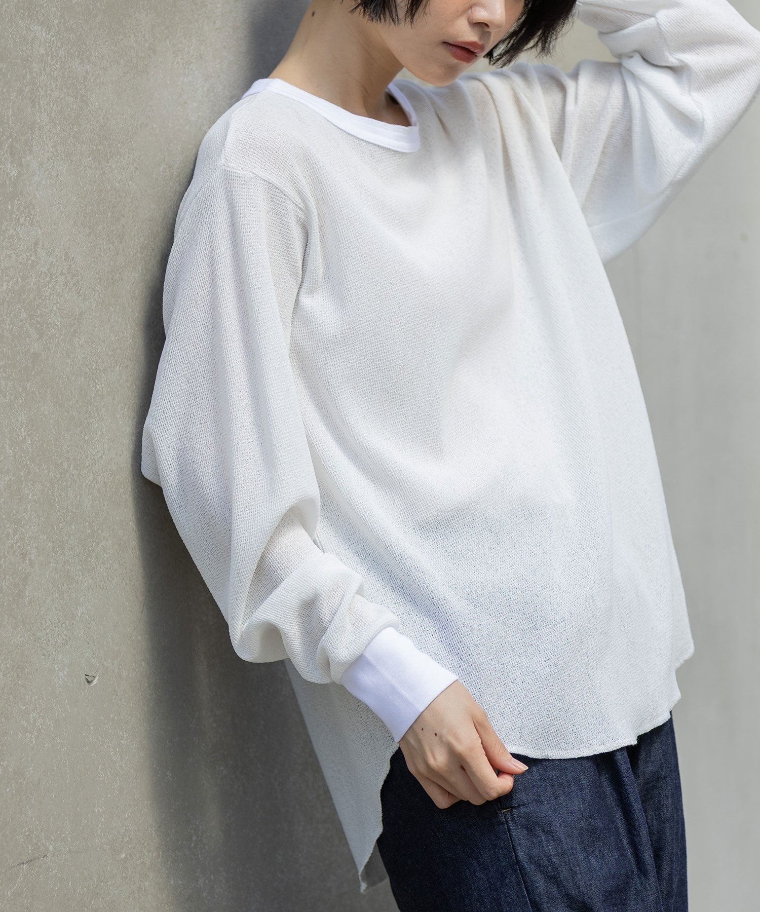素材が軽くて柔らかいので、ジャケットのインナーに使ったり、一枚で着たりインしたり、様々な表情が楽しめるアイテムです。