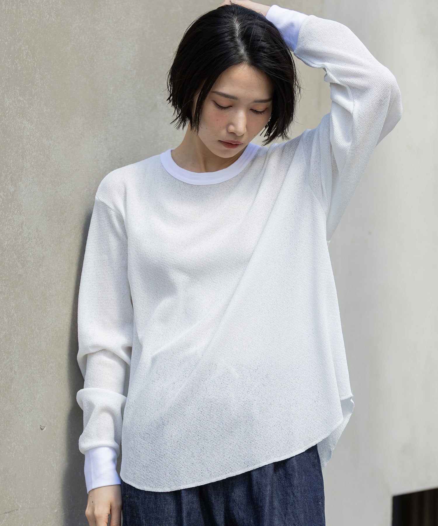 トラディショナルなワッフル素材をシアーで表現したトレンド感ある素材が魅力の、バックヘンリーネックロングスリーブトップス。