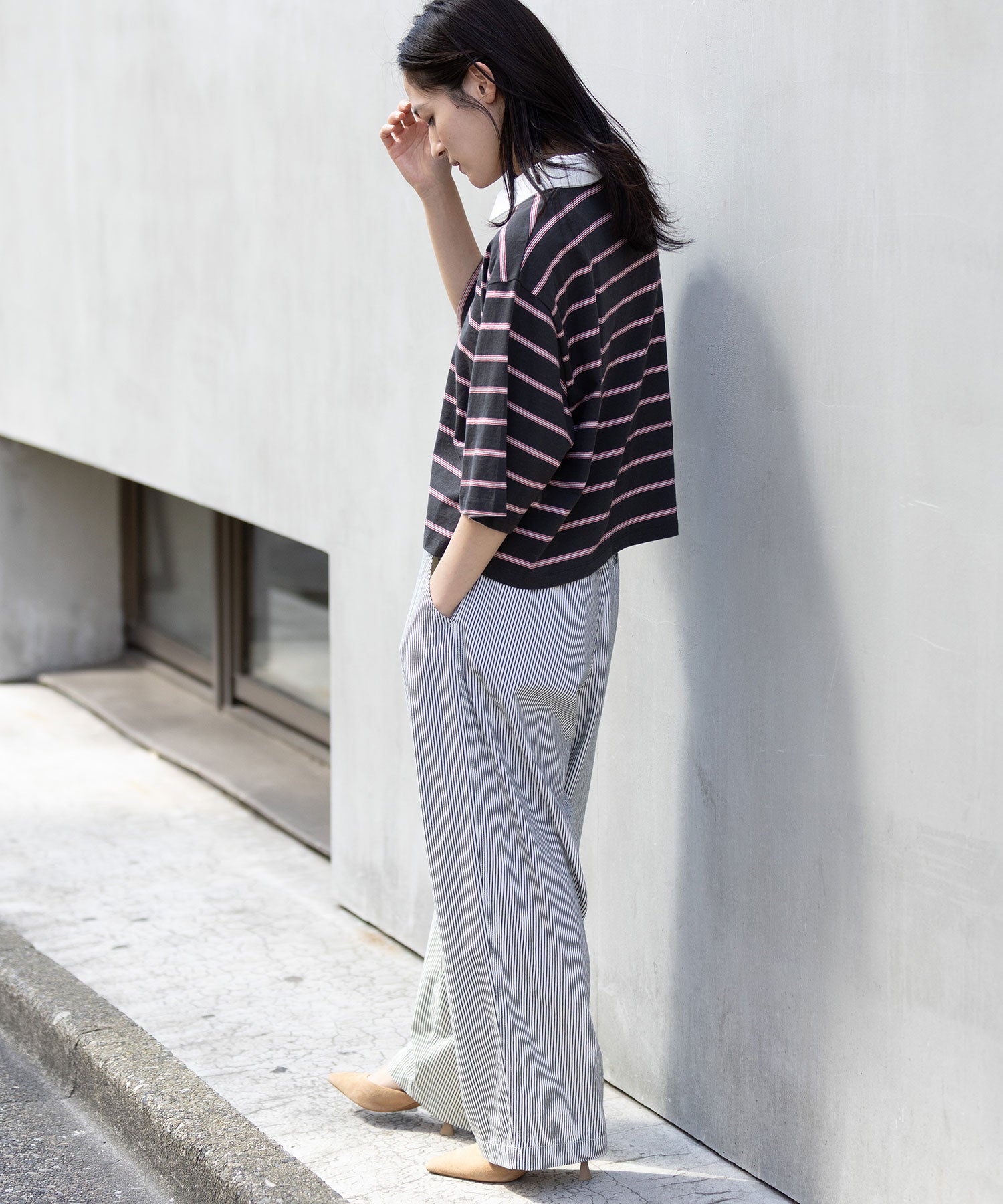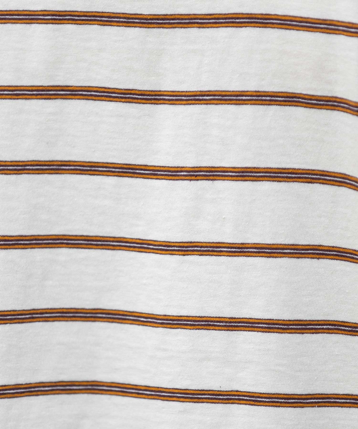 細めボーダー×ボーダー間が広めなので、こなれた雰囲気に。オールドコットならではのヴィンテージ感、粗野でナチュラルな風合いながら、薄手でしなやかな天竺組織で、きれいな落ち感があり、子供っぽくならず女性らしくもこなせる素材です。