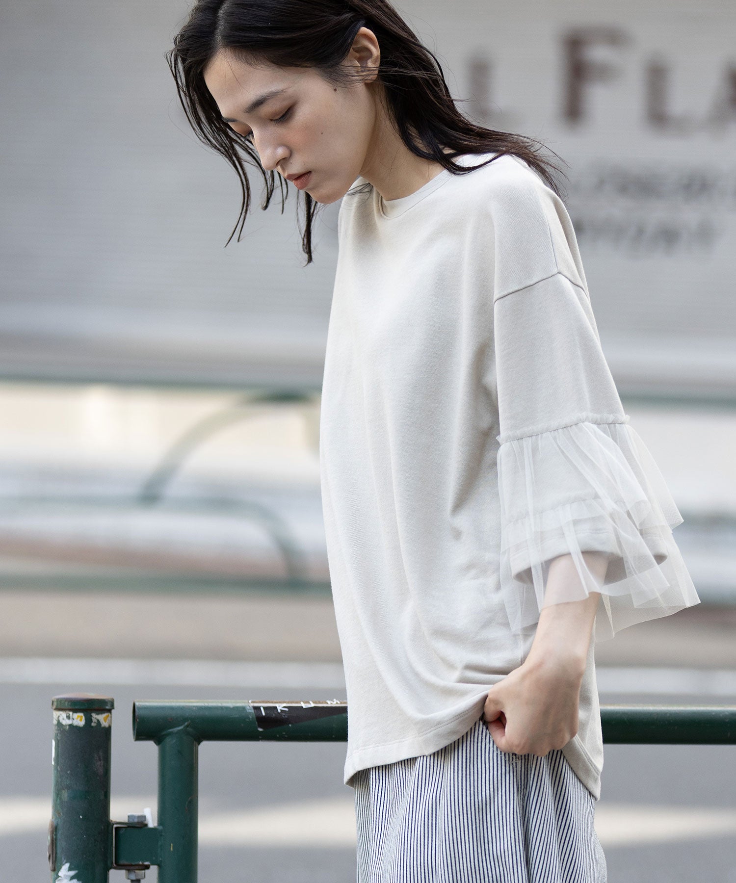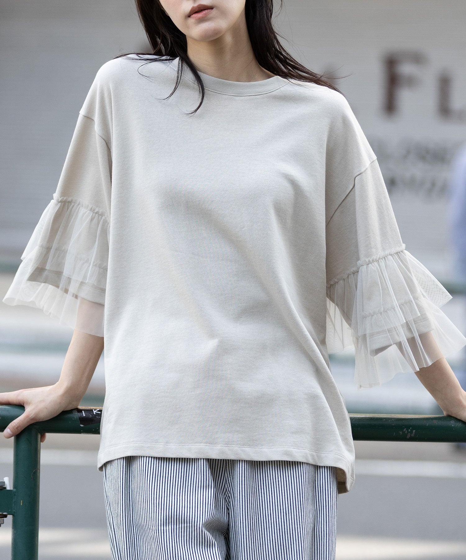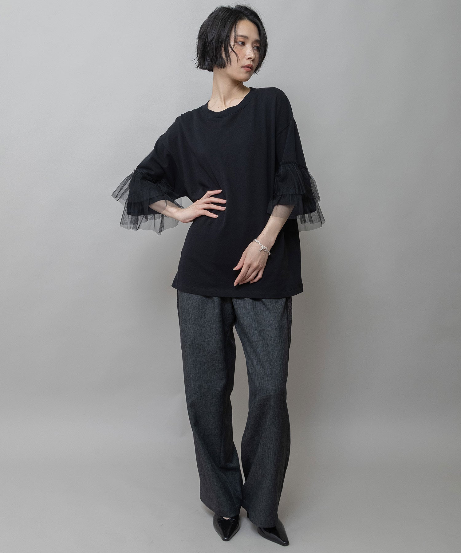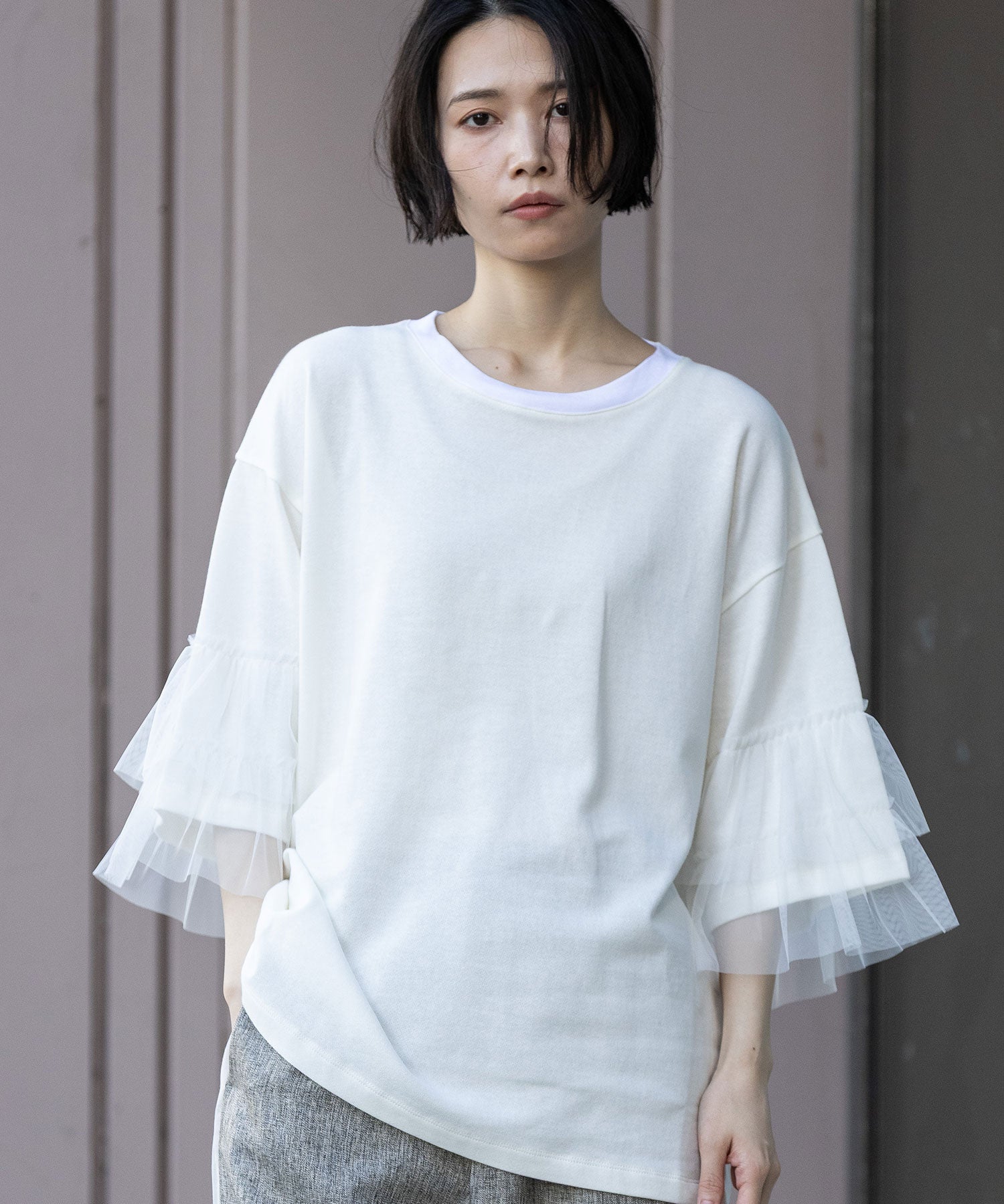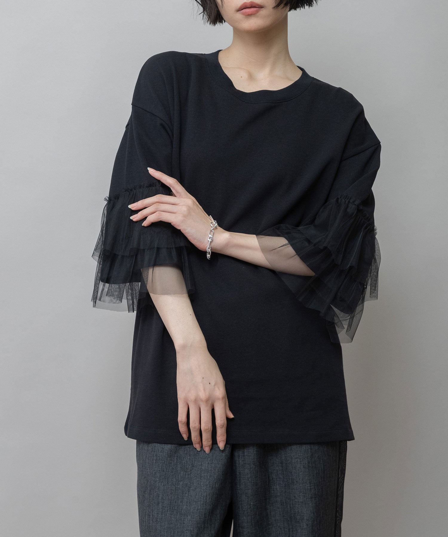 裏毛×チュールラッフルスリーブトップス